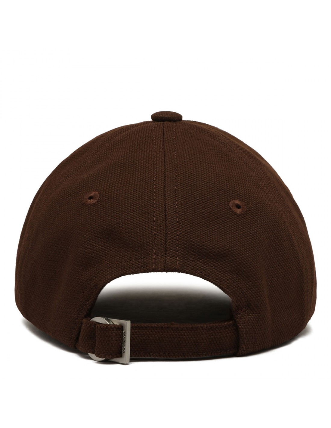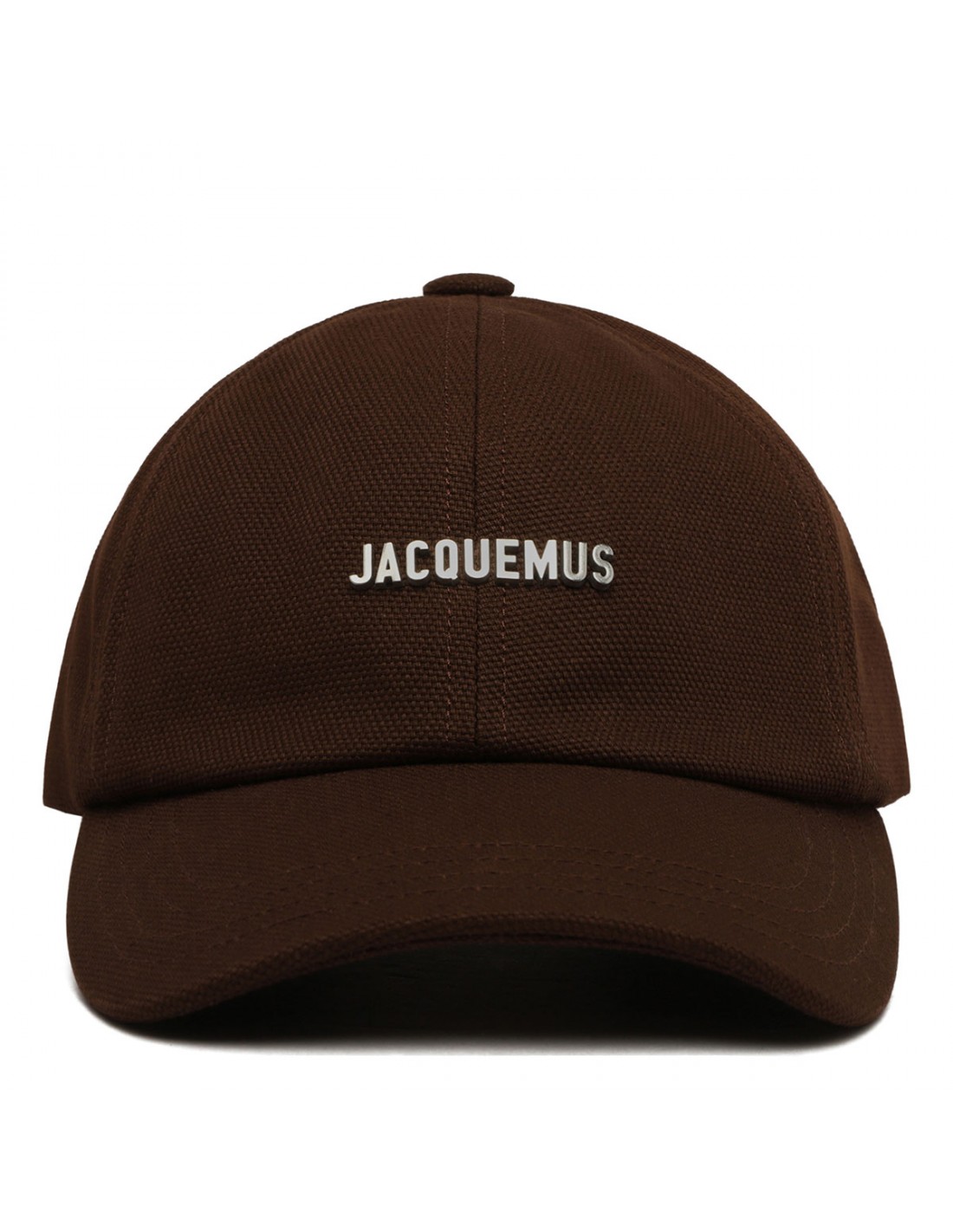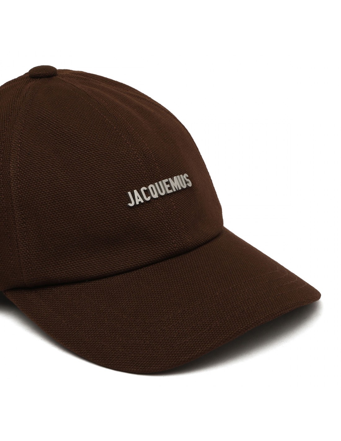 Brown cotton canvas The Gadjo baseball cap from Jacquemus featuring silver metal logo, topstitched short brim, back strap with round square buckle.