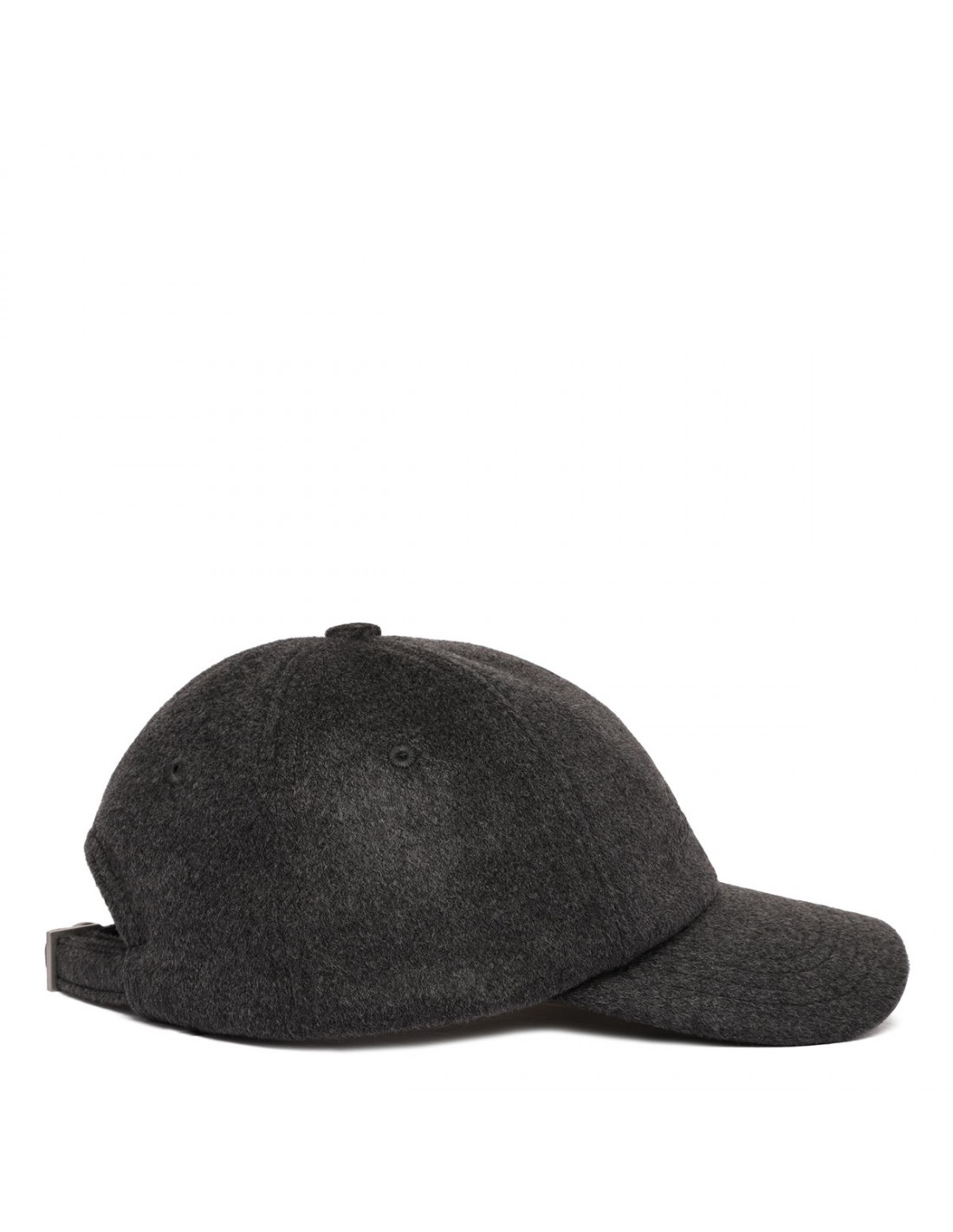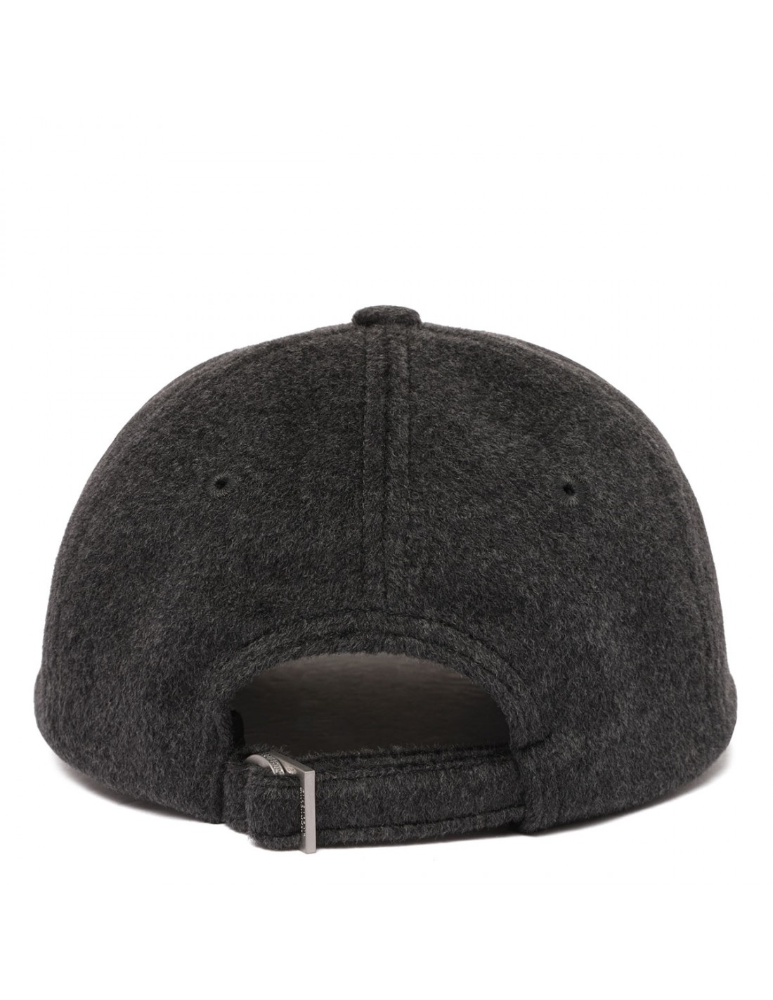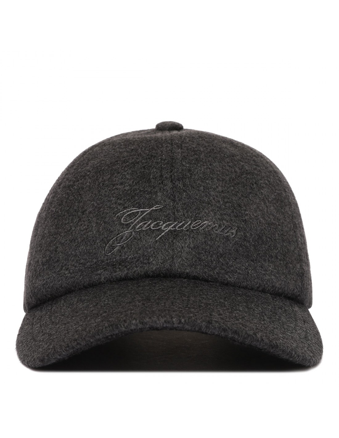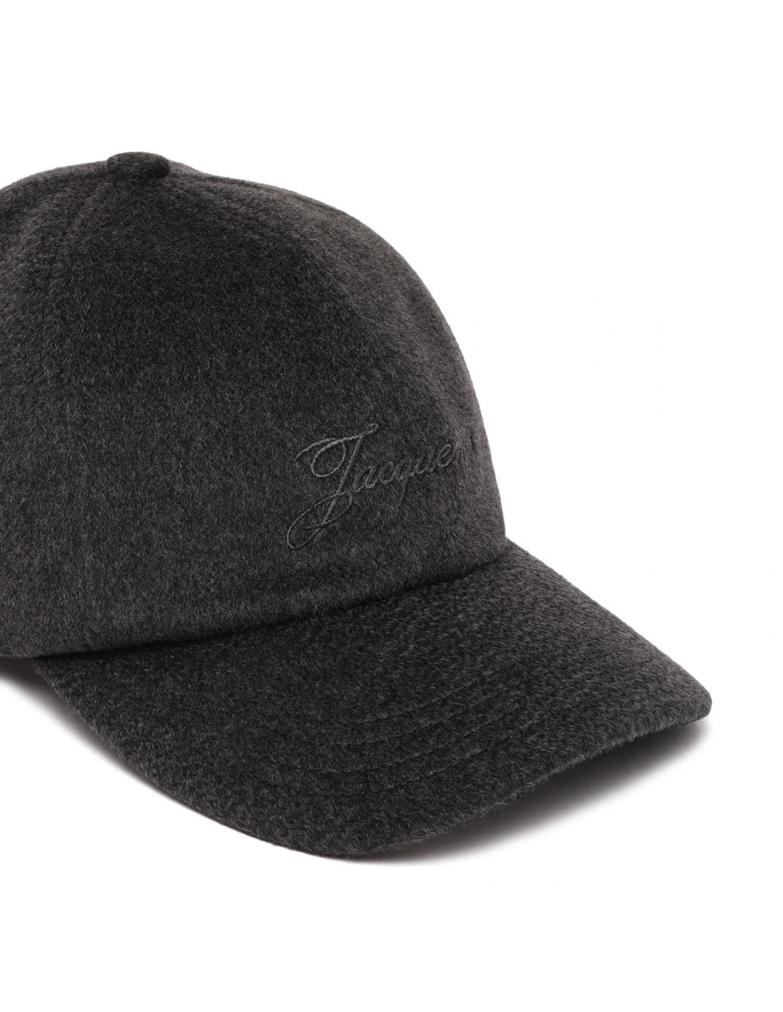 Dark gray soft wool The Cachemiro baseball cap from Jacquemus featuring embroidered logo on front, topstitched brim, round square buckle at back.