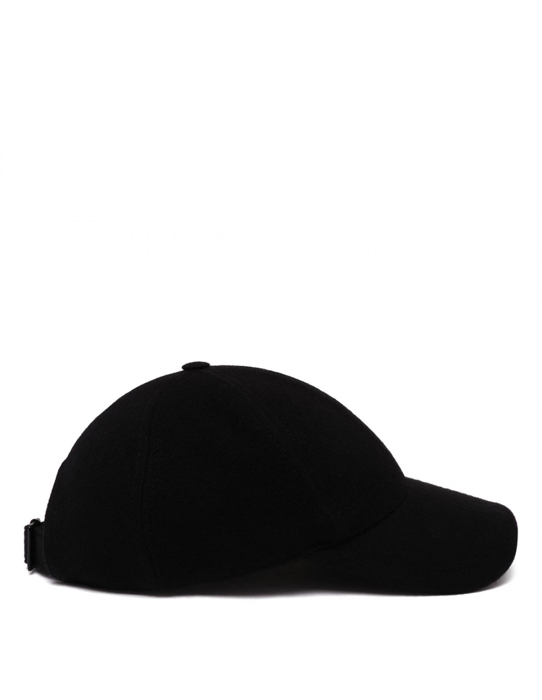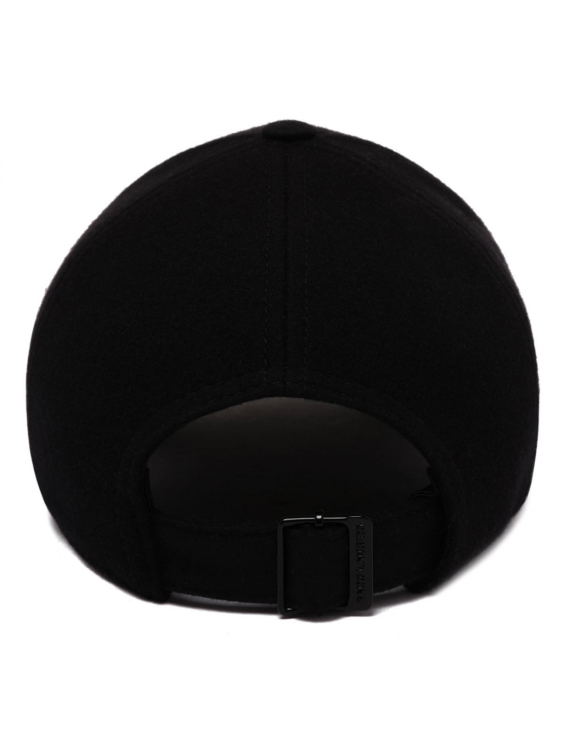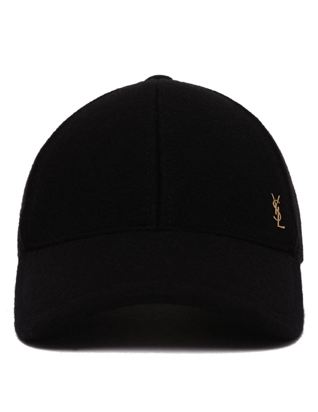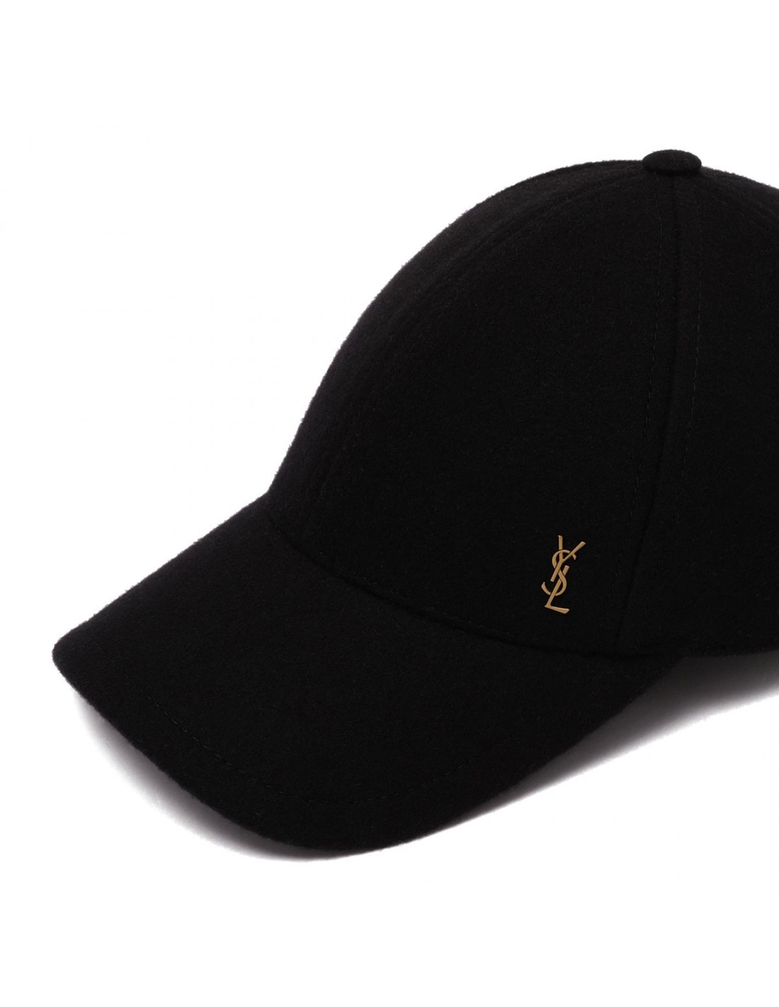 Black felted wool baseball cap from Saint Laurent featuring interlaced logo, front visor, adjustable back strap.