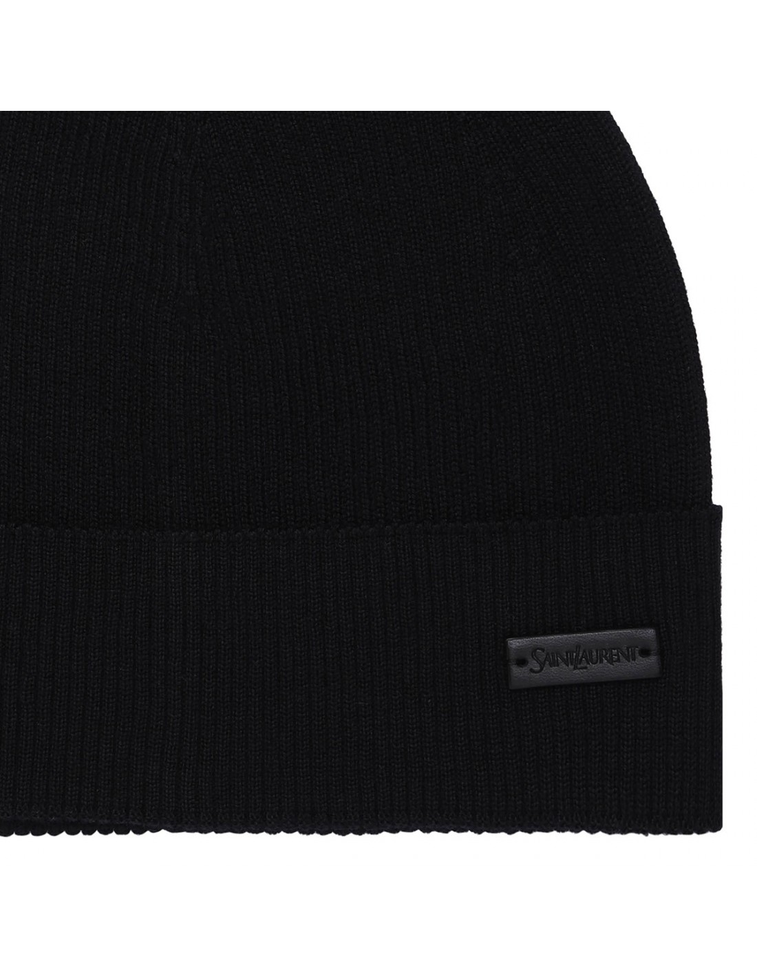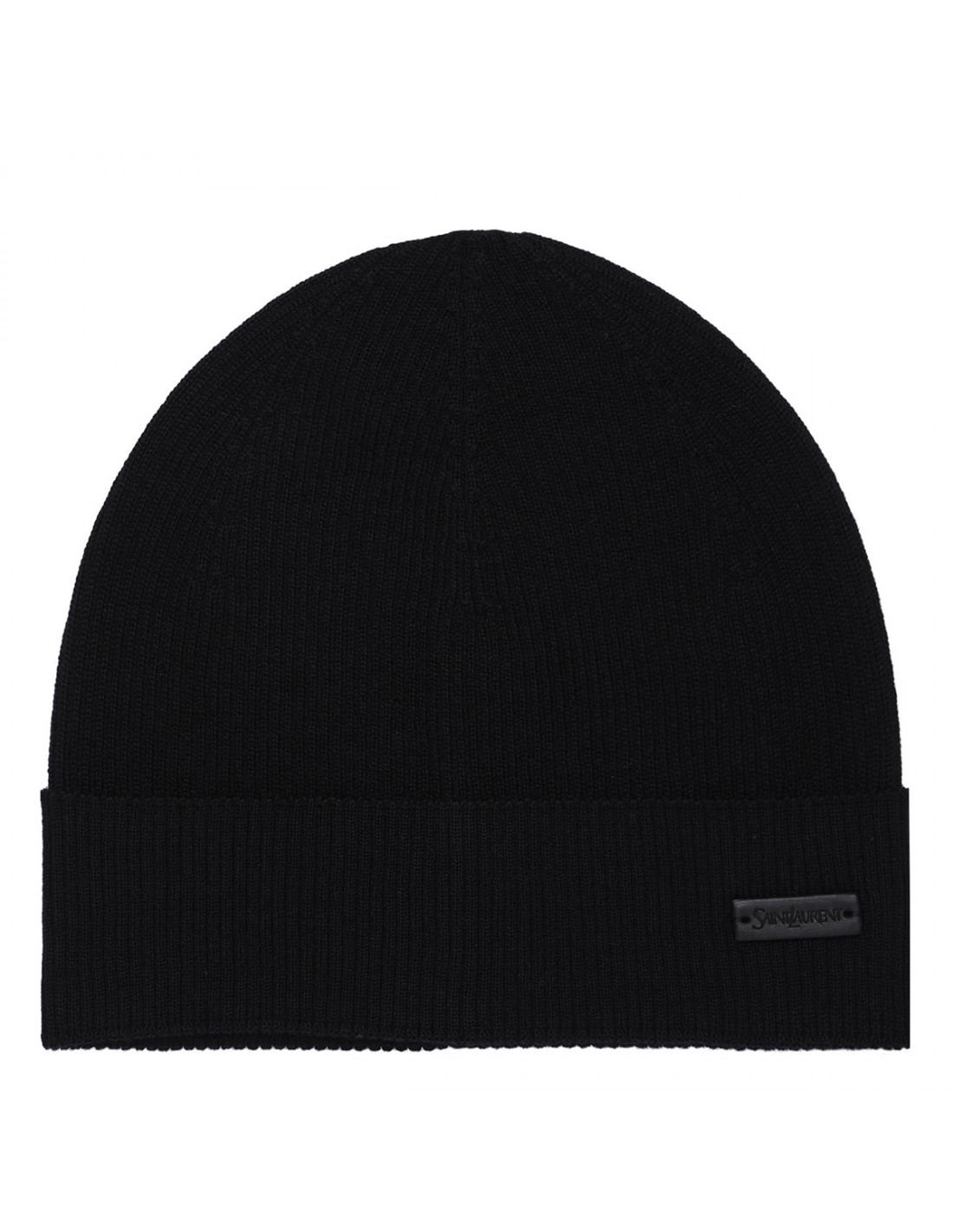 Black rib knit wool beanie from Saint Laurent featuring logo tag, folded hem.
