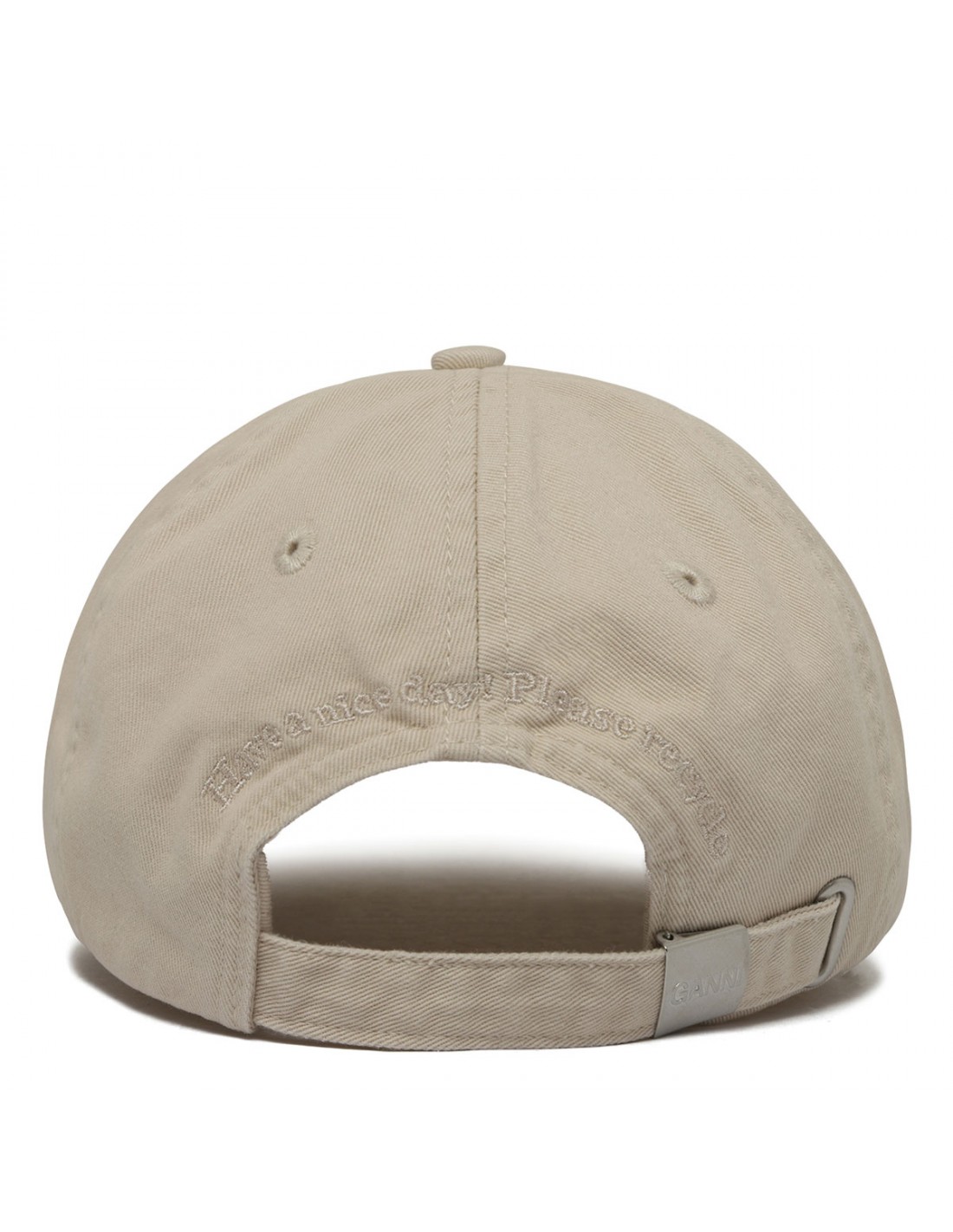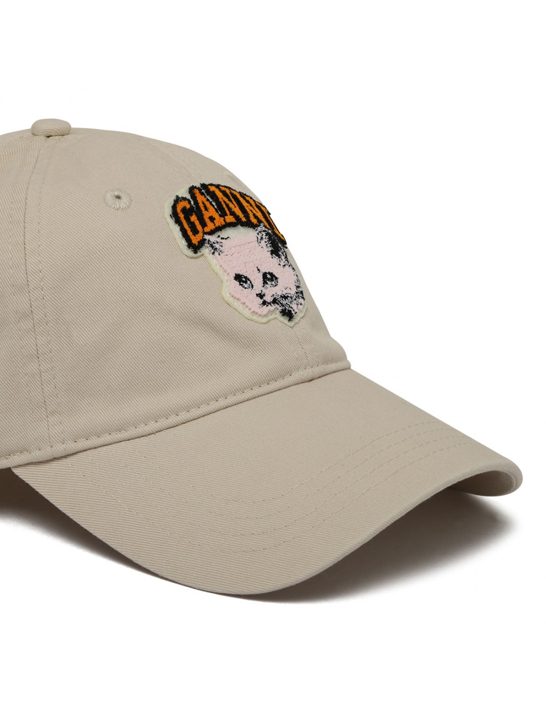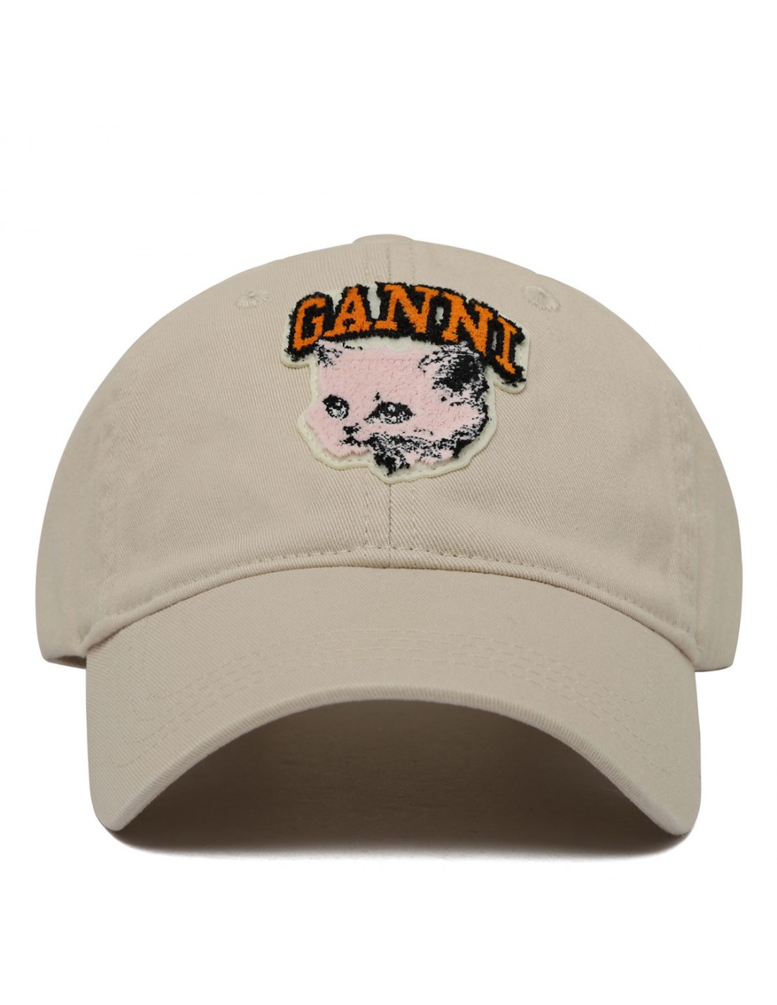 Egret hue washed cotton canvas cap from Ganni featuring cat print graphic, orange logo at front, curved visor, covered button on top, adjustable strap with buckle at back.