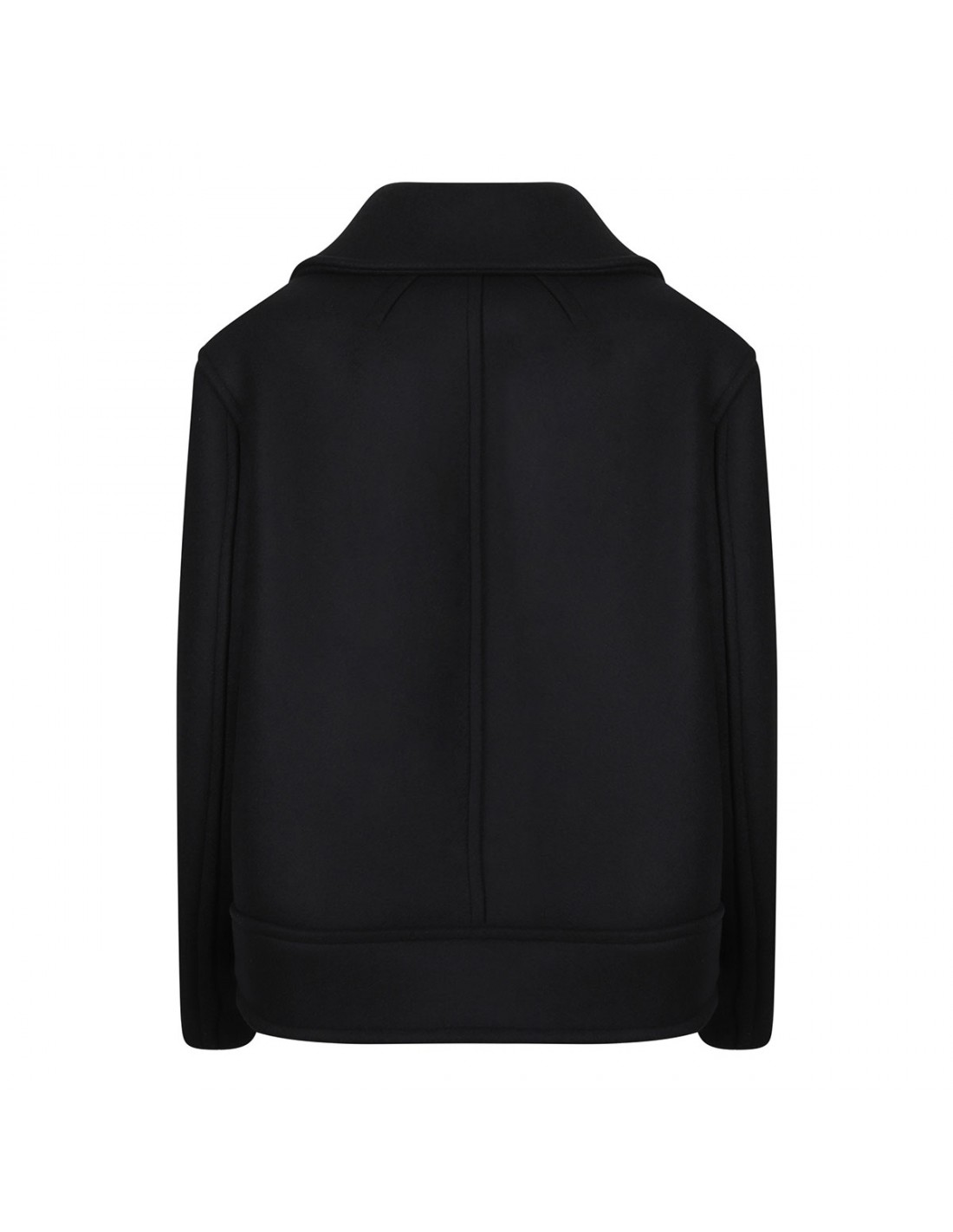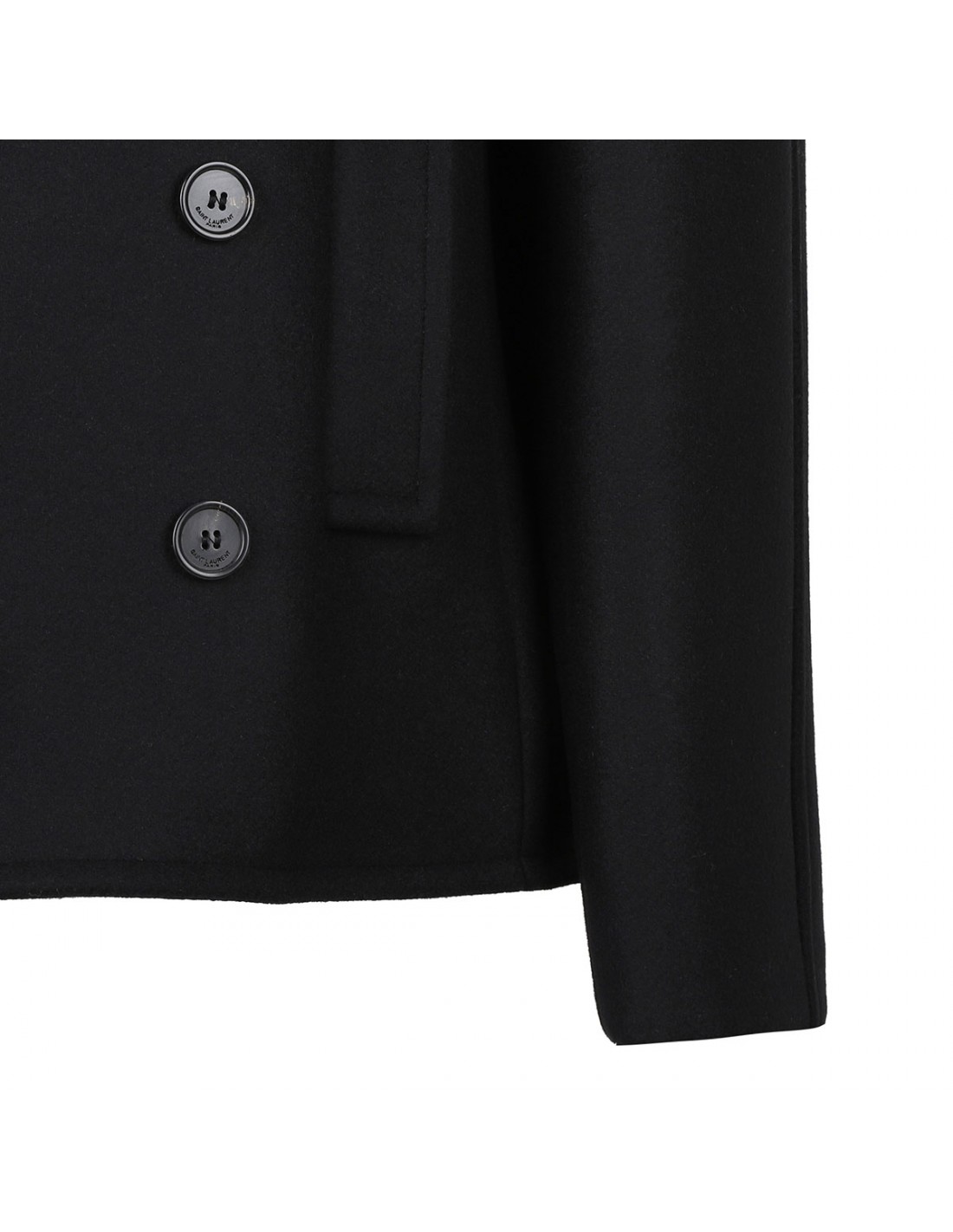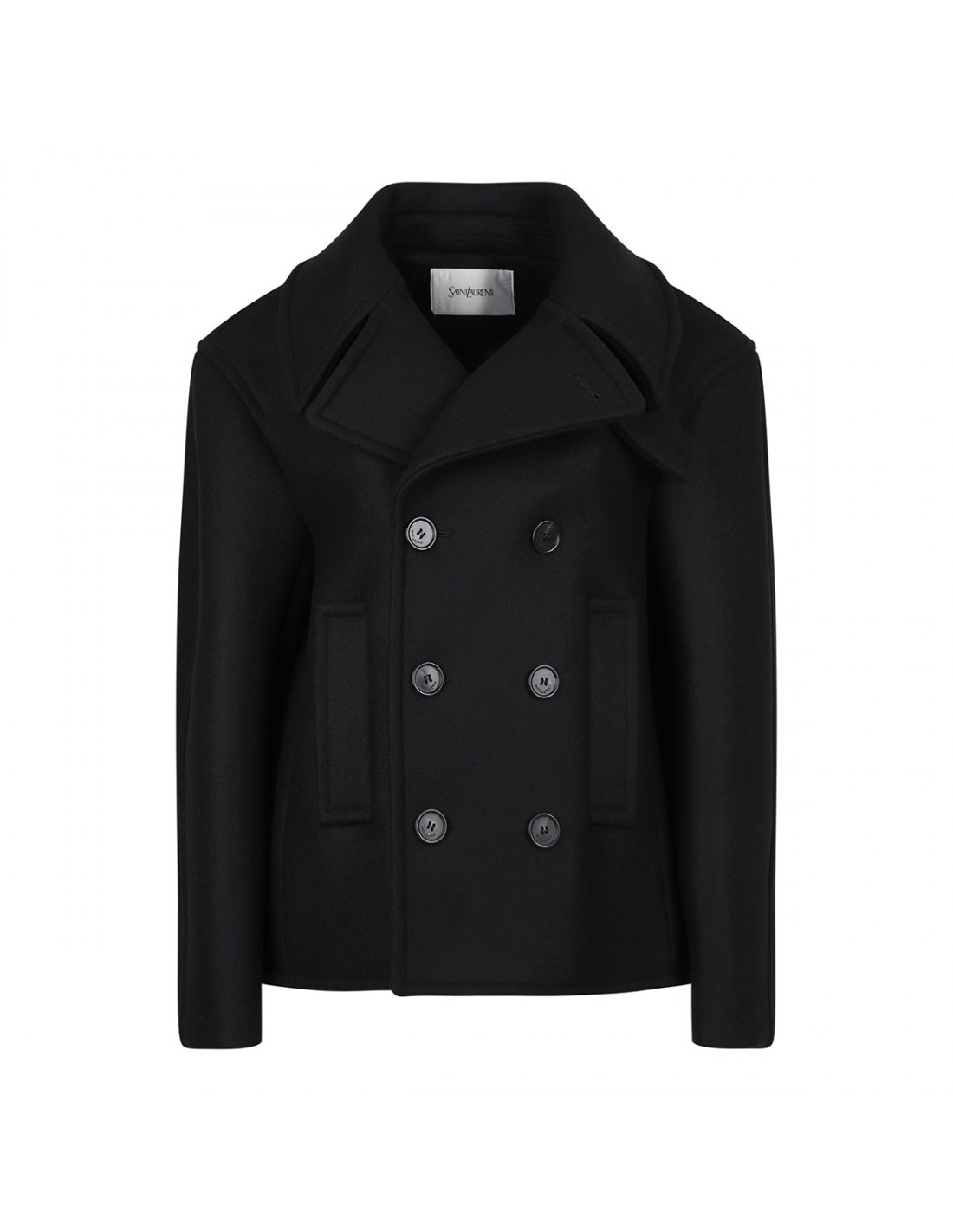 Black virgin wool peacoat from Saint Laurent featuring double-breasted style, oversized silhouette, two-way ulster collar with chin guard, dropped shoulders, button closure crescent sleeves, pockets at front, padded shoulders, silk lining.