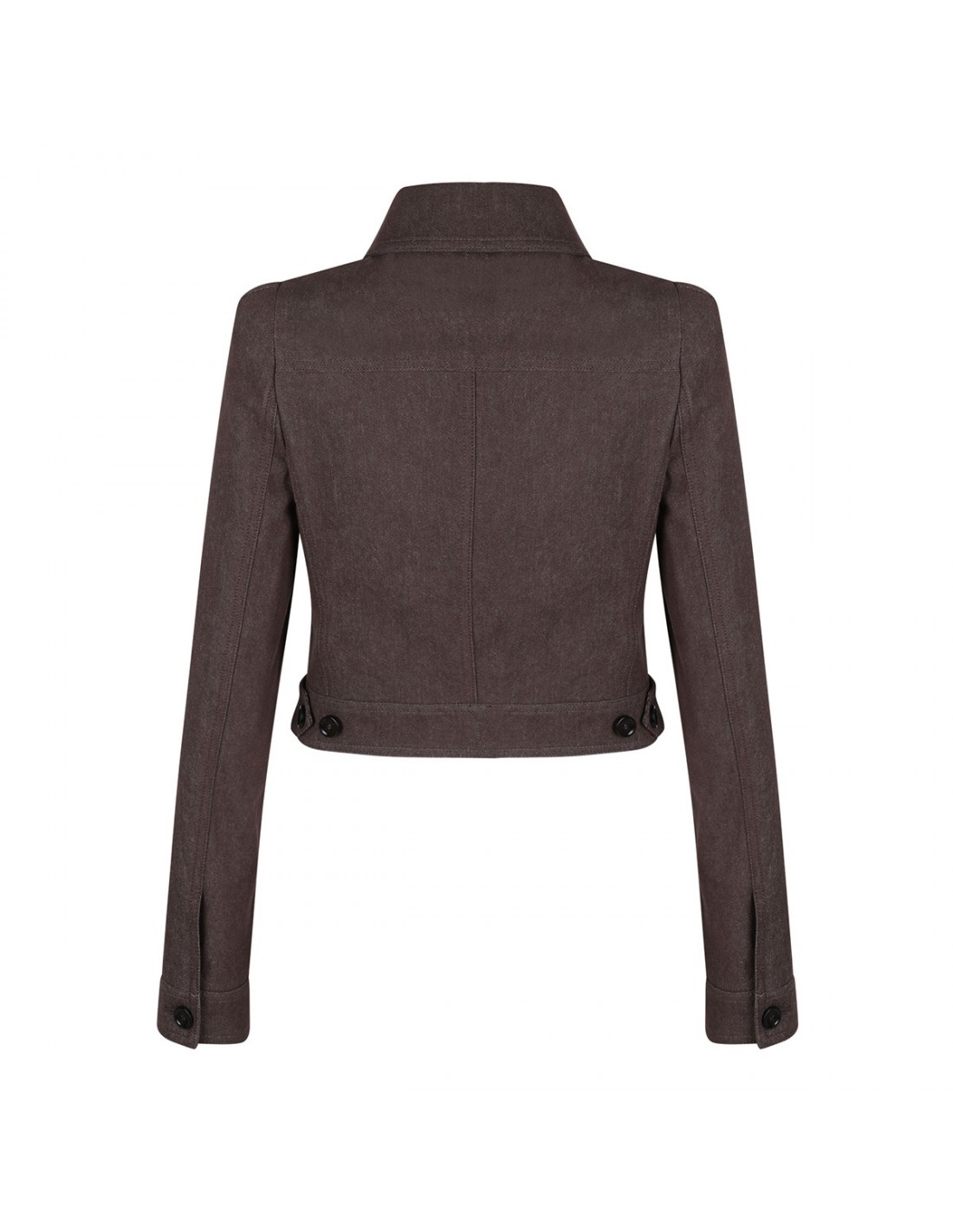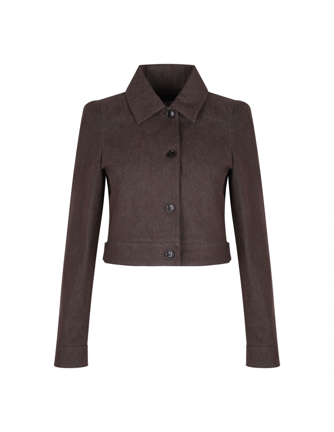 Brown denim-effect cropped jacket from Max Mara featuring big structured shoulders, pointed collar, long sleeves with buttoned cuffs, stitched pleat motif on front and shoulders, button closure.