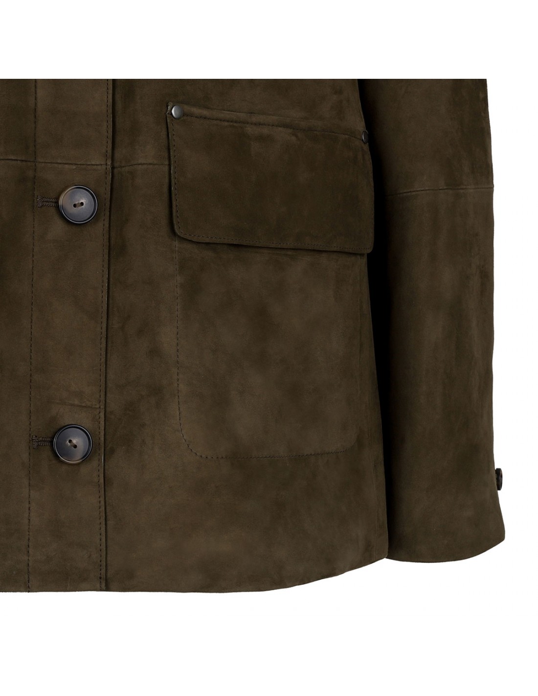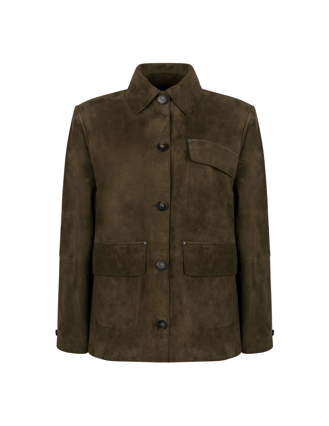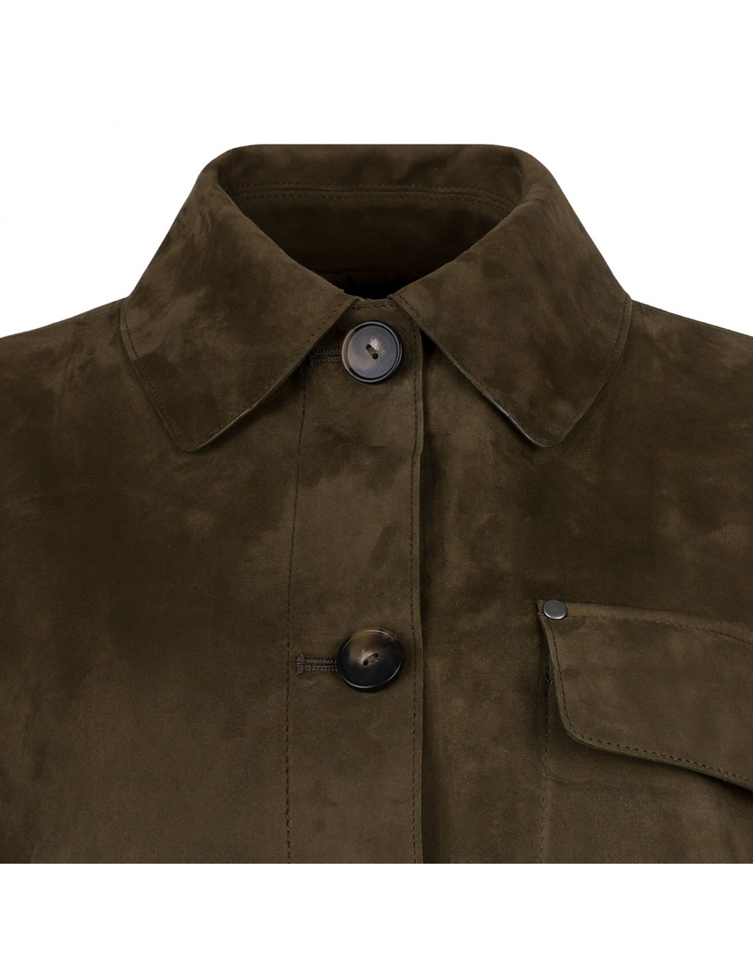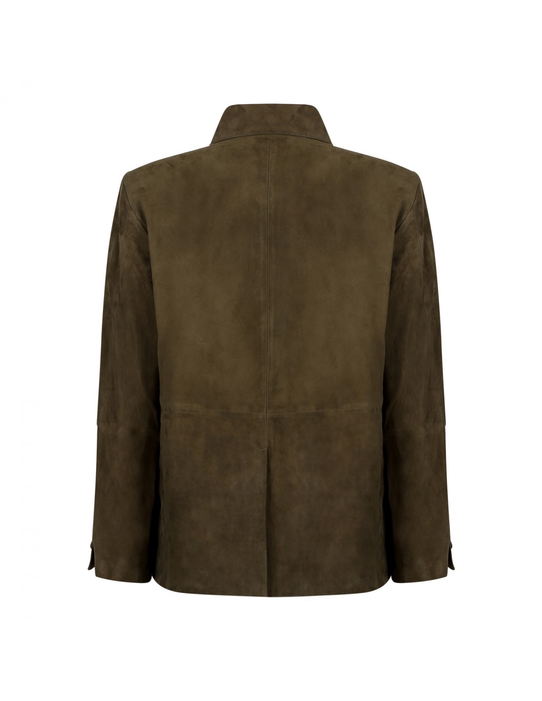Hazel suede leather oversized jacket from Vince featuring pointed collar, button closure along front, chest pocket, buttoned cuffs, back vent, side flap pockets.