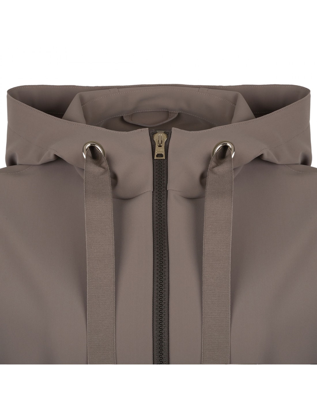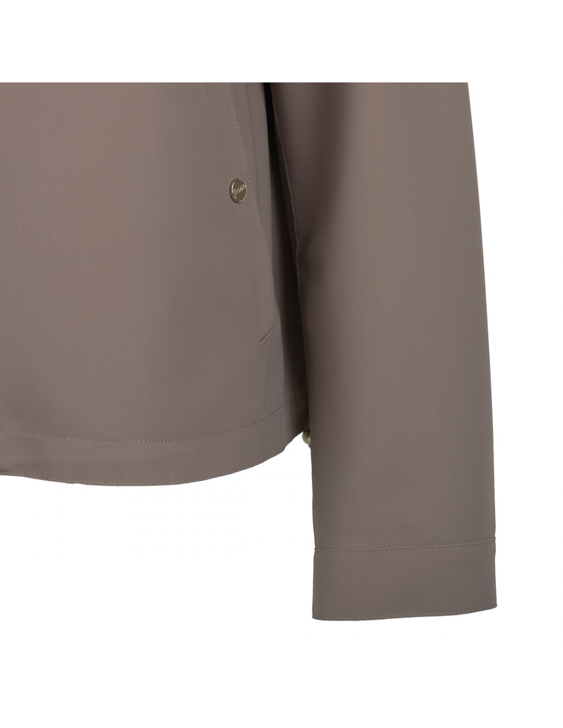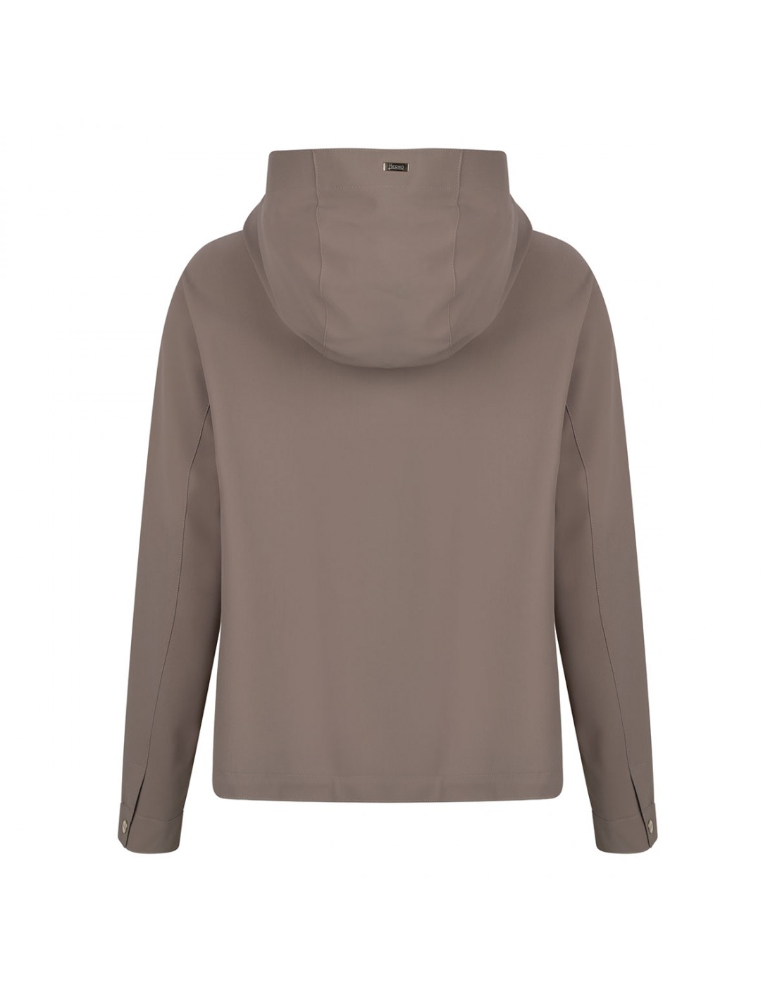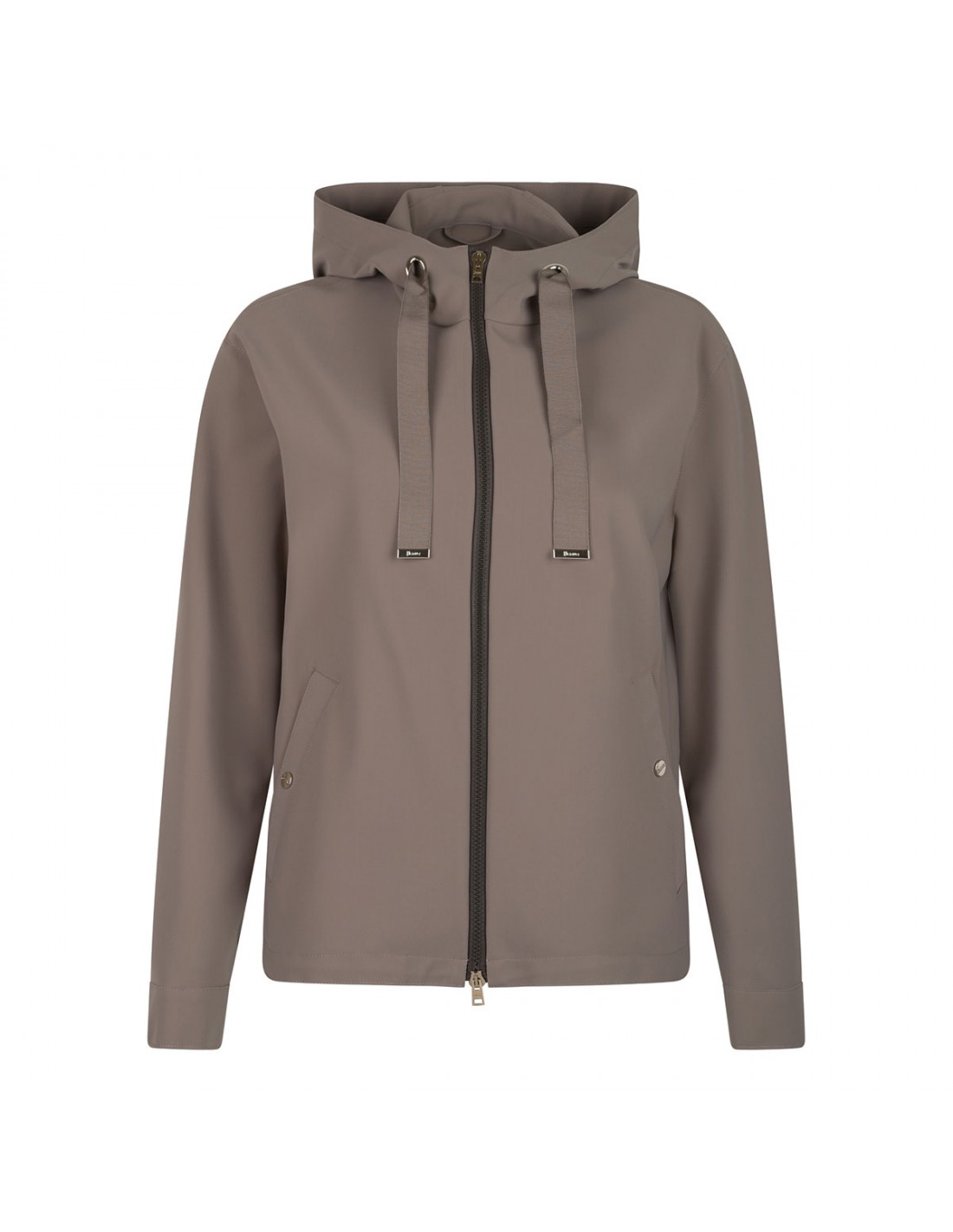 Taupe tech fabric jacket from Herno featuring waterproof treatment, hood with drawstring, two-way zip fastening along front, side snap button pockets, buttoned cuffs, logo plaque on hood.