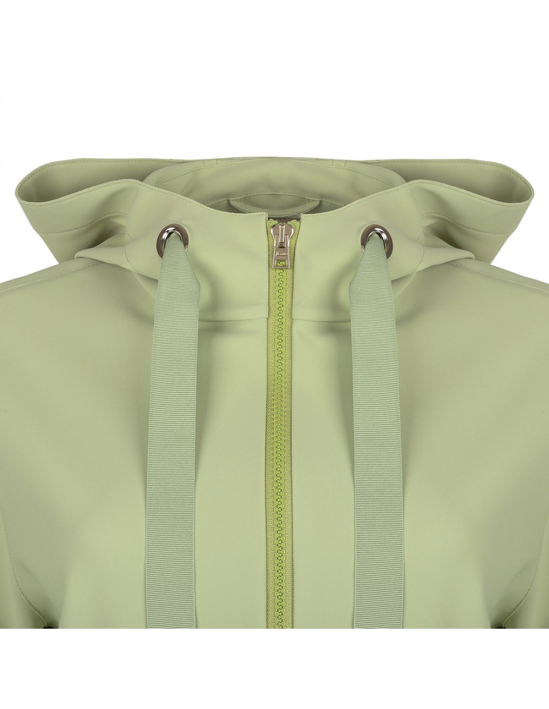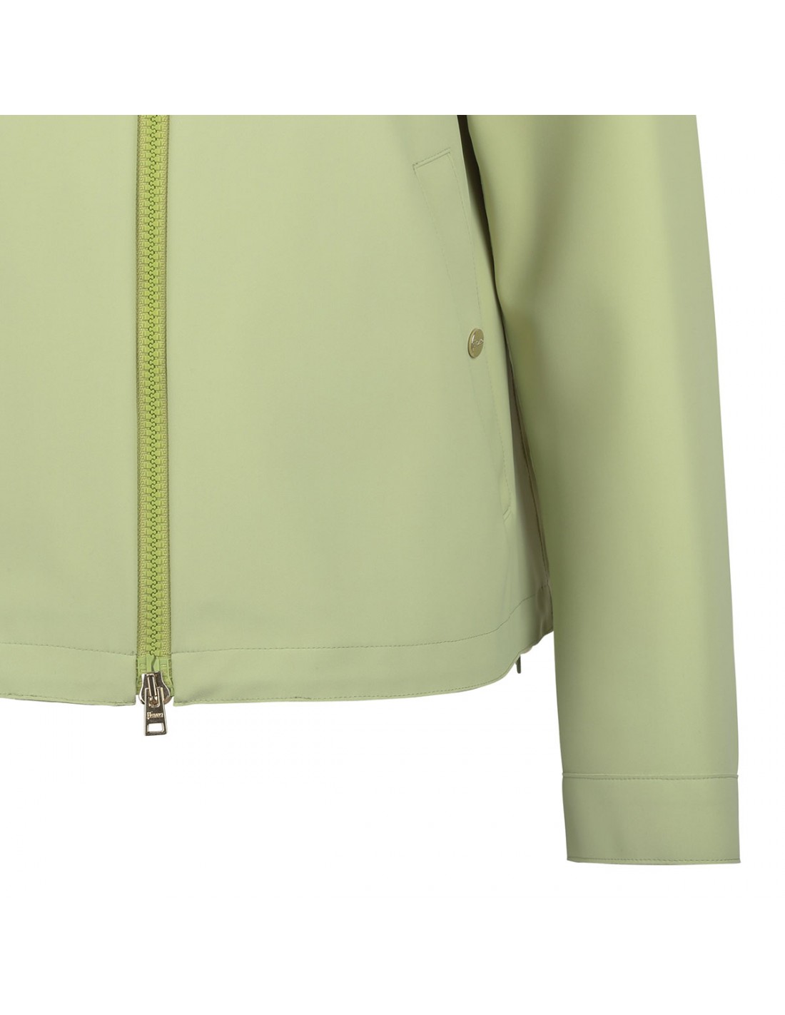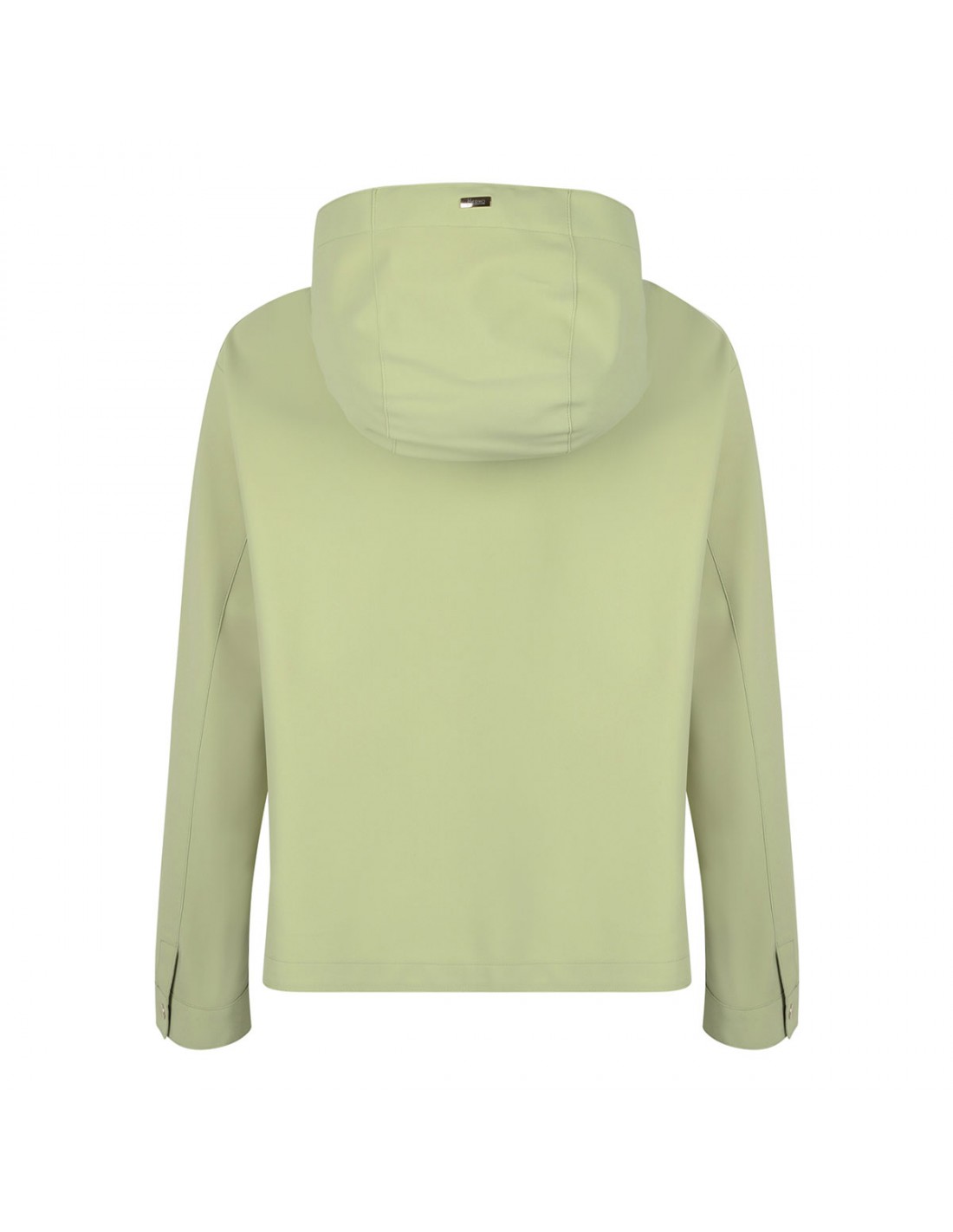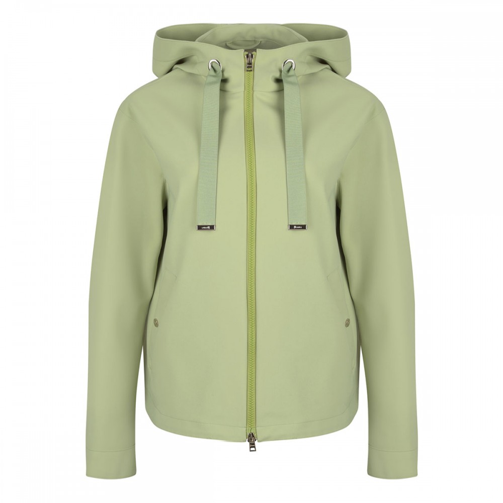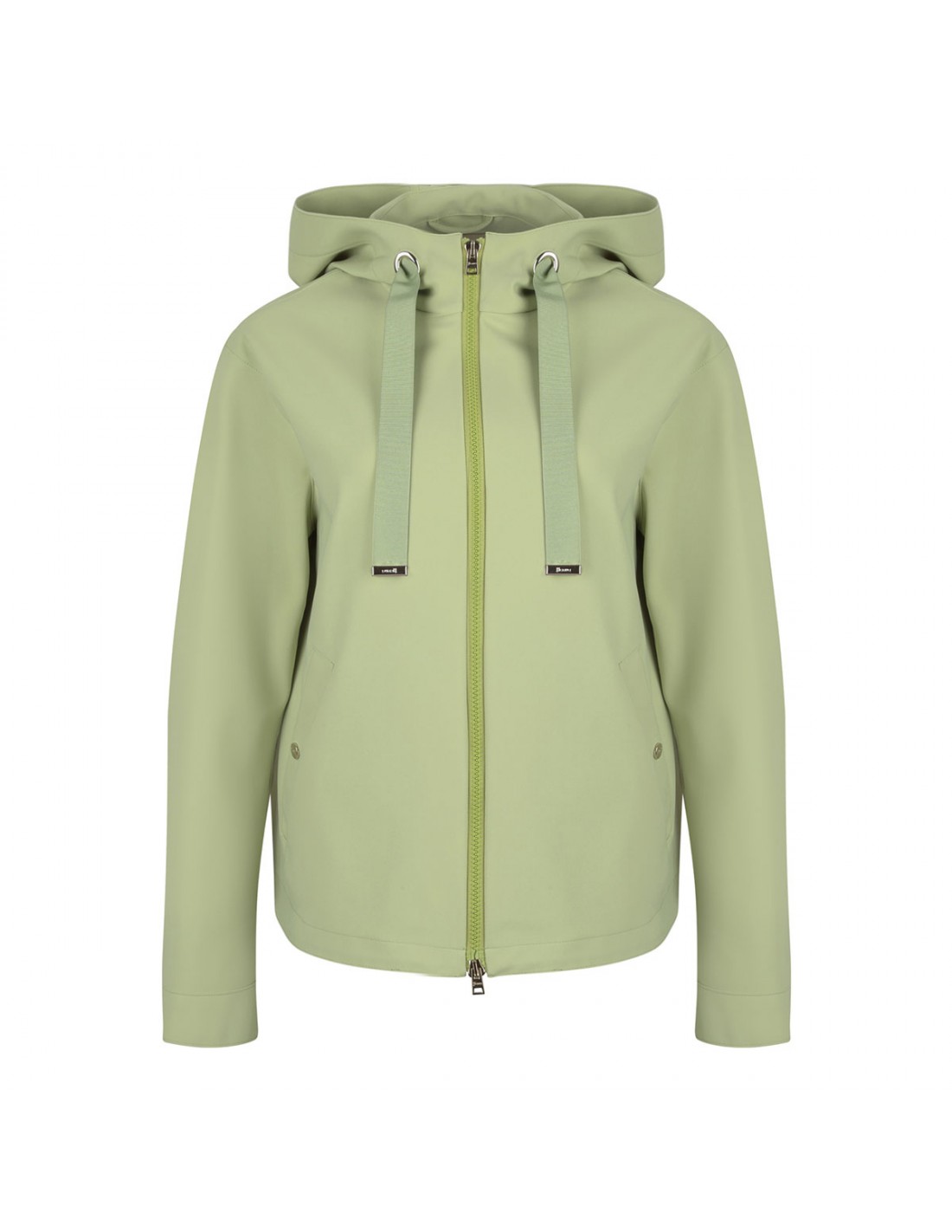 Light green tech fabric jacket from Herno featuring waterproof treatment, hood with drawstring, two-way zip fastening along front, side snap button pockets, buttoned cuffs, logo plaque on hood.