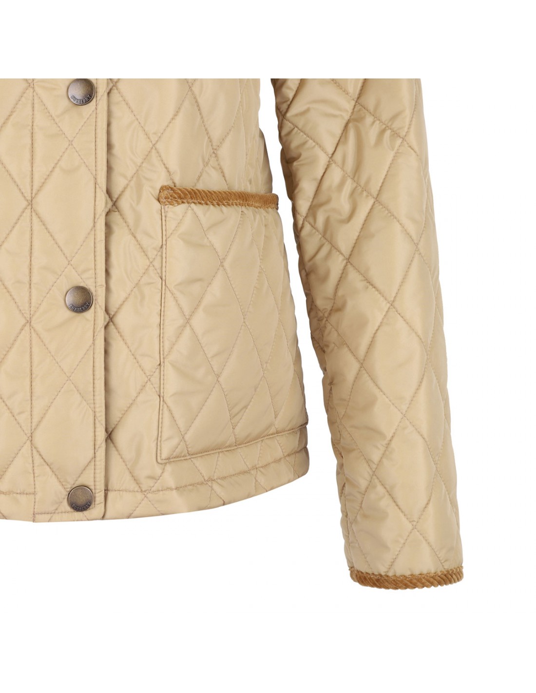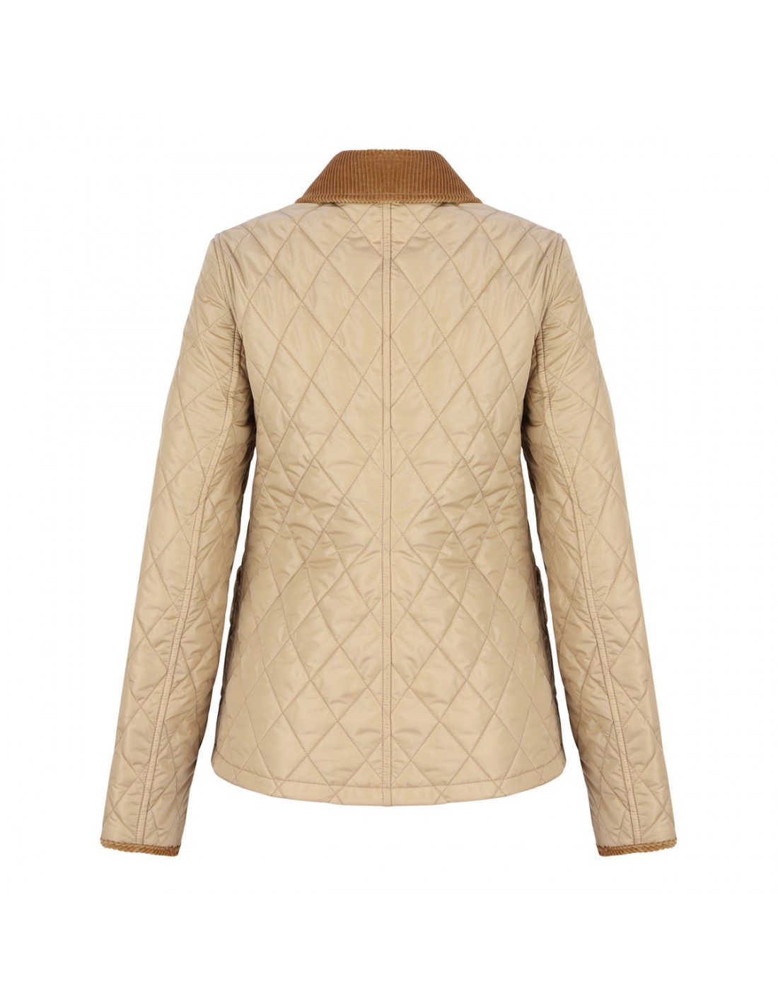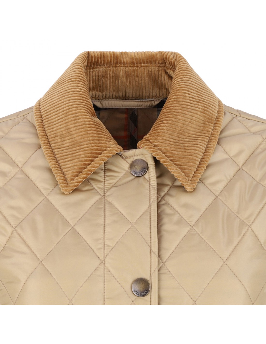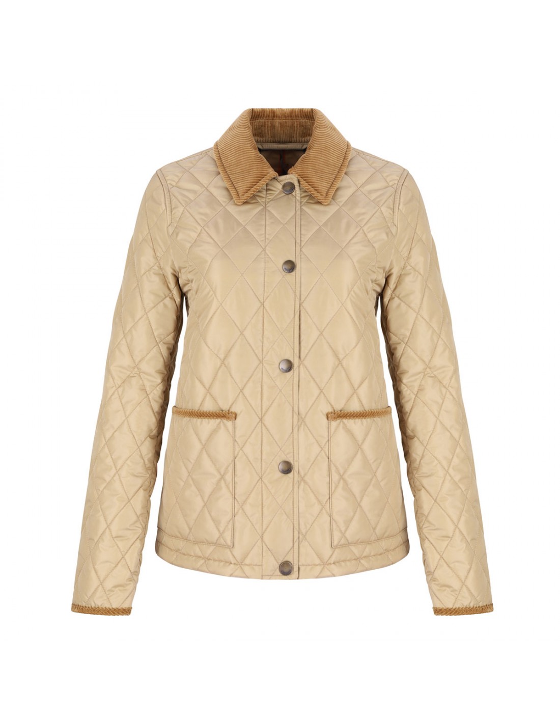 Light beige quilted barn jacket from Burberry featuring corduroy pointed collar, press stud fastening, side patch pockets, silicone tag with logo lettering at sleeve, regular fit, Burberry Check lining and undercollar.
