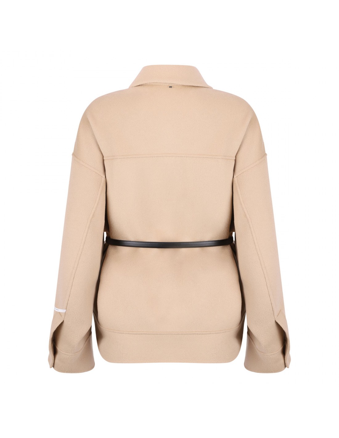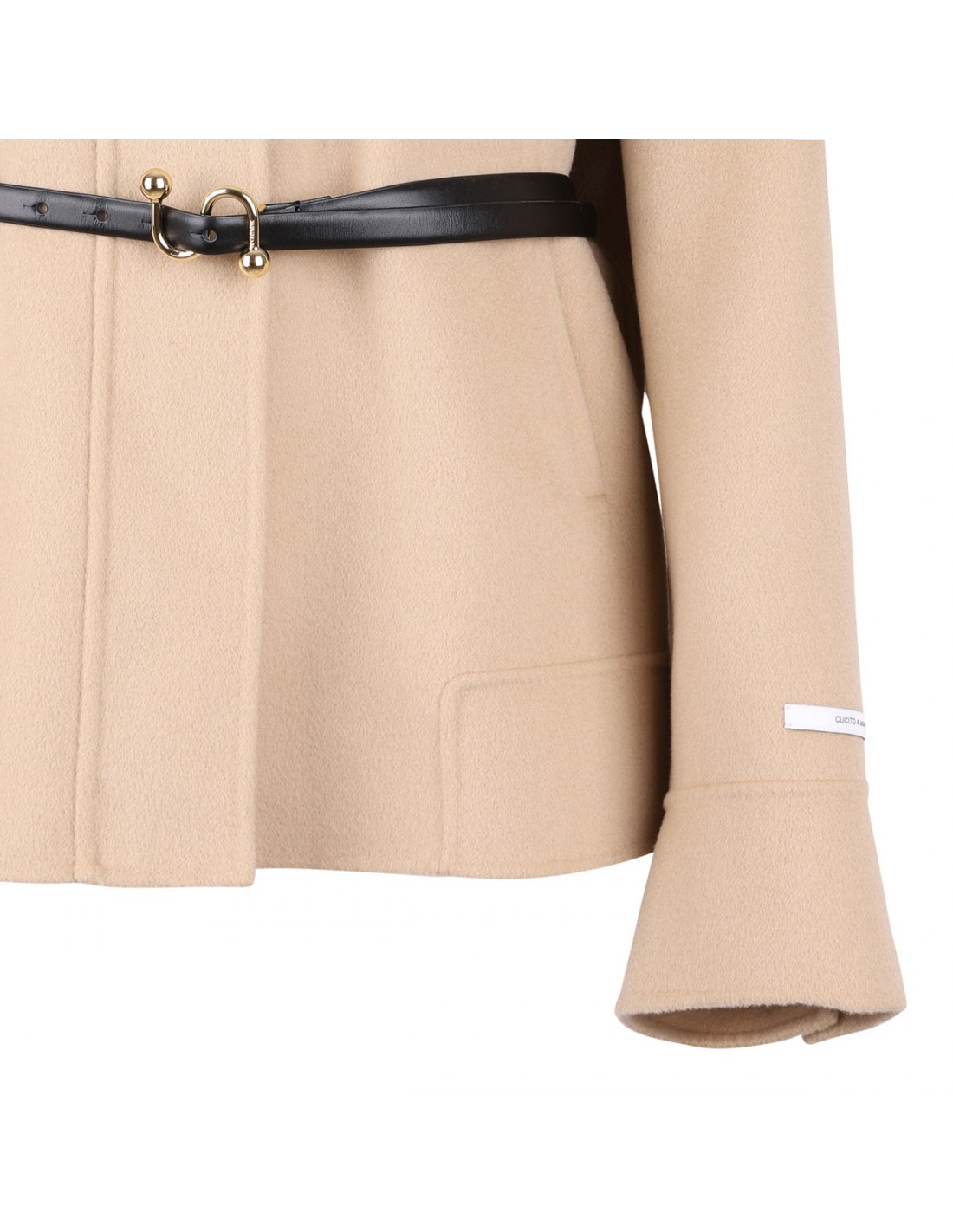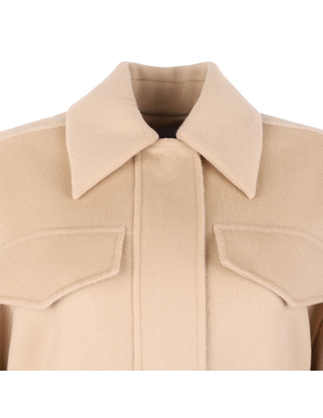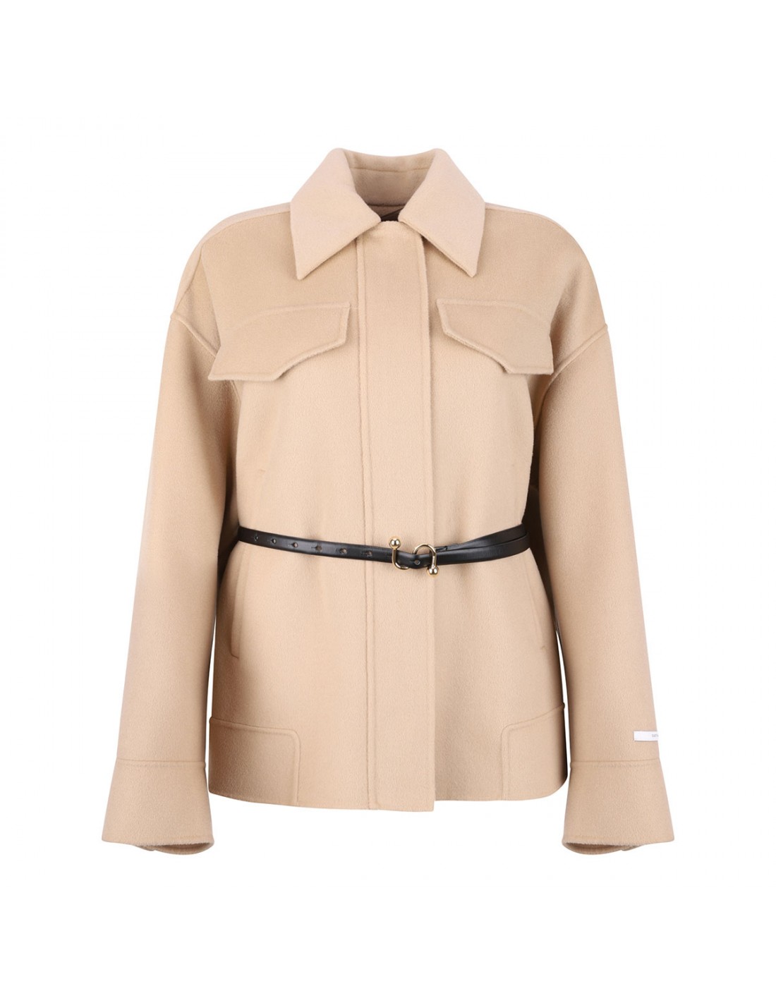 Camel hue double pure-wool Cantore pea coat from Sportmax featuring pointed collar with concealed zip fastening, dropped shoulders, long sleeves, thin leather belt with S-buckle, side pockets, chest flap pockets, regular fit.