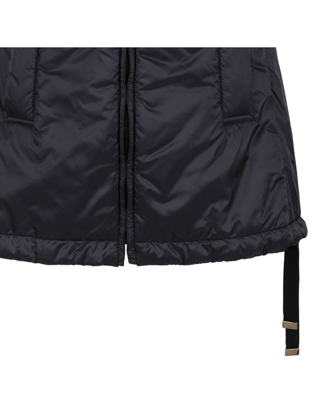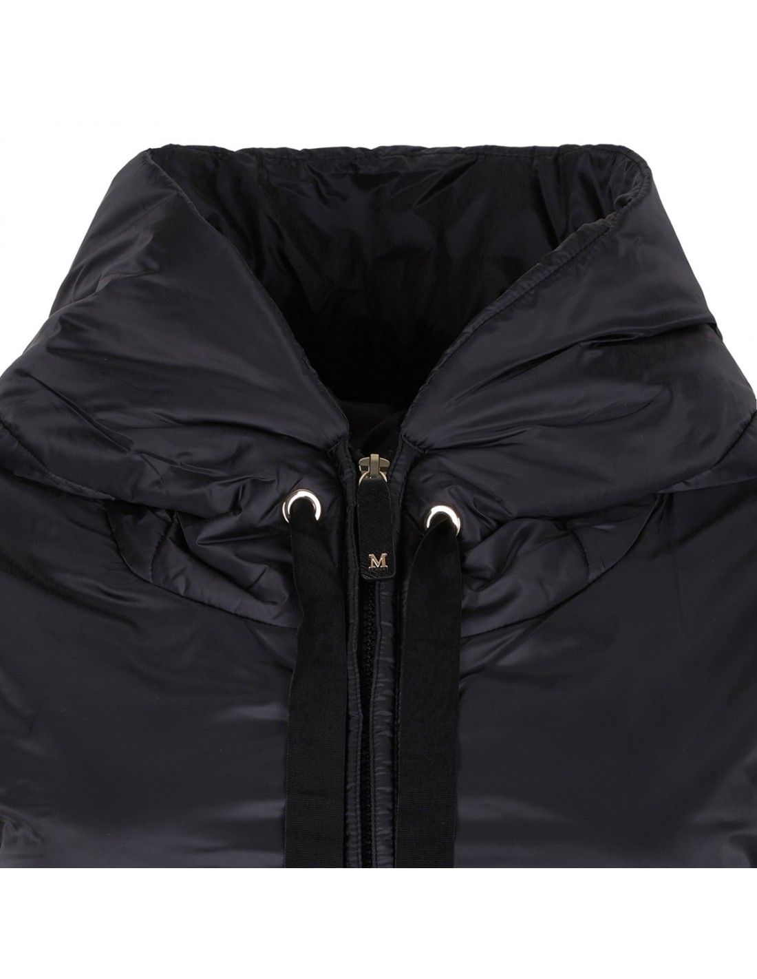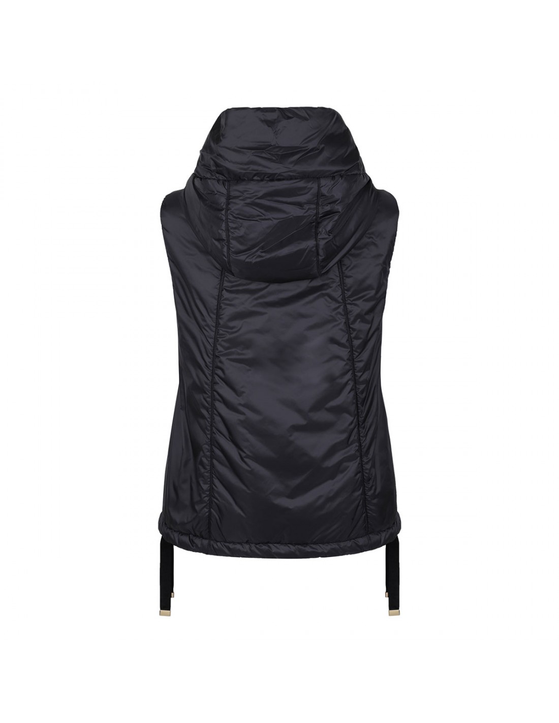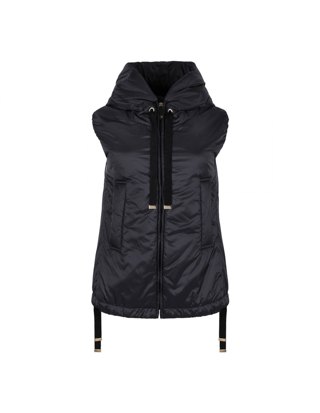 Black water repellent canvas padded Greengo vest from Max Mara The Cube featuring hood, drawstring hem, slightly flared line, zip and leather zip pull with metallic Monogram fastening on front, side pockets.
