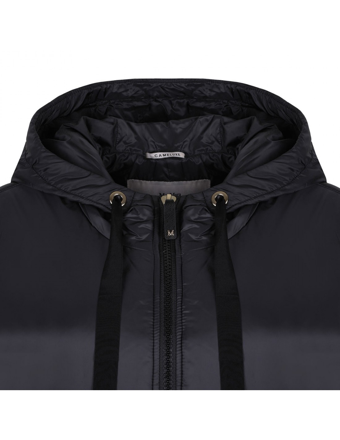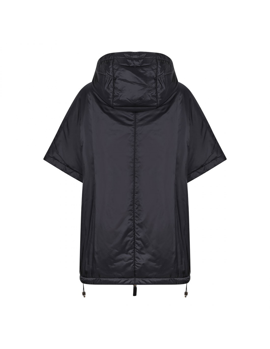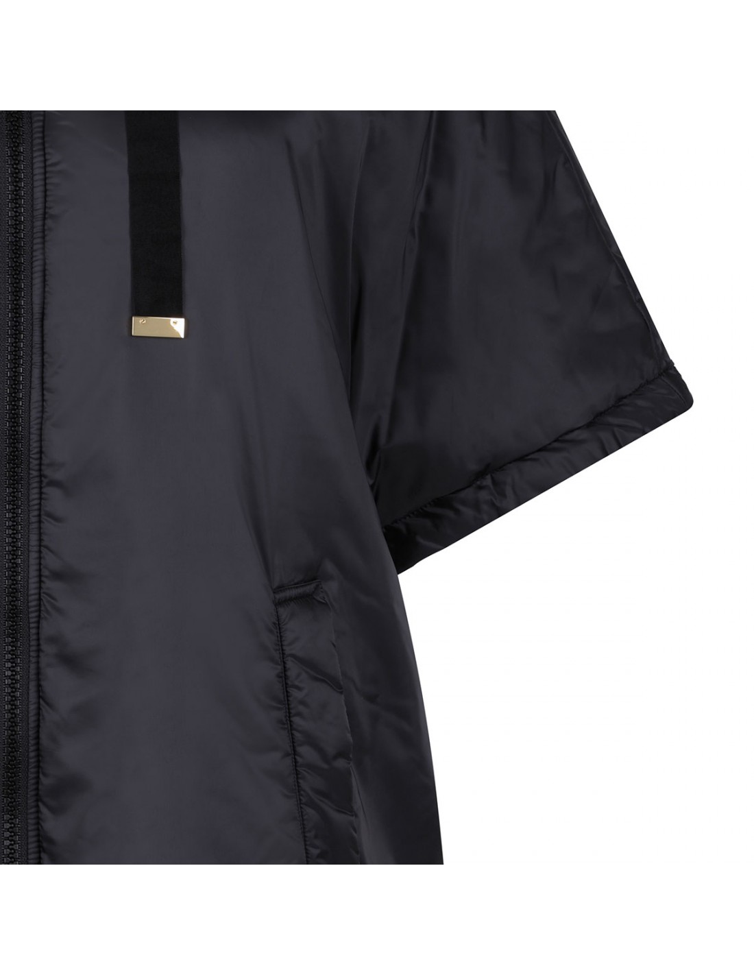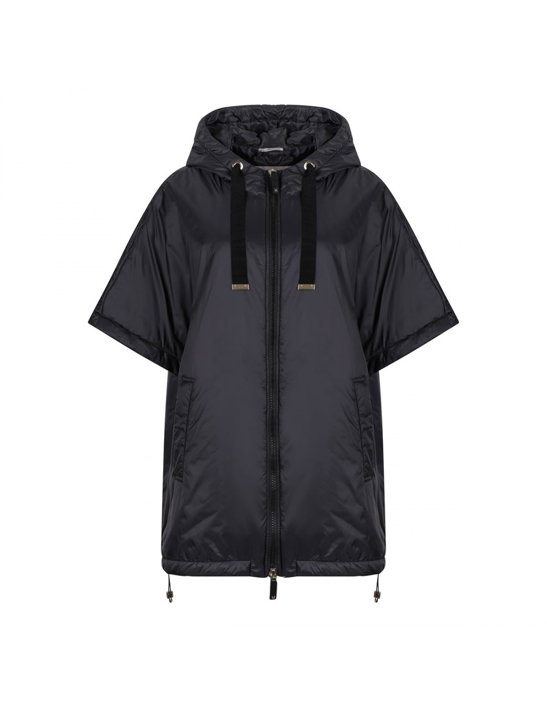 Black water-repellent canvas Greenci short cape from Max Mara The Cube featuring boxy silhouette, elastic drawstring at hem, hood with drawstring, short kimono sleeves, zip fastening with leather zip pull with metallic logo monogram, side pockets.