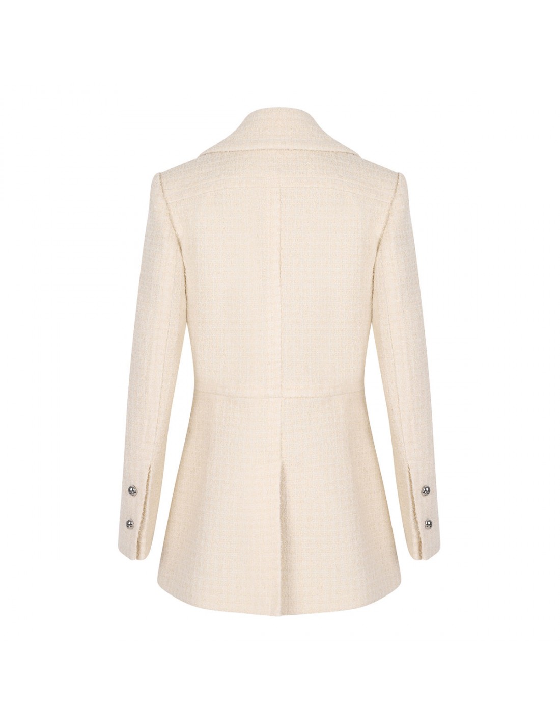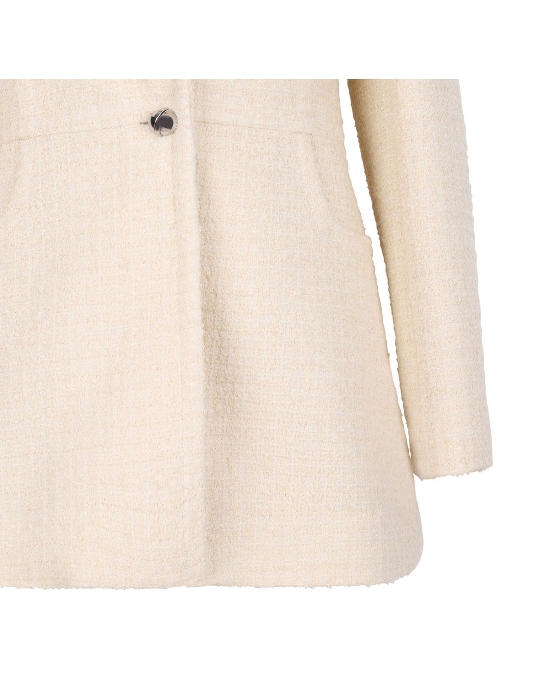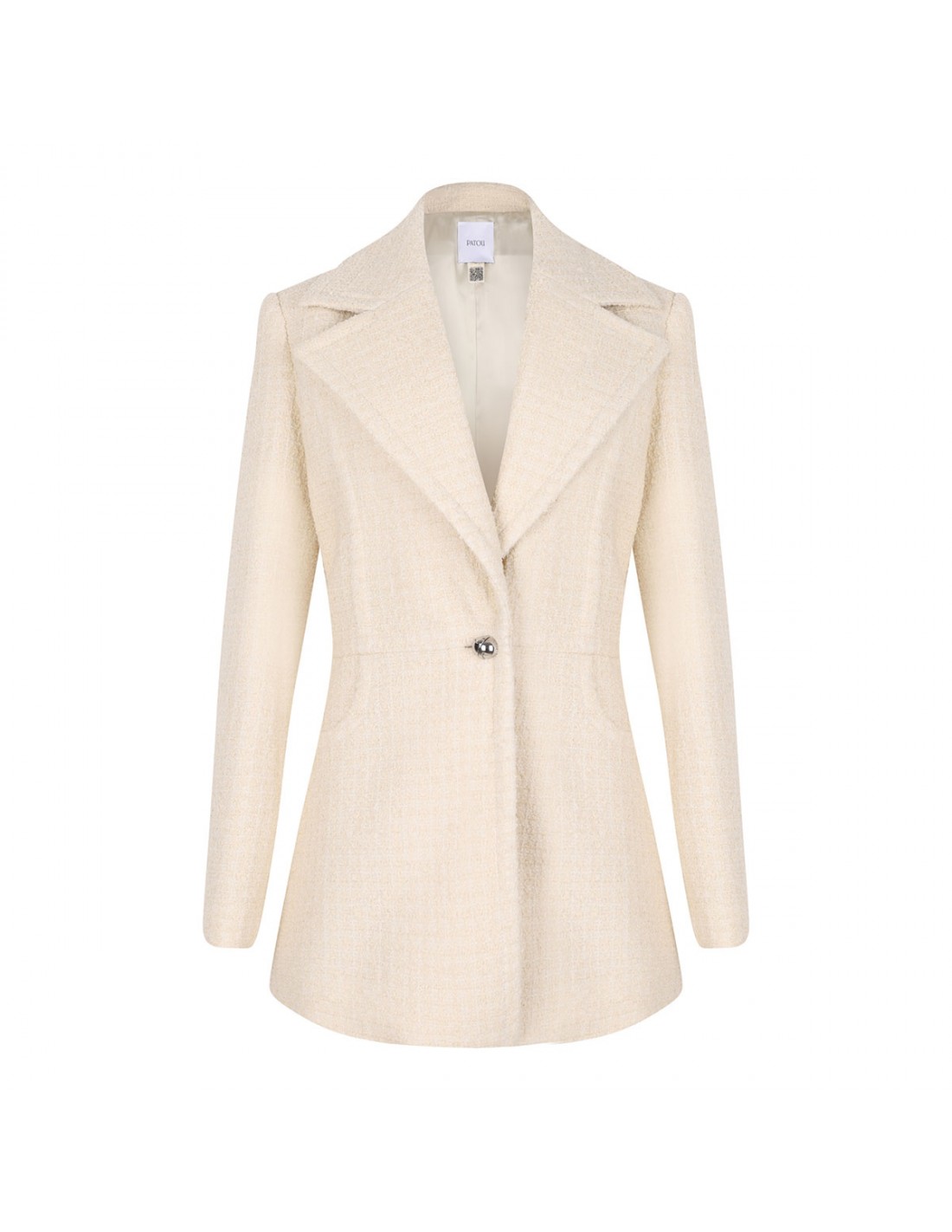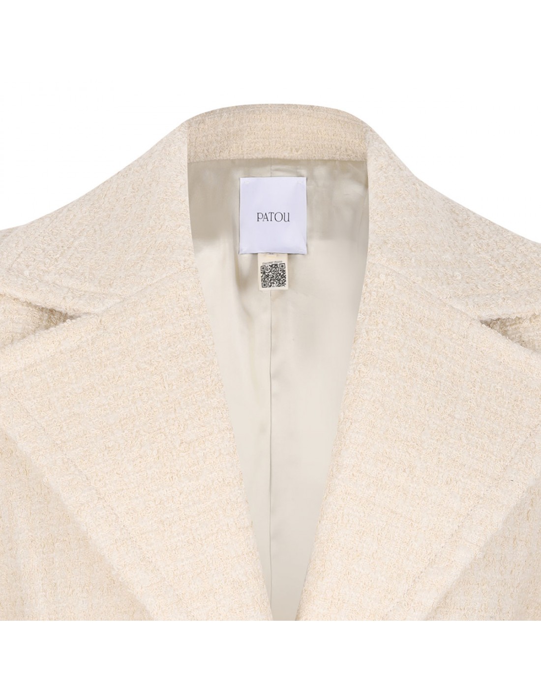 Snowberry white hue wool blend tweed long jacket from Patou featuring tailored silhouette, single-breasted style, wide notch lapel, silver-tone half-sphere JP monogram button closure, buttoned cuffs.