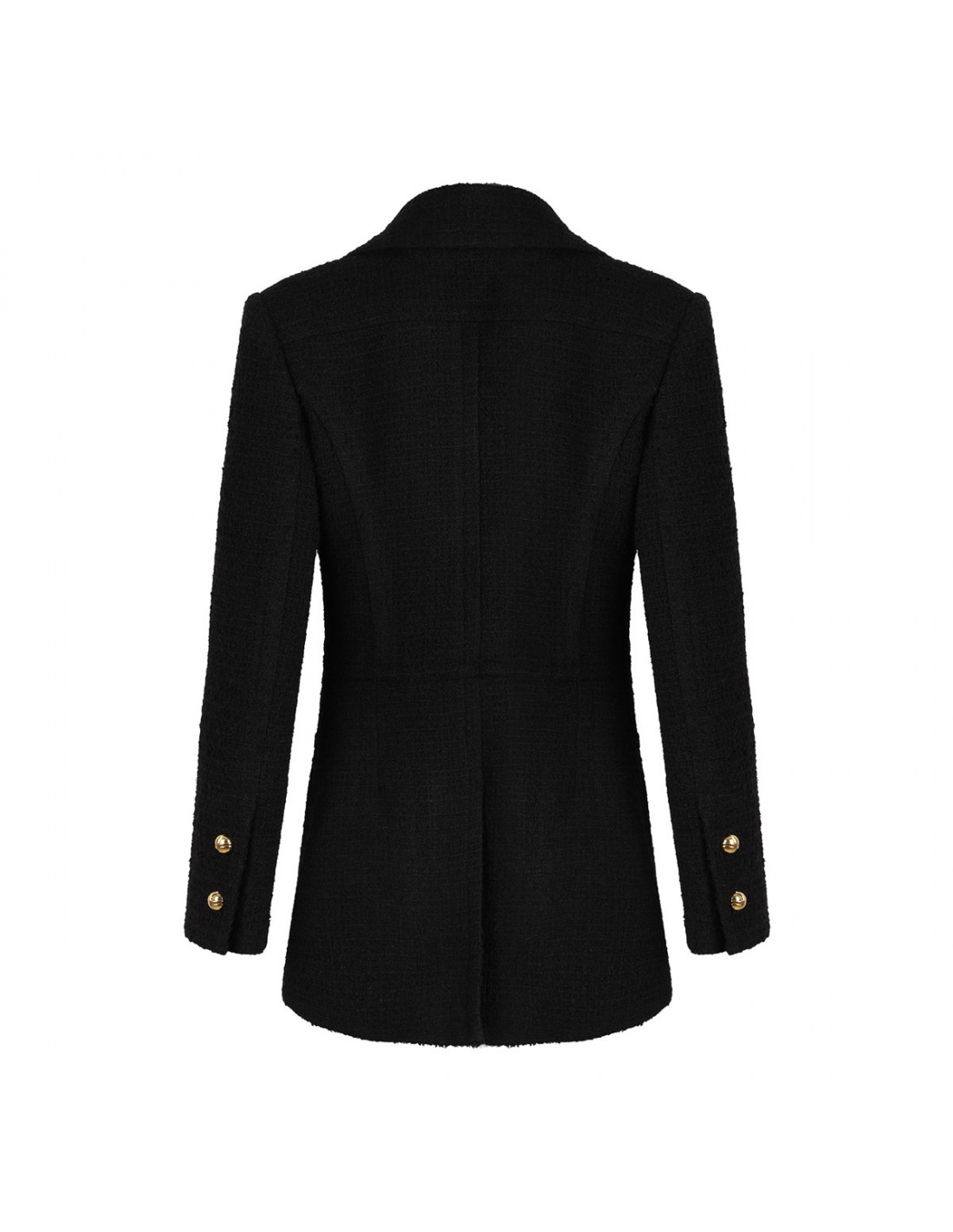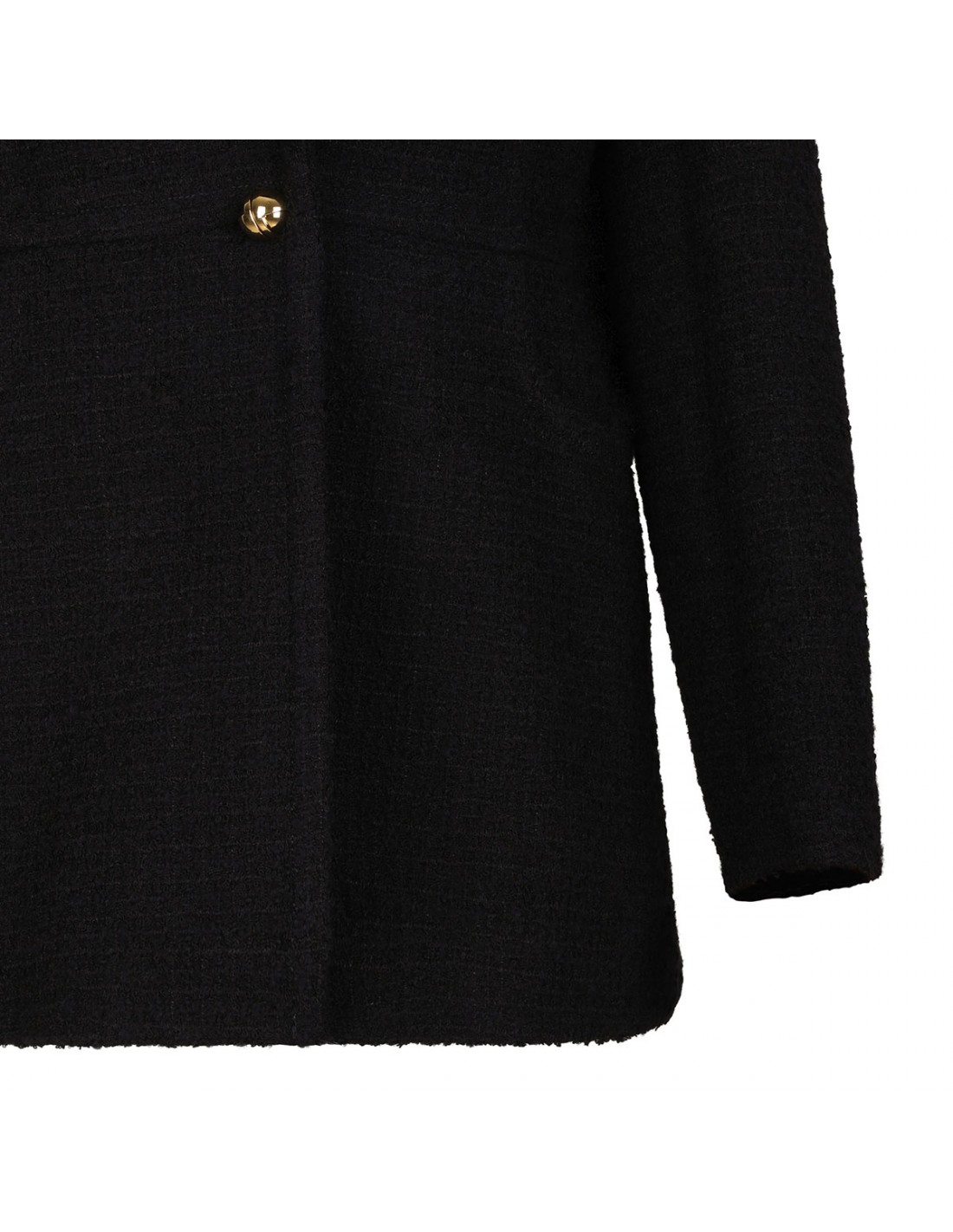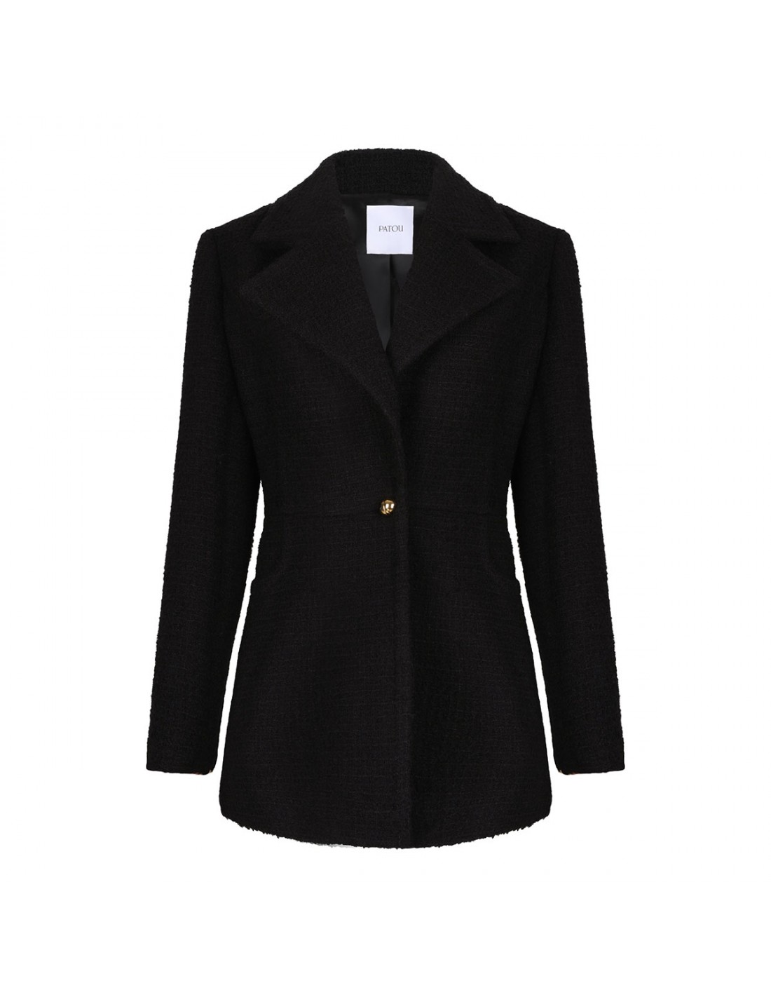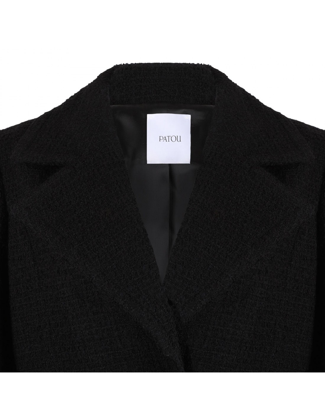 Black wool blend tweed long jacket from Patou featuring tailored silhouette, single-breasted style, wide notch lapel, silver-tone half-sphere JP monogram button closure, buttoned cuffs.
