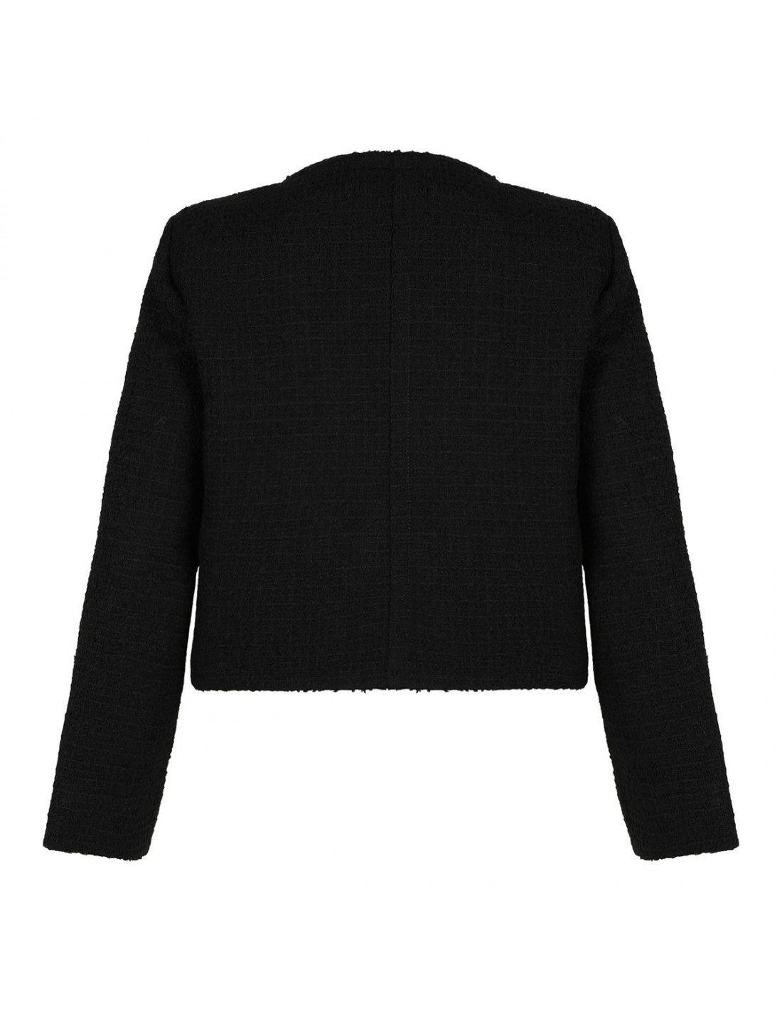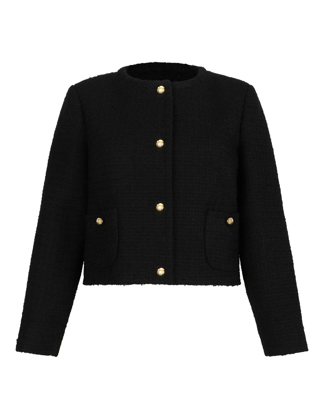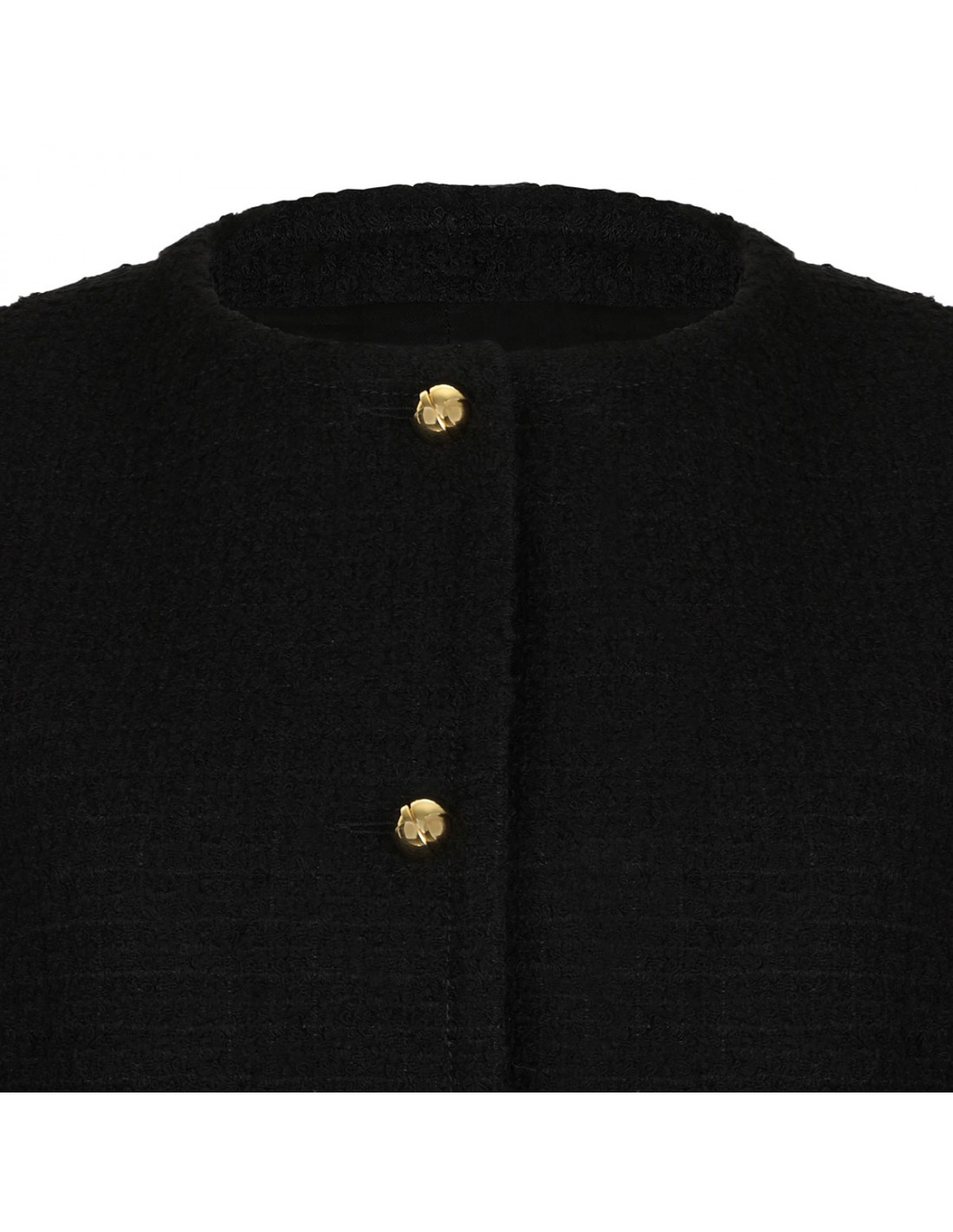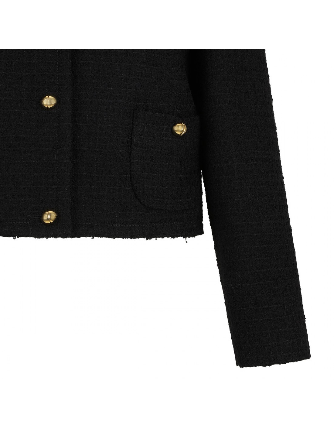 Black wool blend tweed collarless jacket from Patou featuring short length, single-breasted silhouette, half-sphere gold-tone JP monogram button fastening at front, buttoned chest patch pockets at front. Lined.