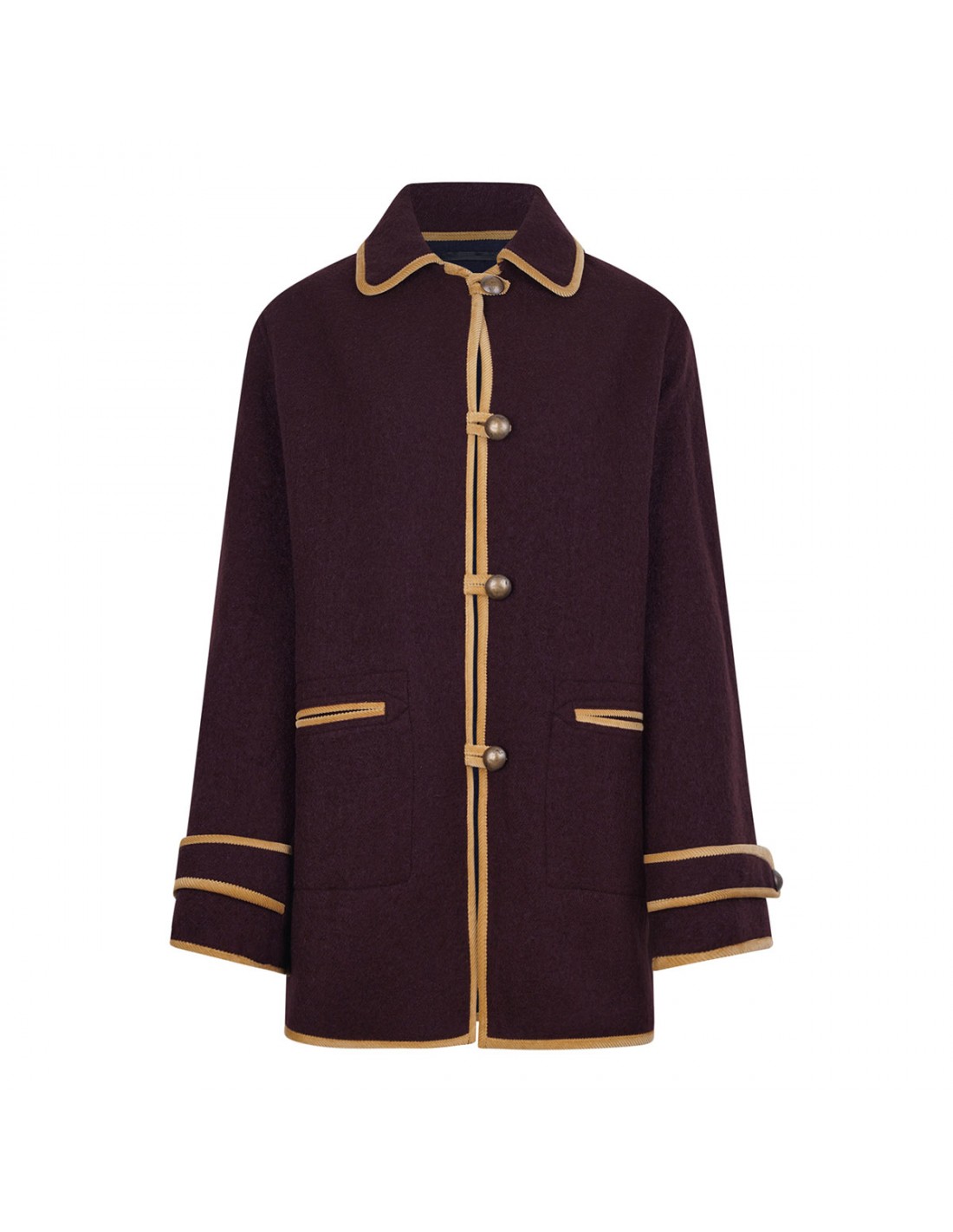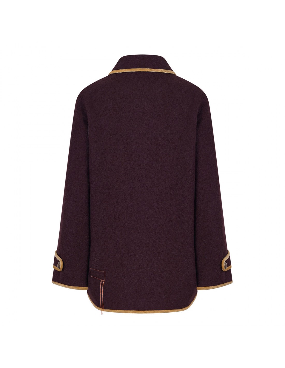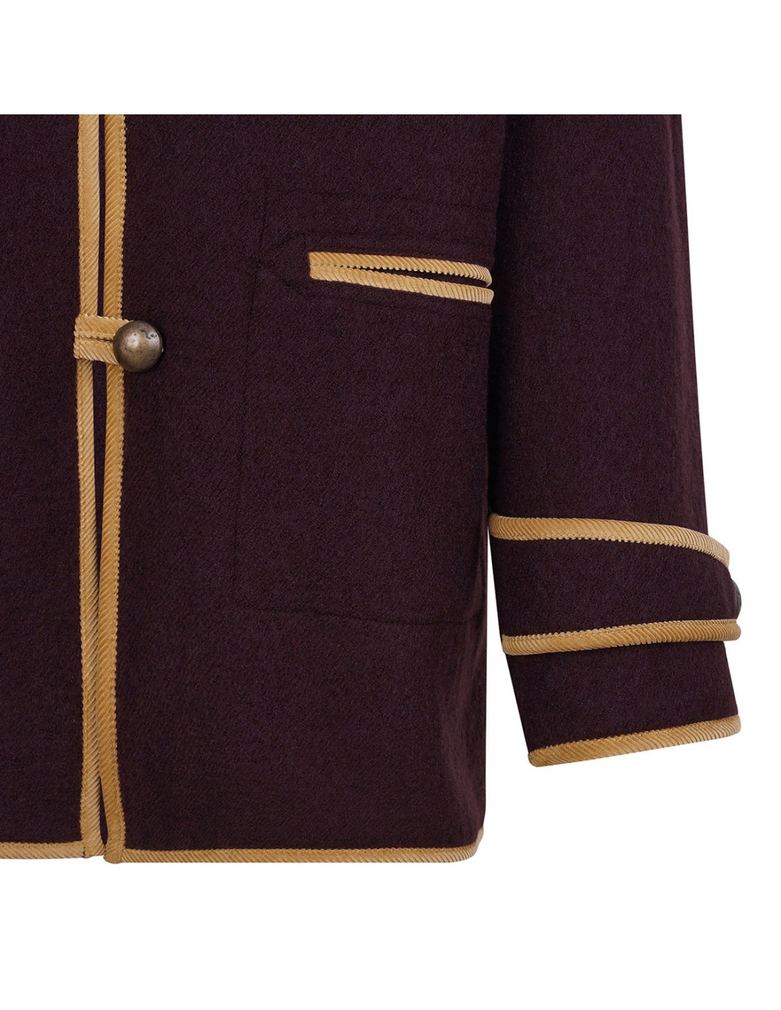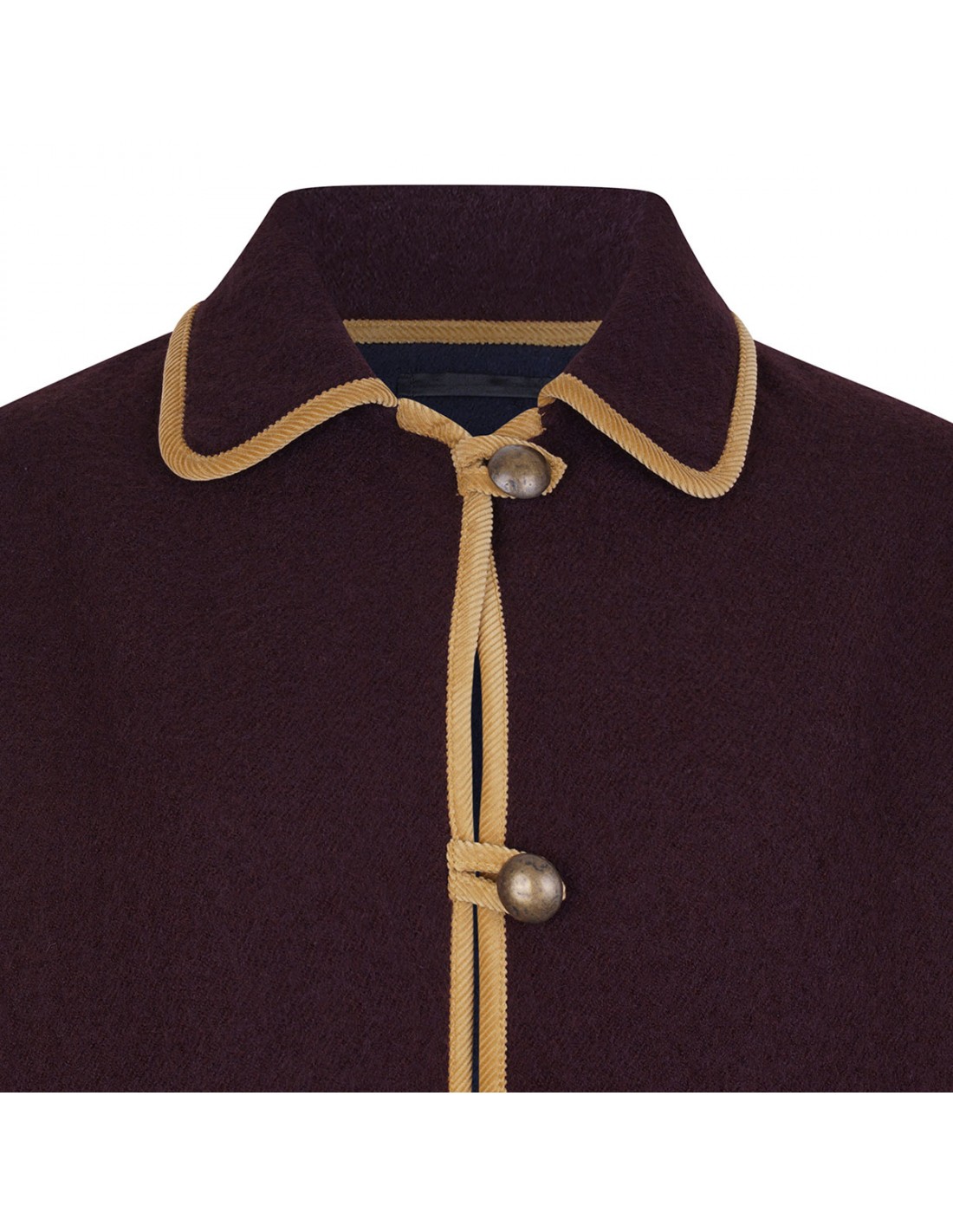 Burgundy brushed wool jacket from Fortela featuring contrasting caramel hue corduroy trims, pointed collar, adjustable cuffs with buttoned tabs, dropped shoulders, button closure.