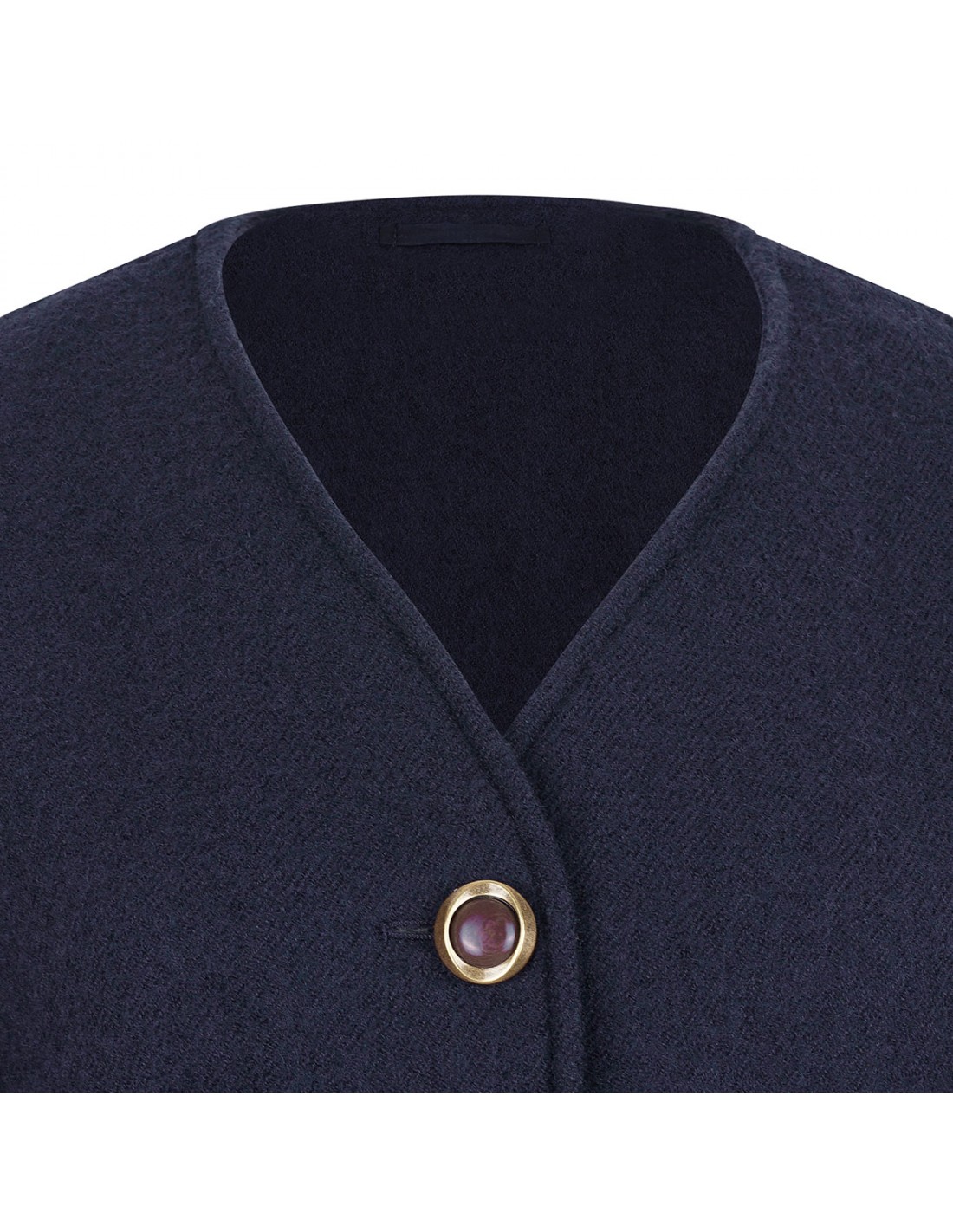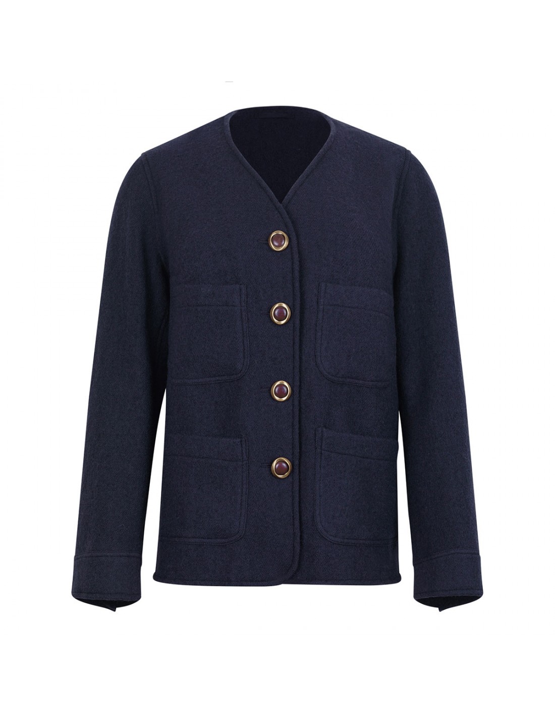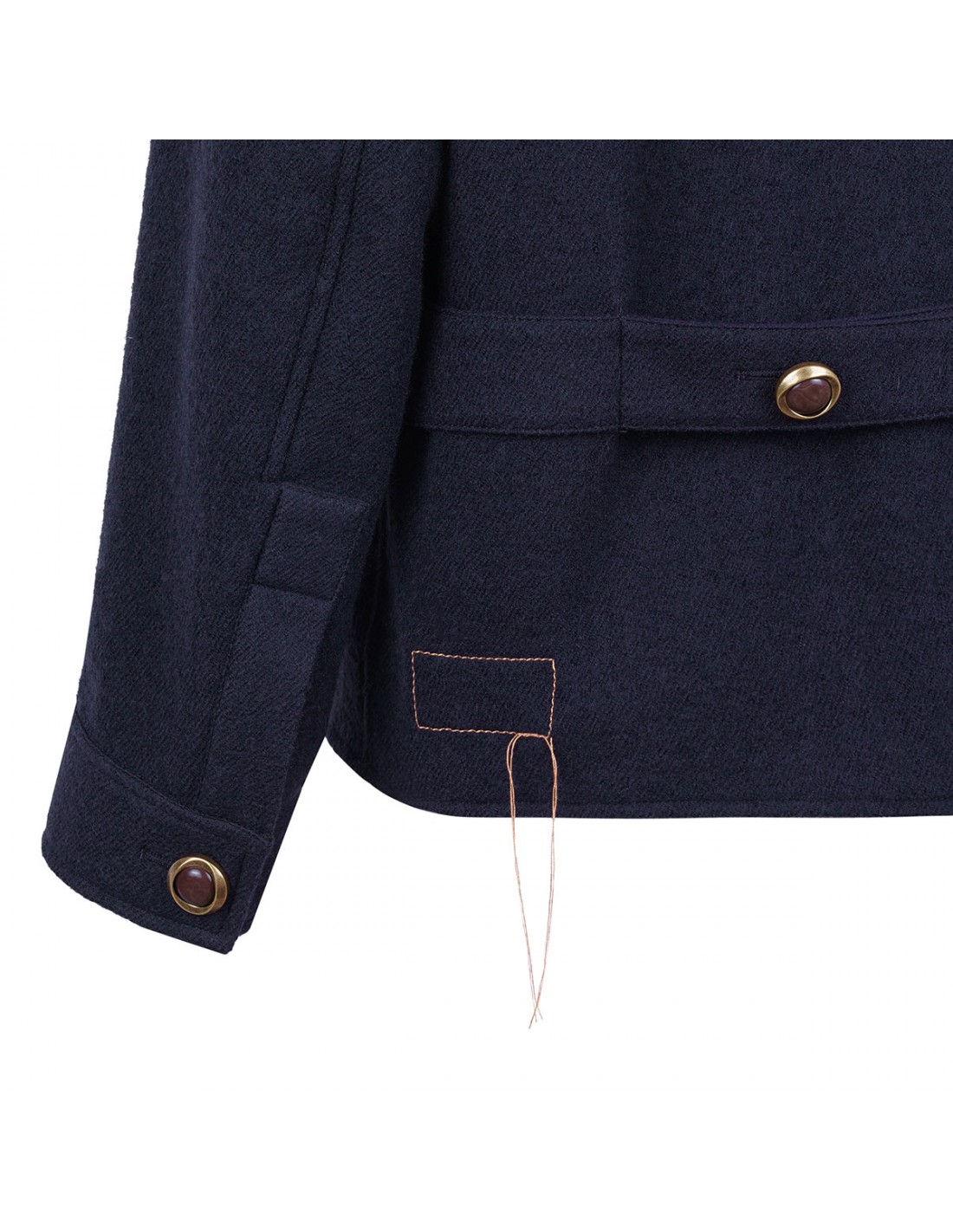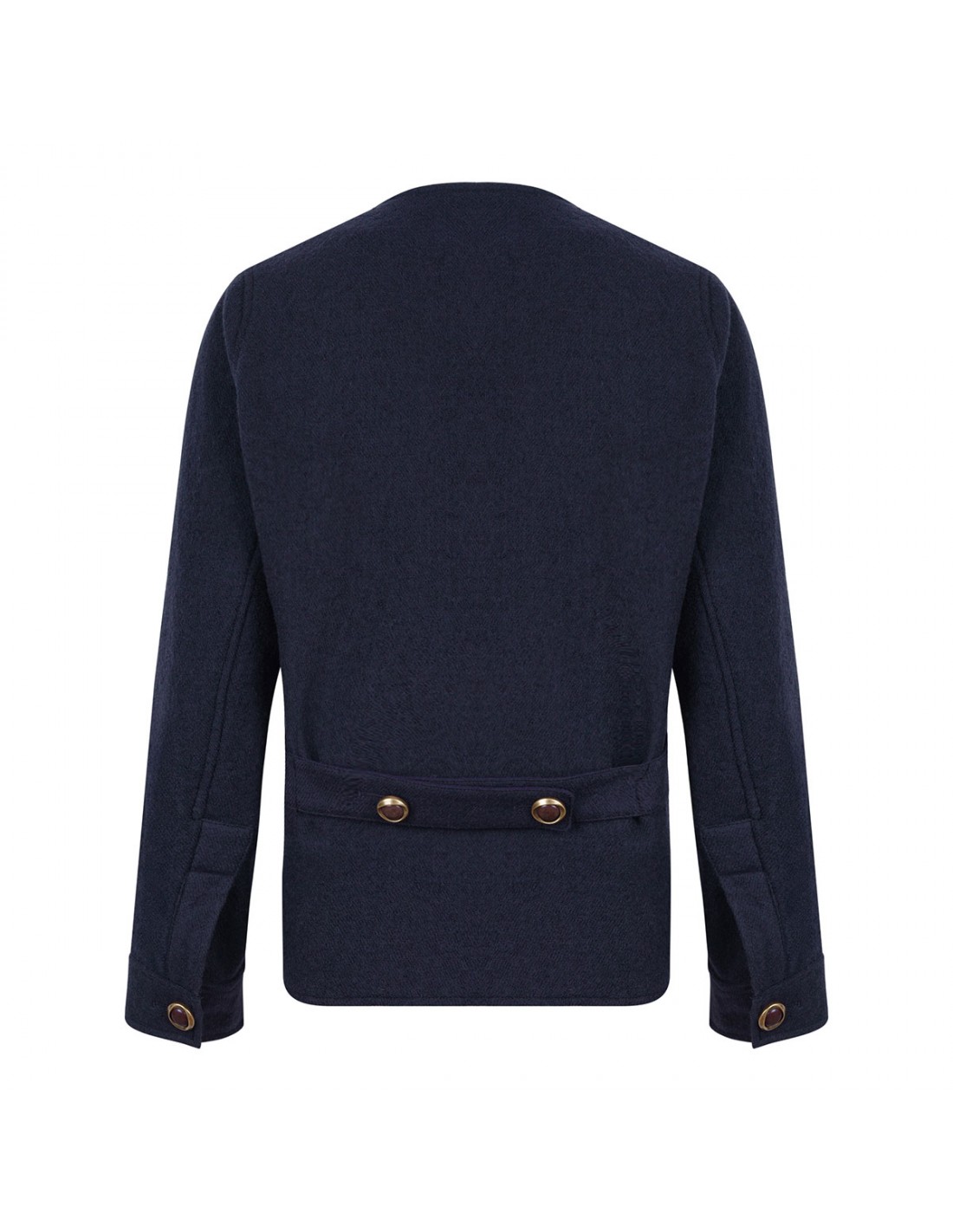 Navy wool jacket from Fortela featuring slim fit, jewel button closure on front, V-neck, four front patch pockets, long sleeves with buttoned cuffs, half belt with button detail at back.