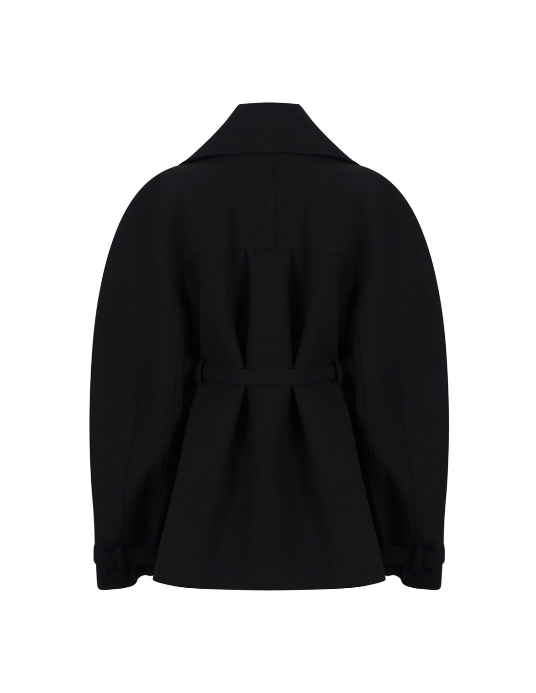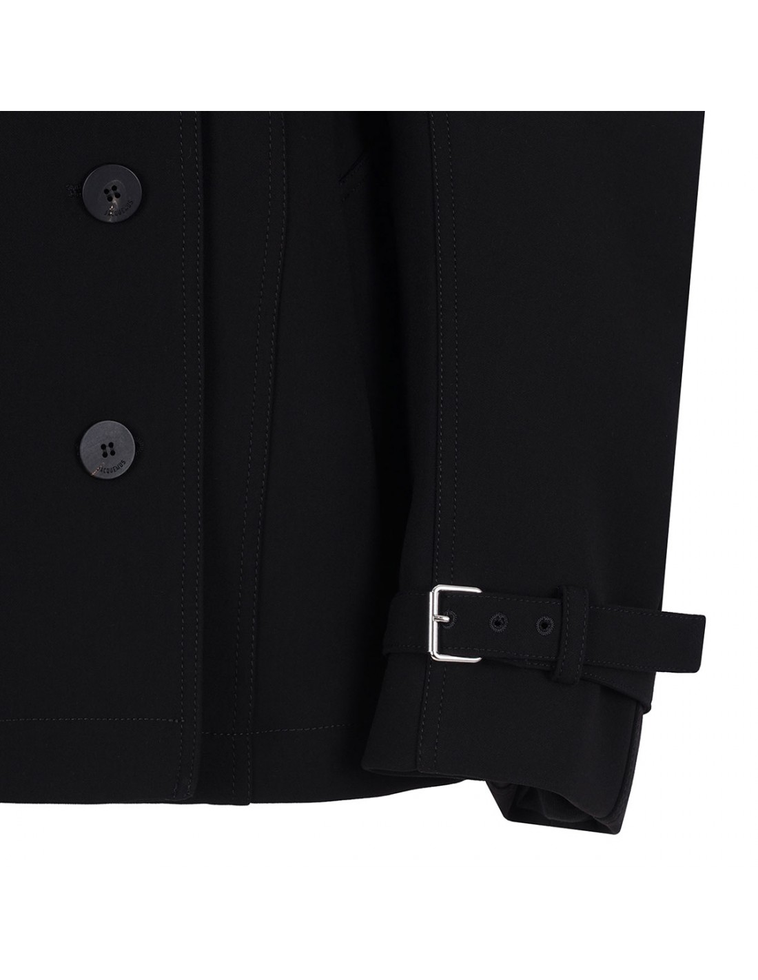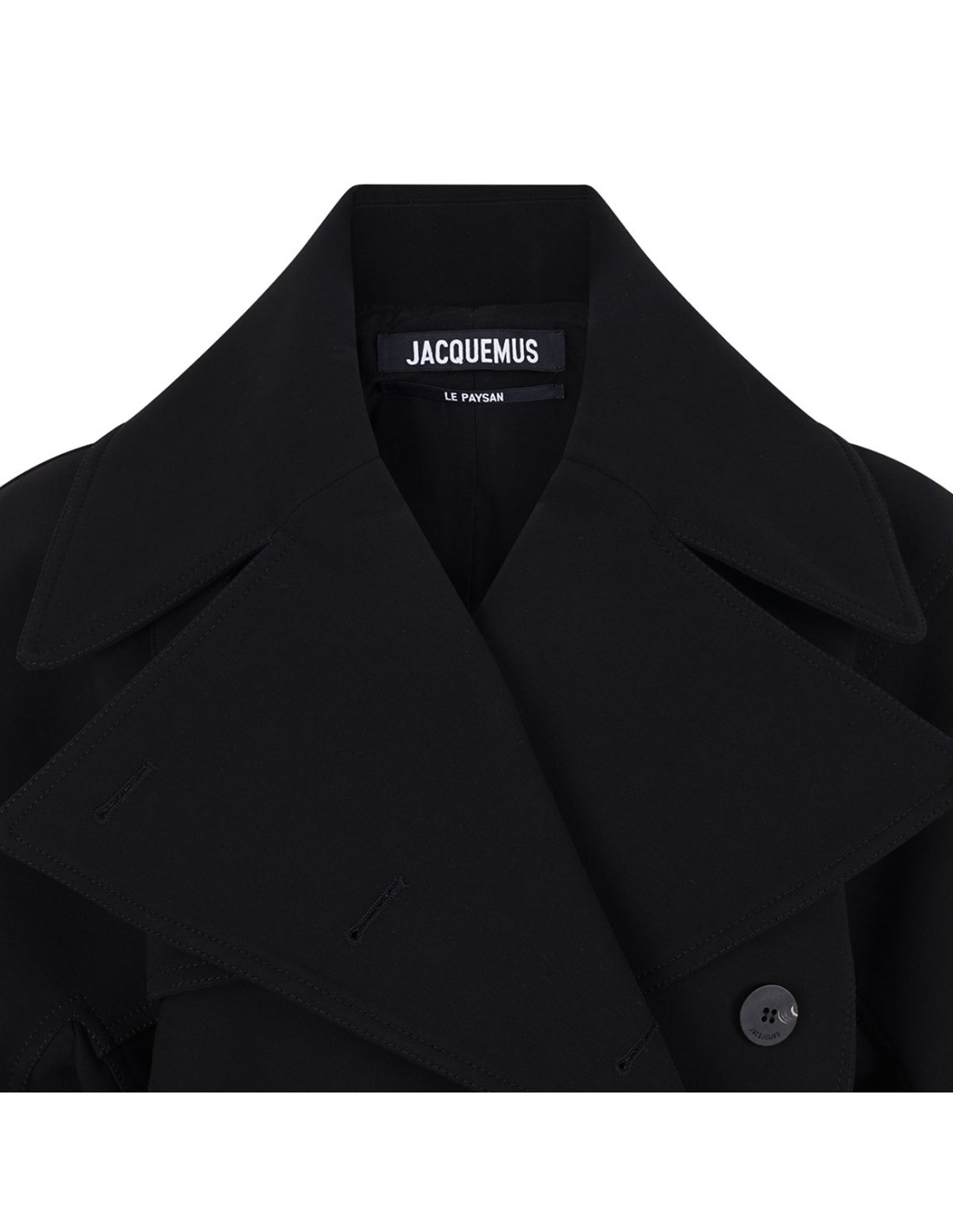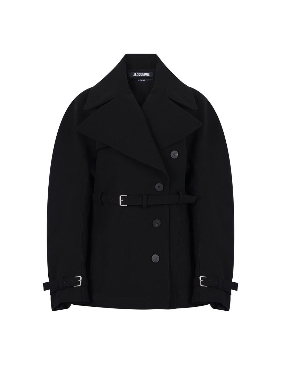 Black heat-bonded canvas The Ovalo short trench coat from Jacquemus featuring fitted shape, wide convertible lapel, double-breasted silhouette, concealed button closure, wide rounded sleeves with wrist straps, cinched waist with volume around the hip, belt loops on the waistband, adjustable thin belt with square metal buckle, large welt pockets, back yoke and back gathered volume.