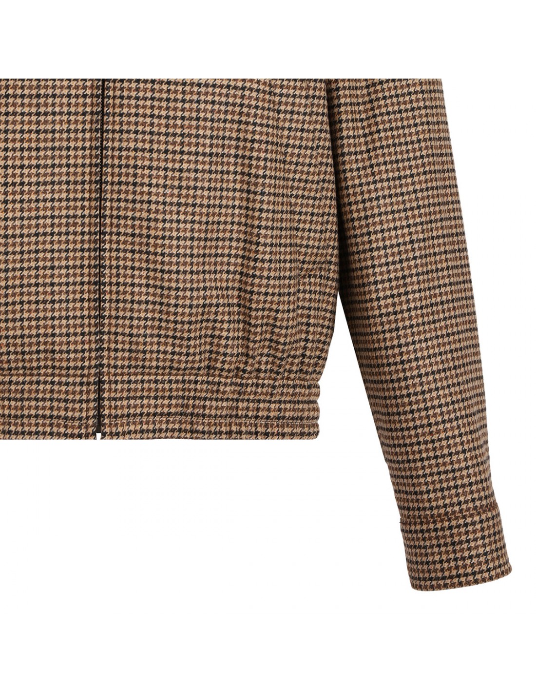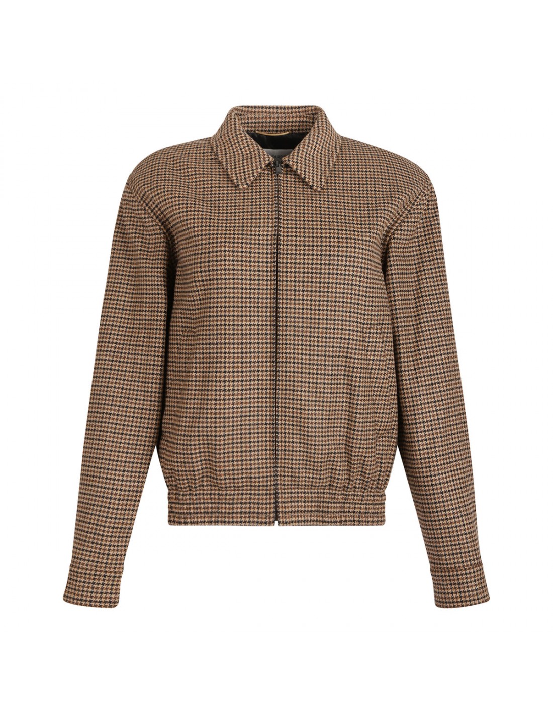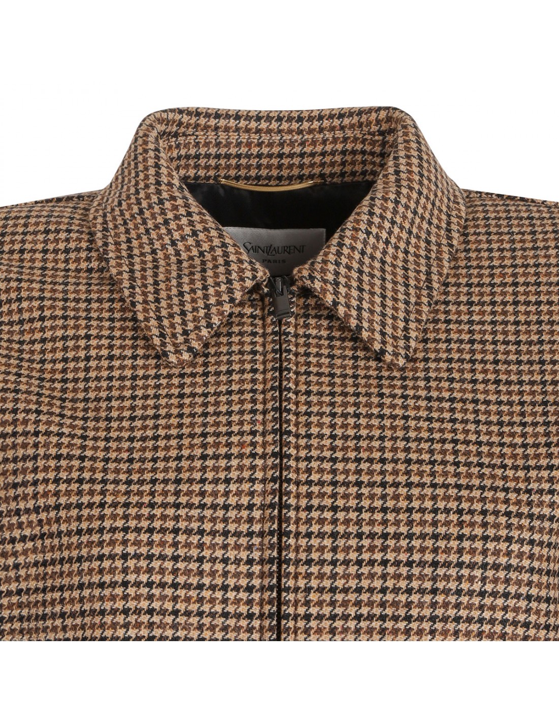 Beige, brown and black wool blouson jacket from Saint Laurent featuring puppytooth motif, pointed collar, dropped shoulders, shirred waist, zip fastening along front, side pockets, adjustable cuffs, elastic waist, cotton and viscose twill lining.