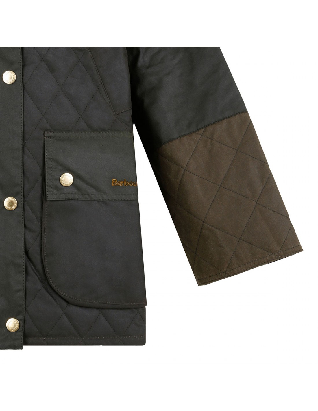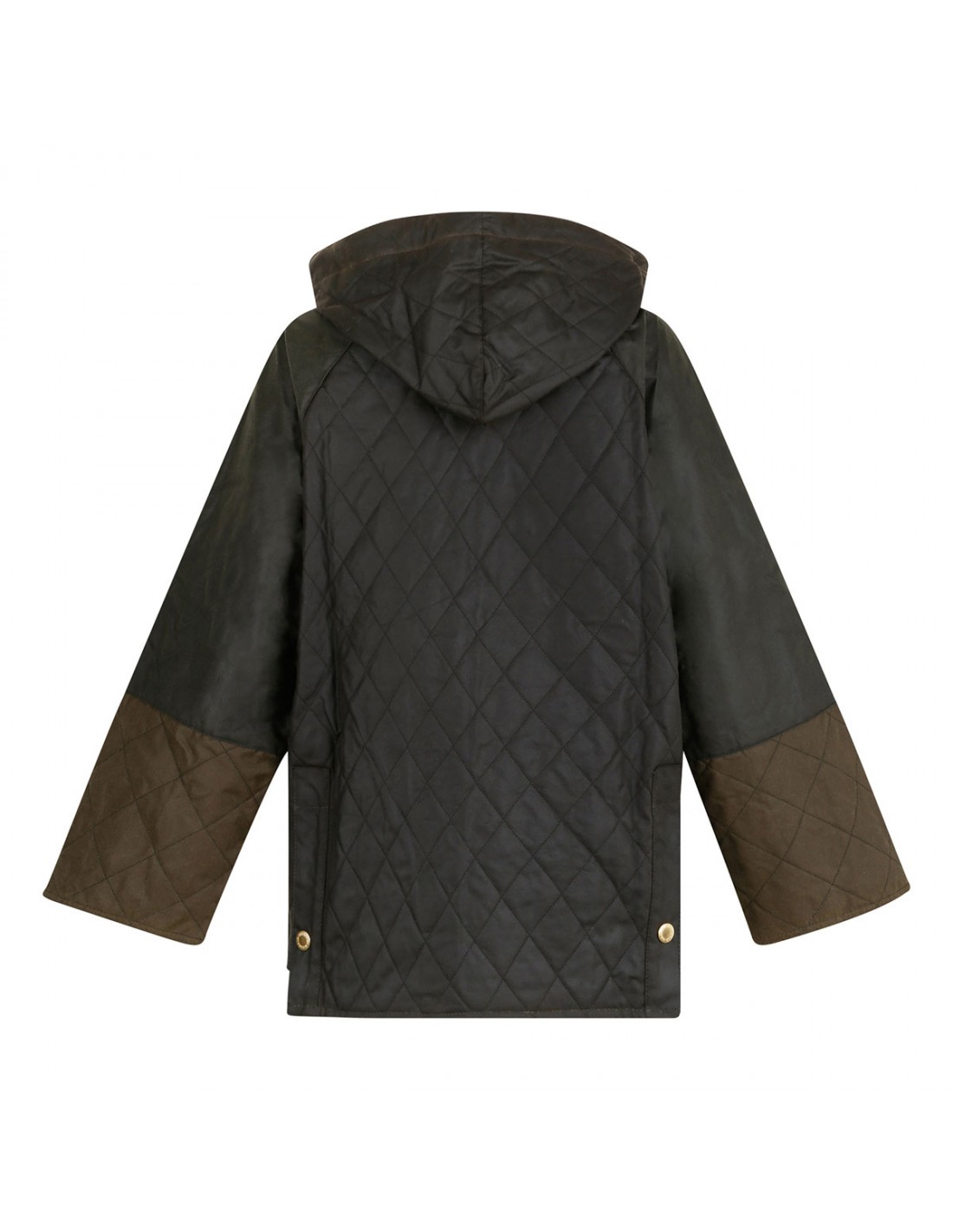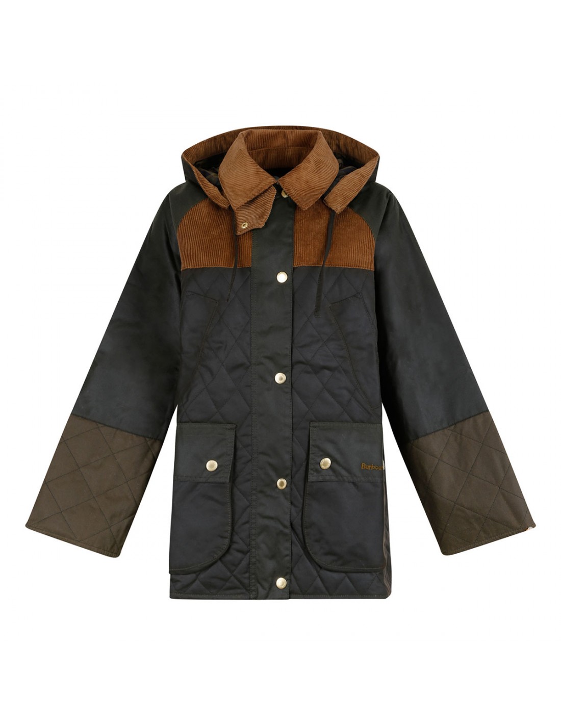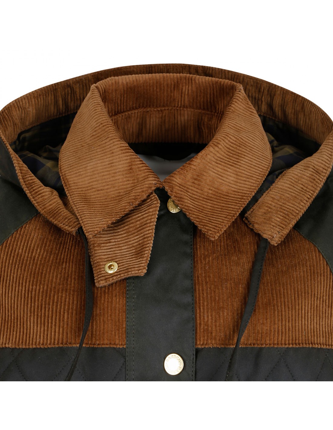 Olive green waxed cotton and army-green shell Imelda jacket from Barbour featuring contrasting corduroy collar and trims, quilted design, snaps and zip fastening on front, relaxed silhouette, front patch pockets.