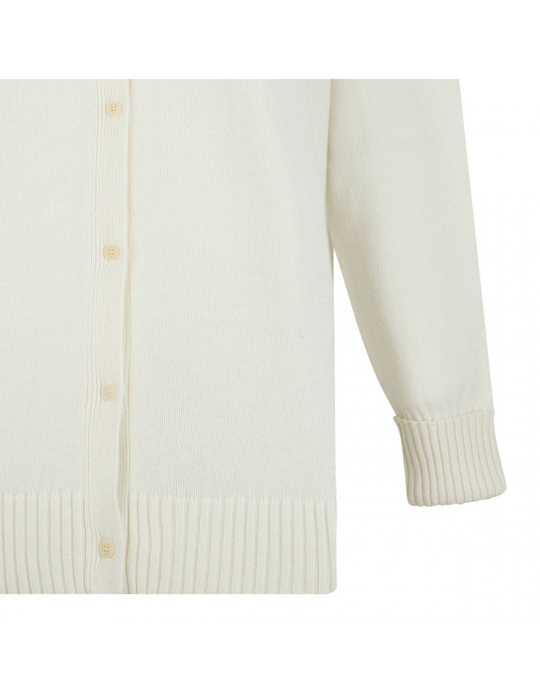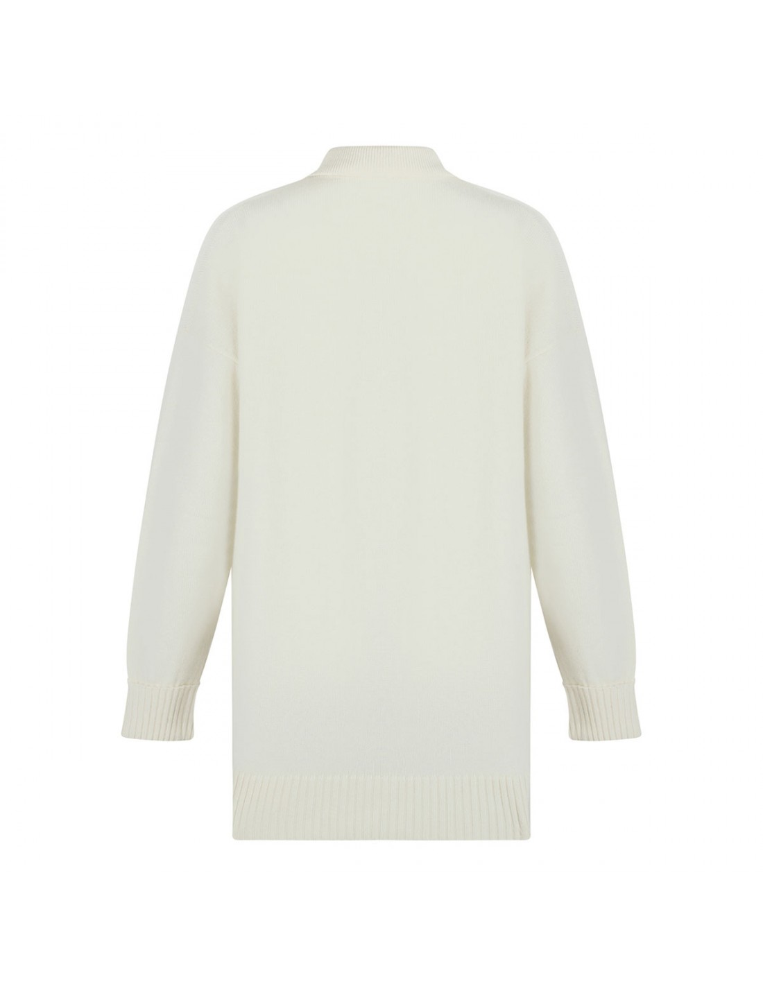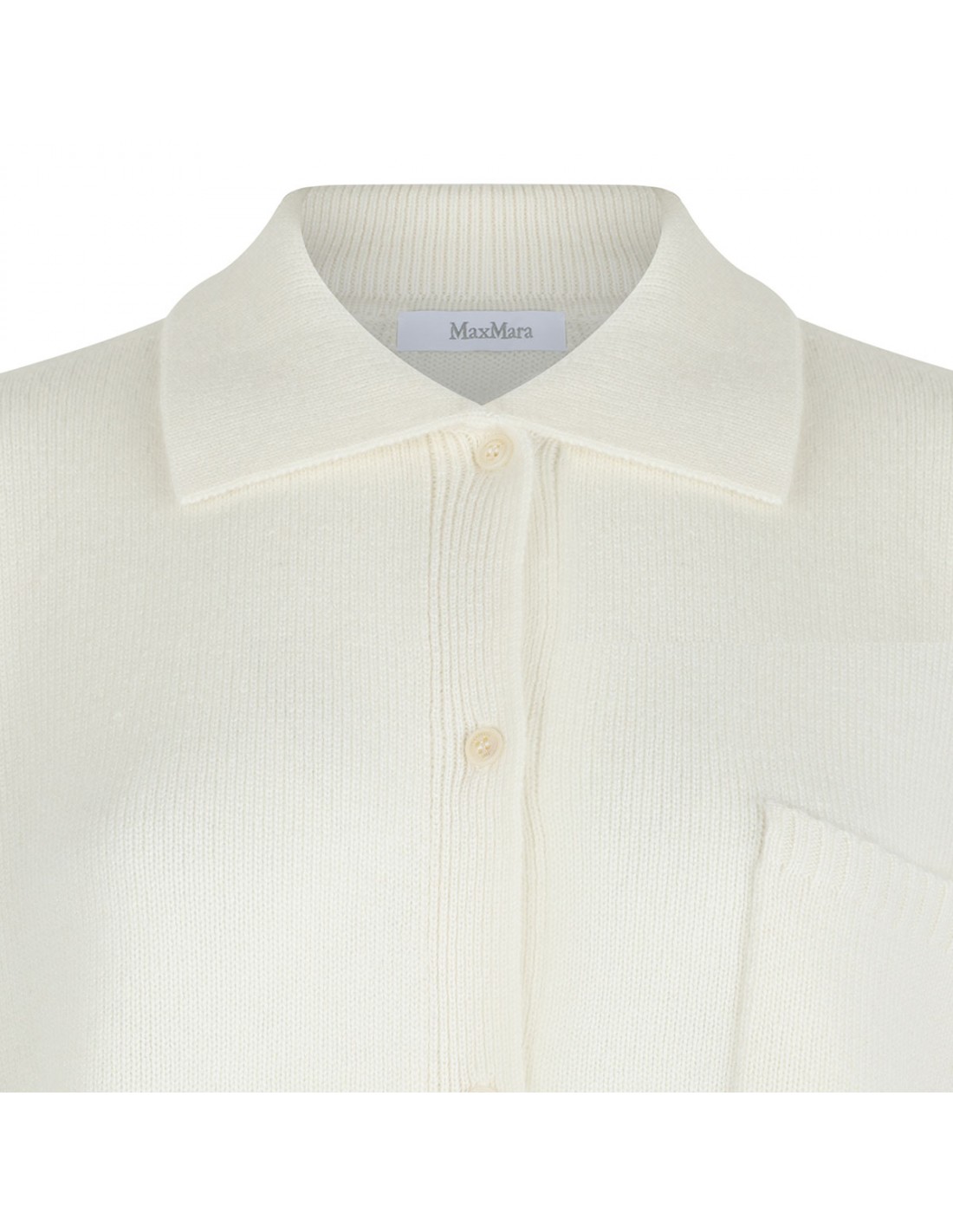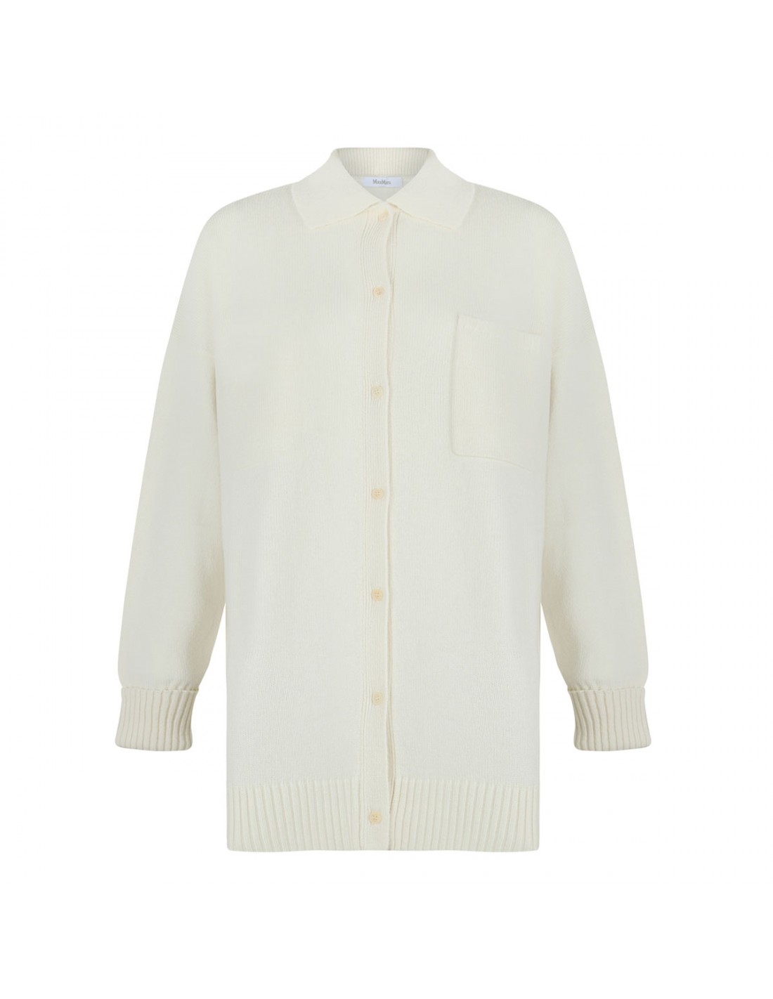 White knit cashmere Bull shirt jacket from Max Mara featuring shirt pointed collar, loose fit, long sleeves with wide cuffs, small side slits, button fastening on front, ribbed-knit cuffs and hem.