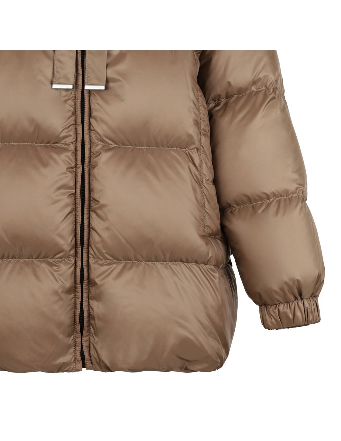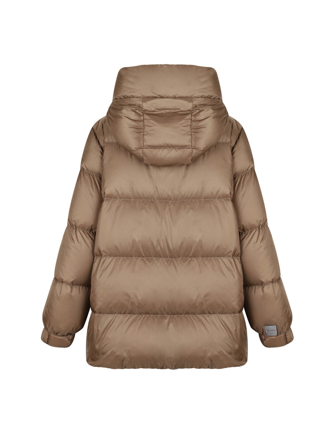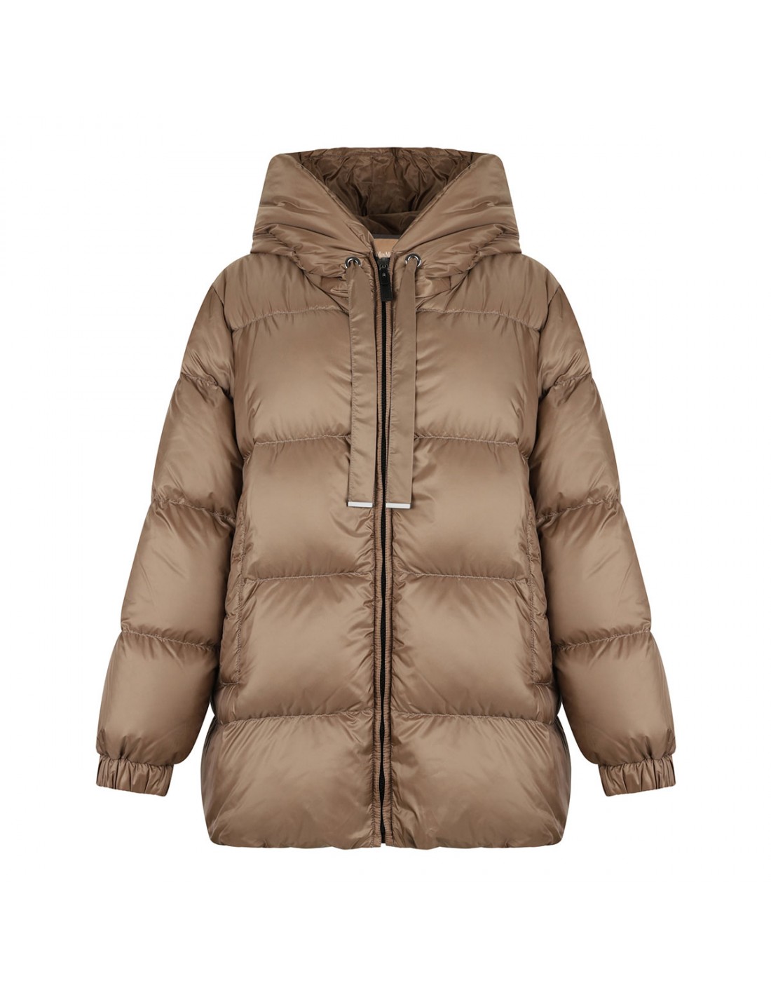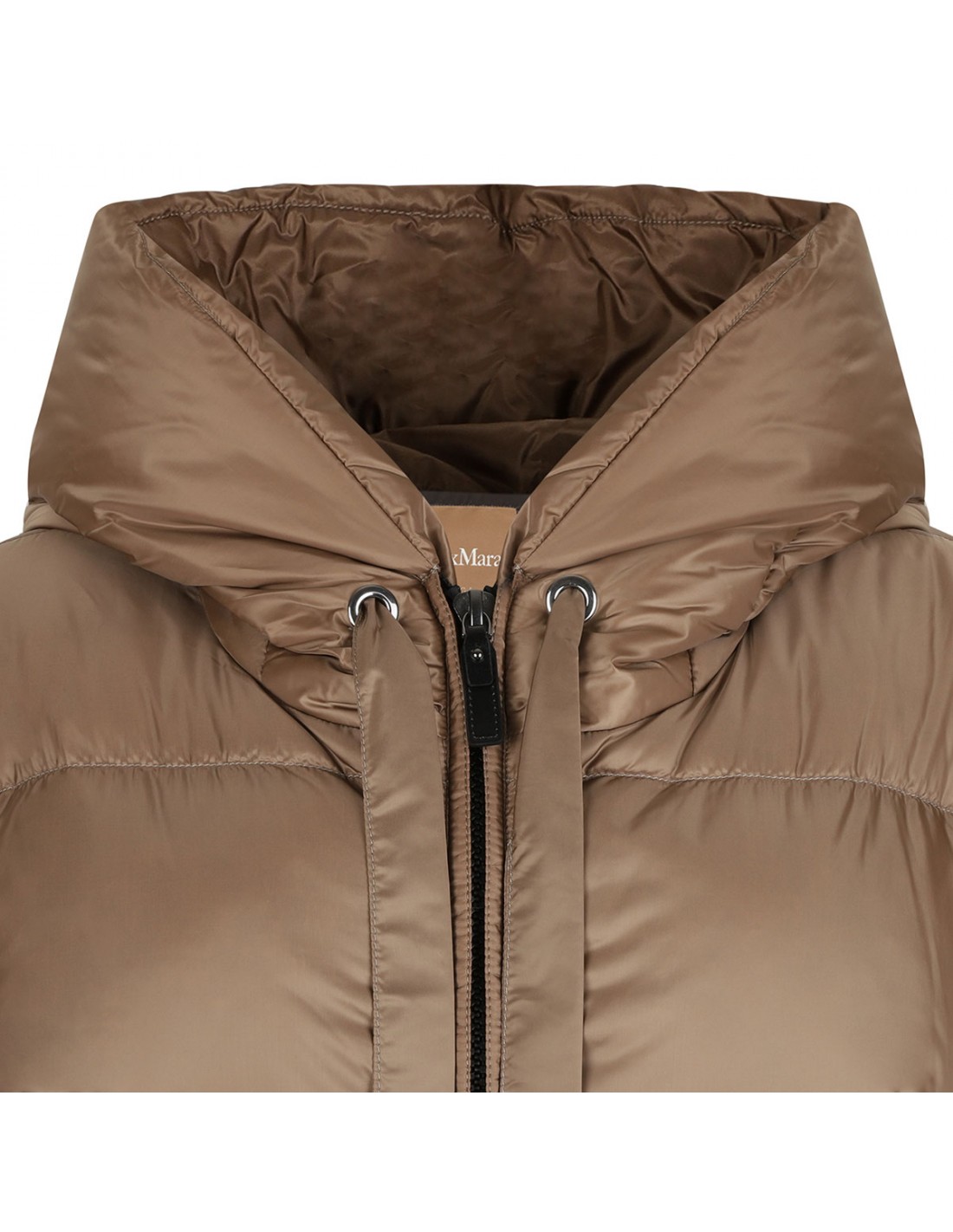 Brown water-repellent canvas Seia down jacket from Max Mara The Cube featuring hood with drawstring, long sleeves with elastic cuffs, zip fastening with leather zip-pull at front, side welt pockets, goose-down padding.