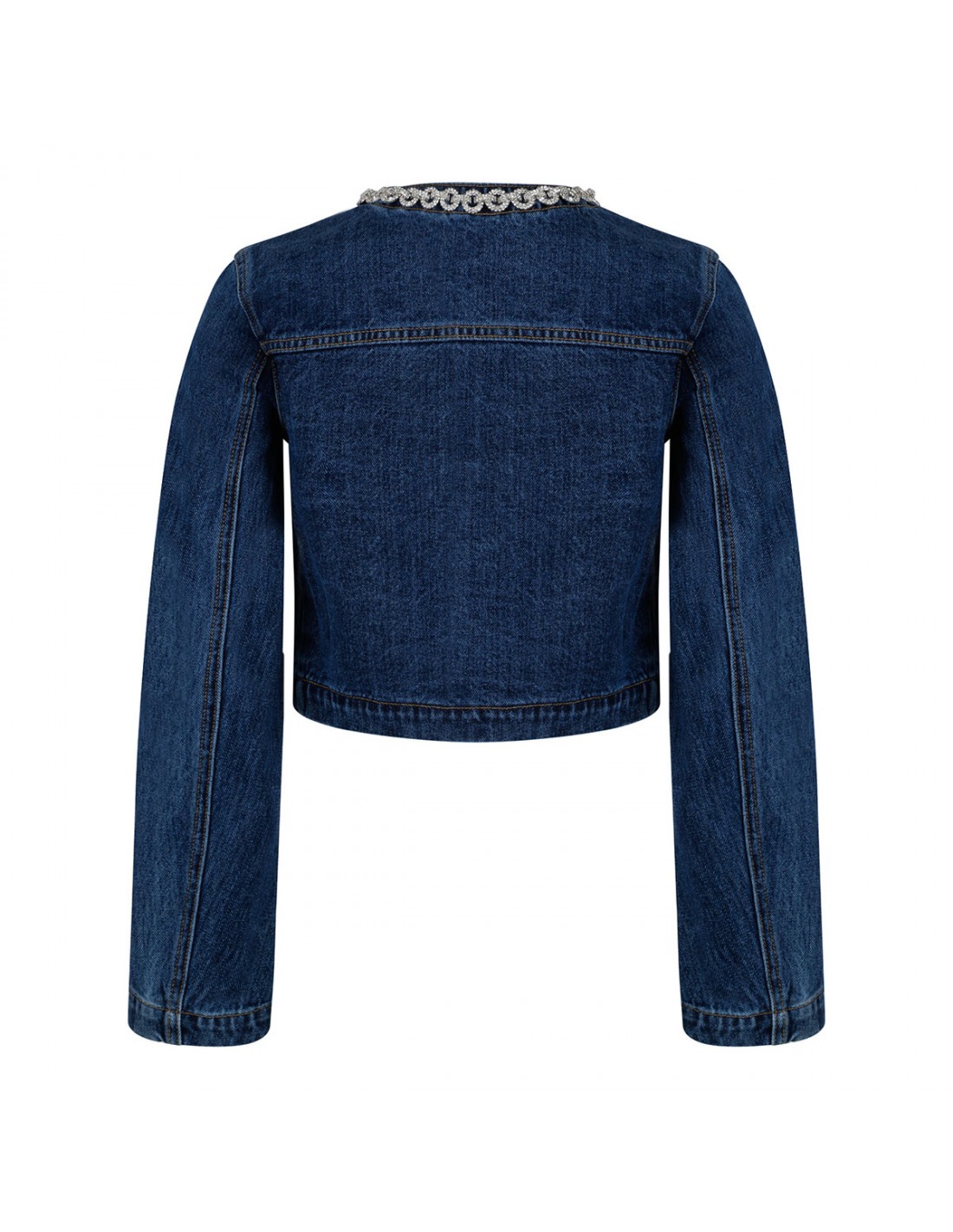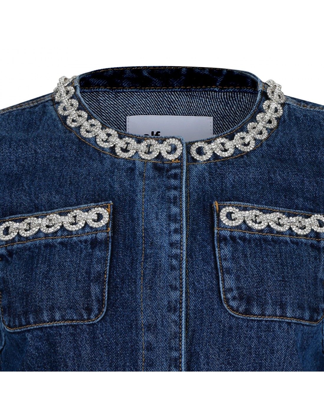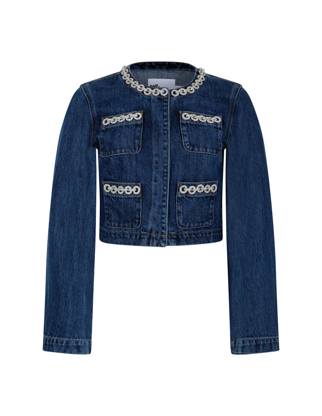 Blue denim jacket from Self-Portrait featuring crystal chain trims, button fastening along front, cropped length, relaxed fit, functional pockets.