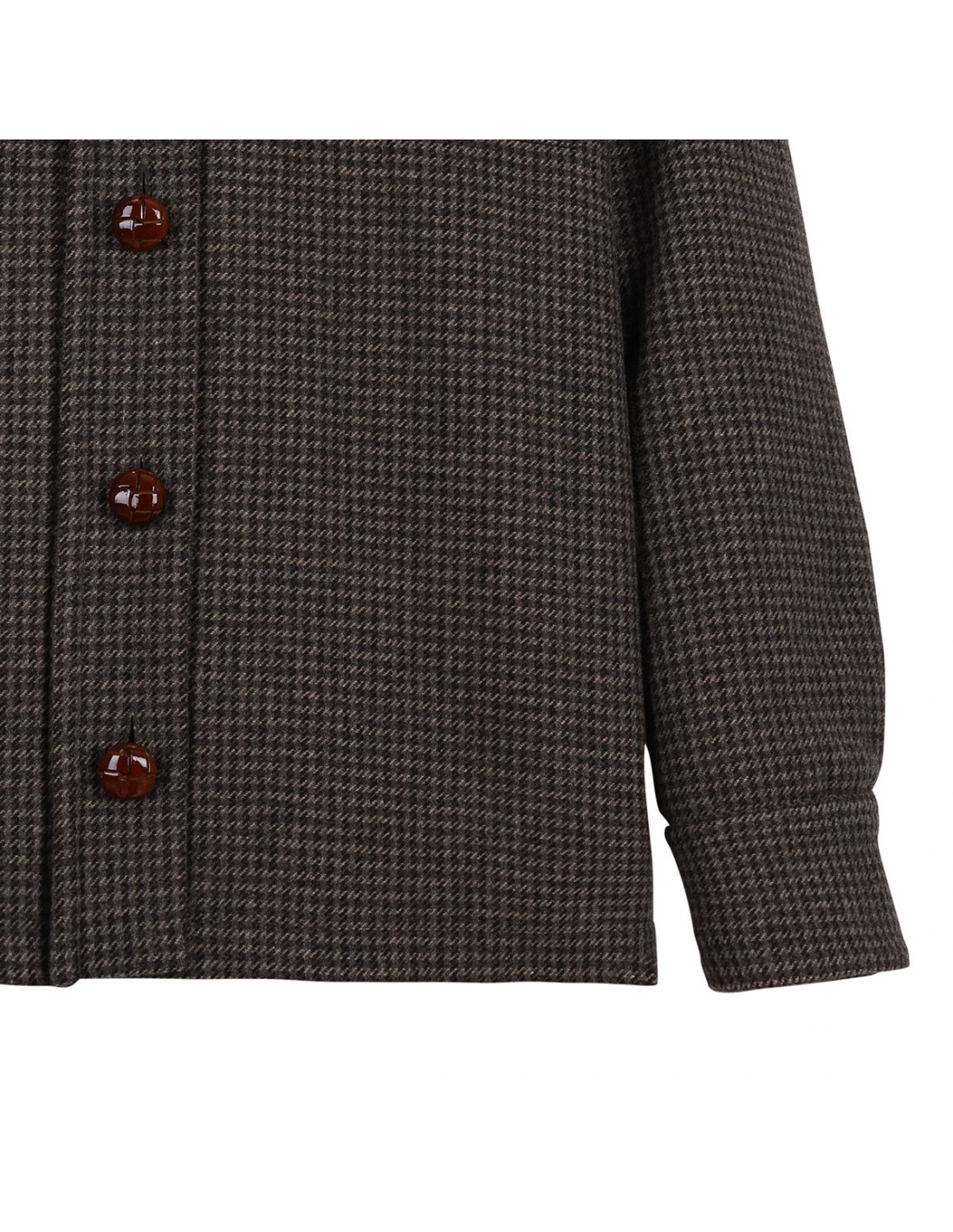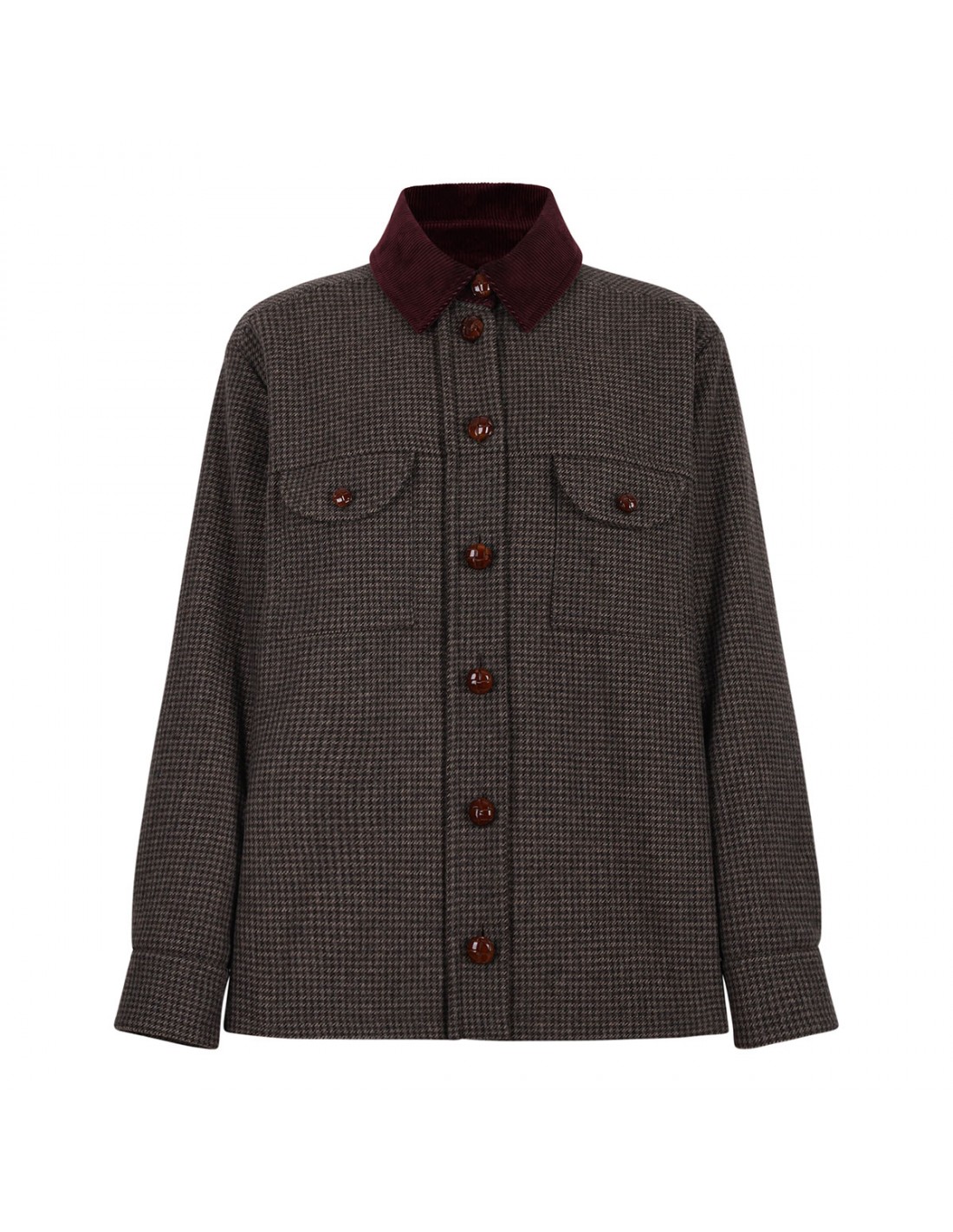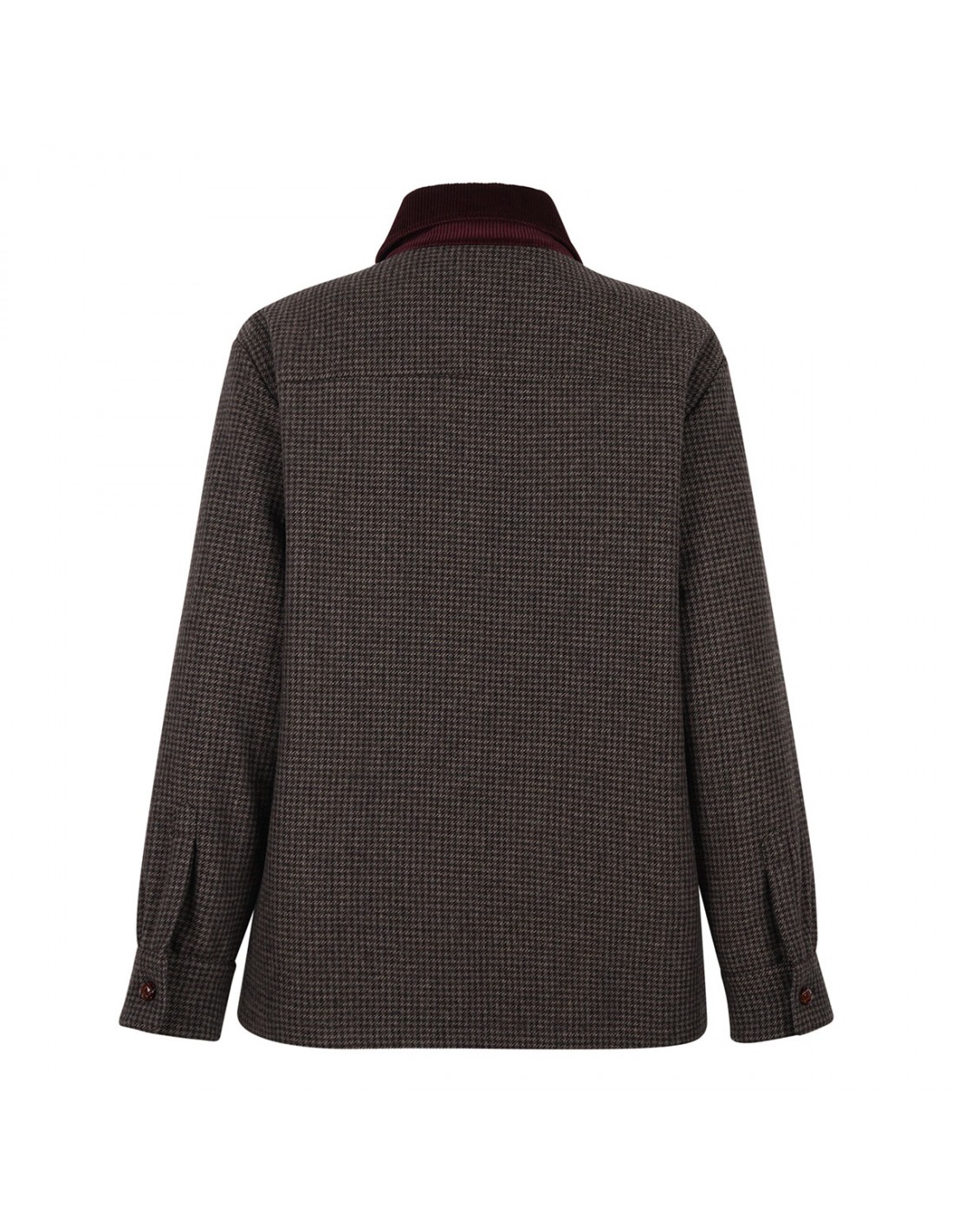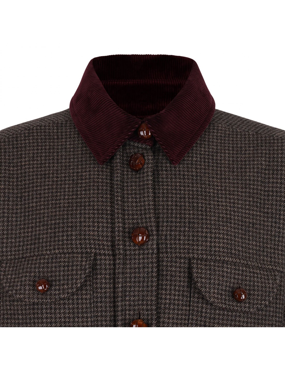 Earthy-tone wool blend Badis Berber jacket from Blazé Milano featuring houndstooth pattern, contrasting burgundy corduroy collar, leather loden-effect button fastening, chest buttoned flap pockets, oversized fit, buttoned cuffs, dark chocolate branded lining.