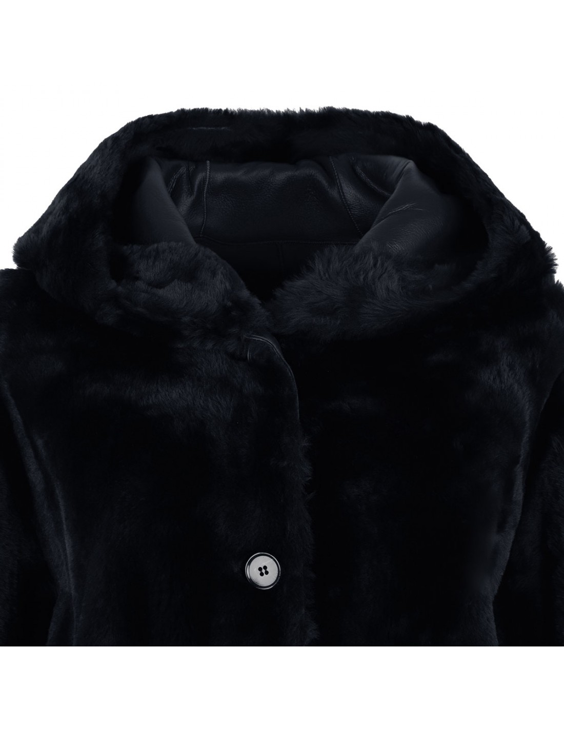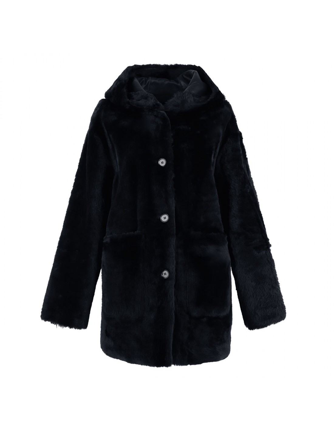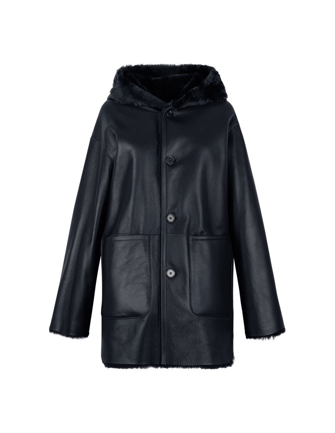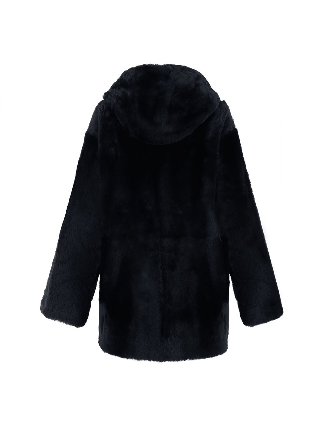 Blue Ambra reversible long jacket from Arma featuring one side in nappa and other side in shearling, fixed hood, patch pockets and button closure.