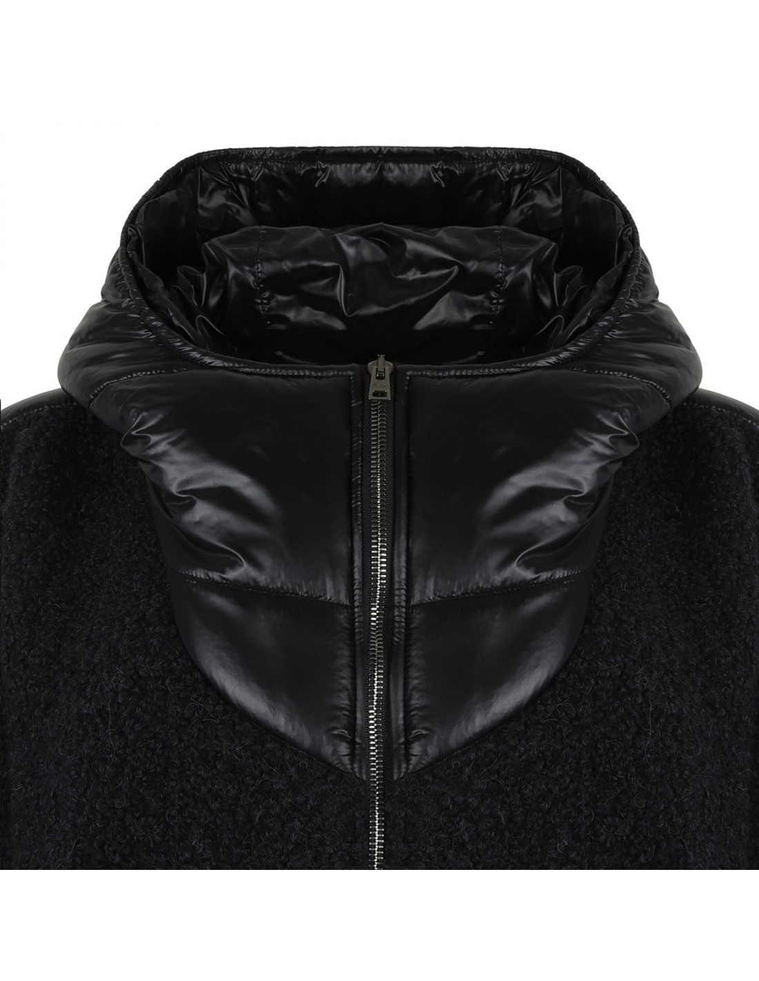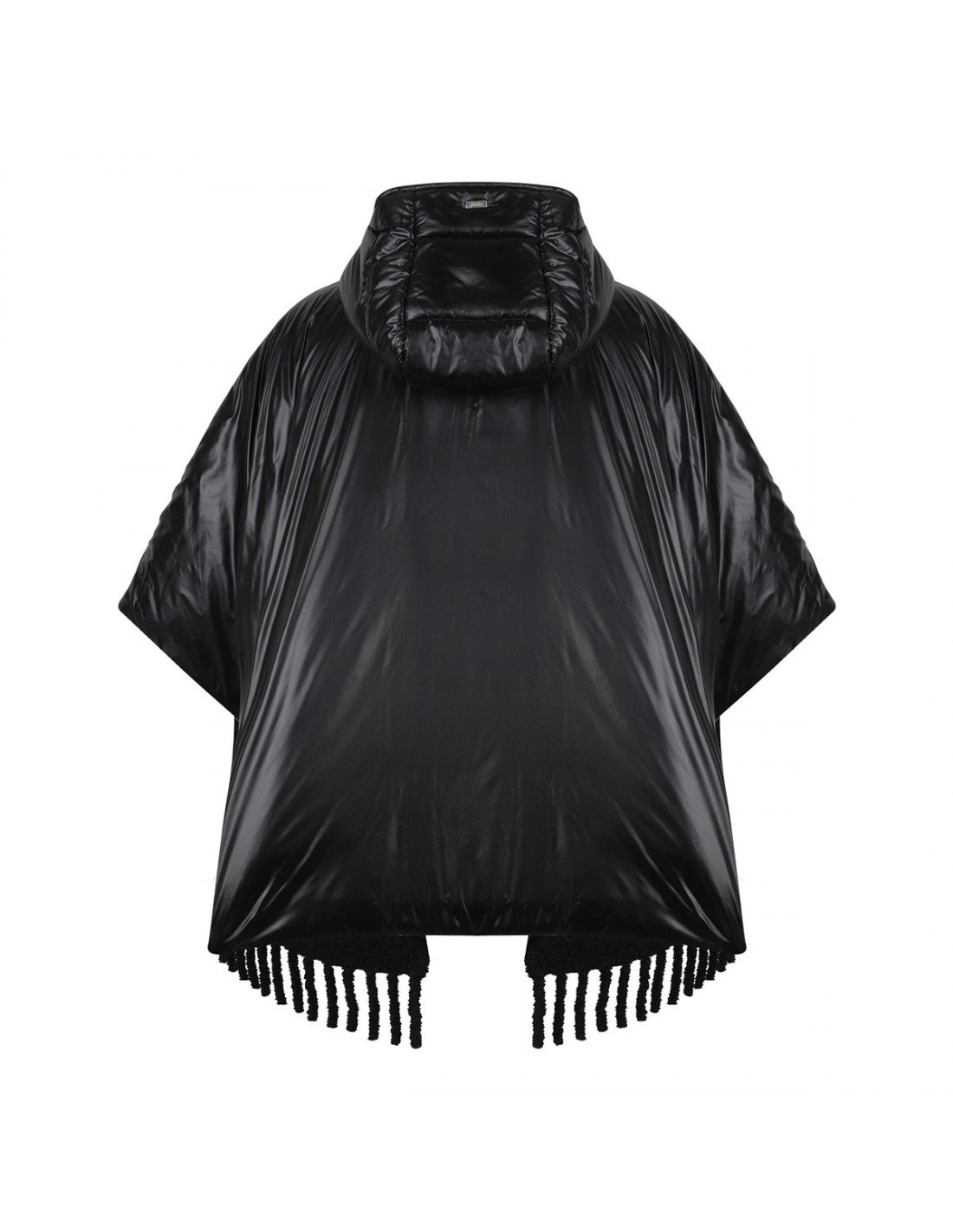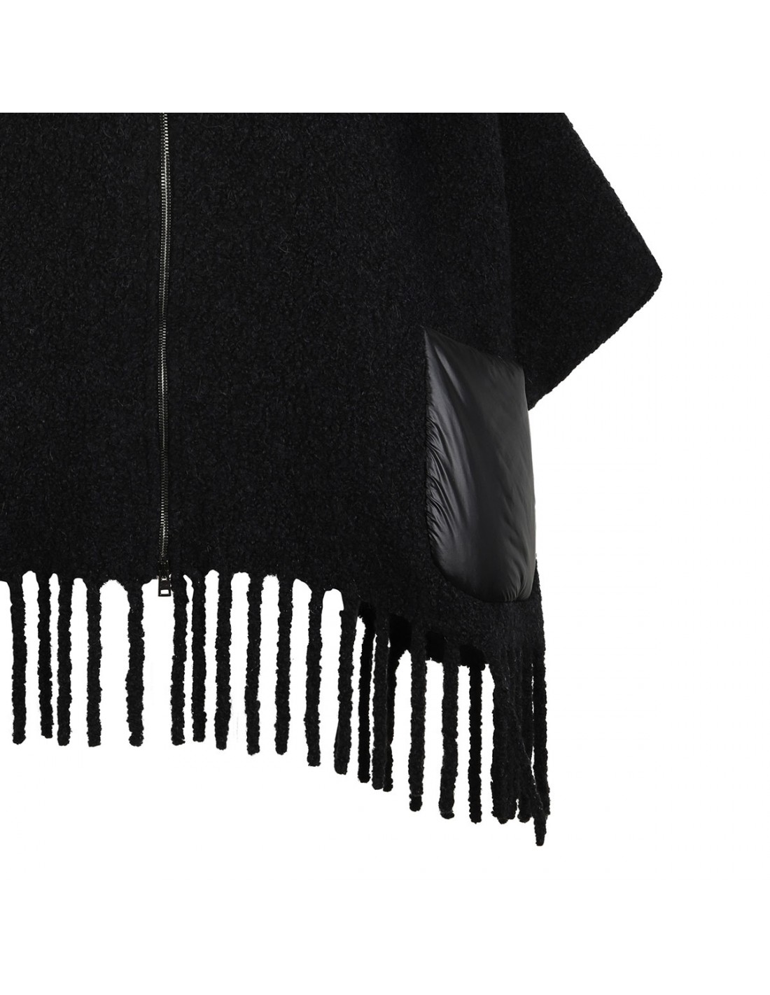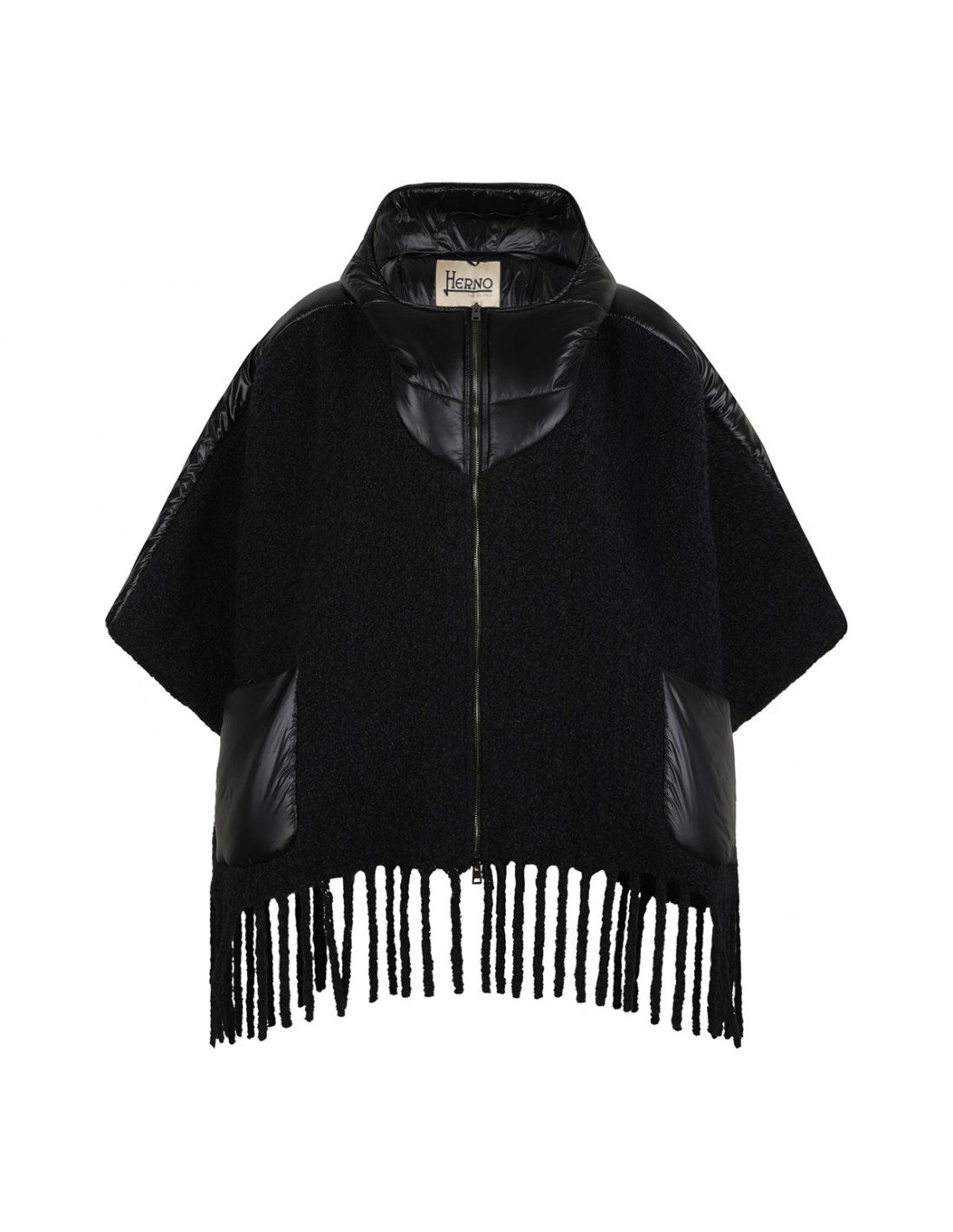 Black alpaca poncho from Herno featuring iconic Nylon Ultralight fabric pockets, stand collar and hood, fringing at the bottom, relaxed fit, kimono sleeves, two-way zip fastening along side.