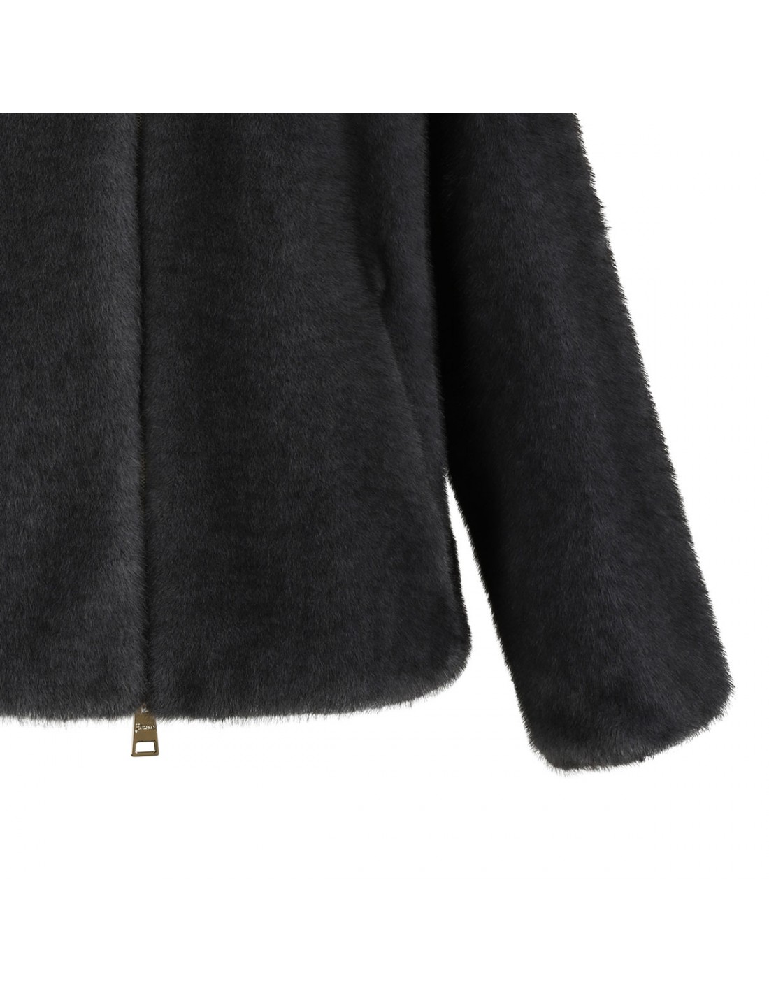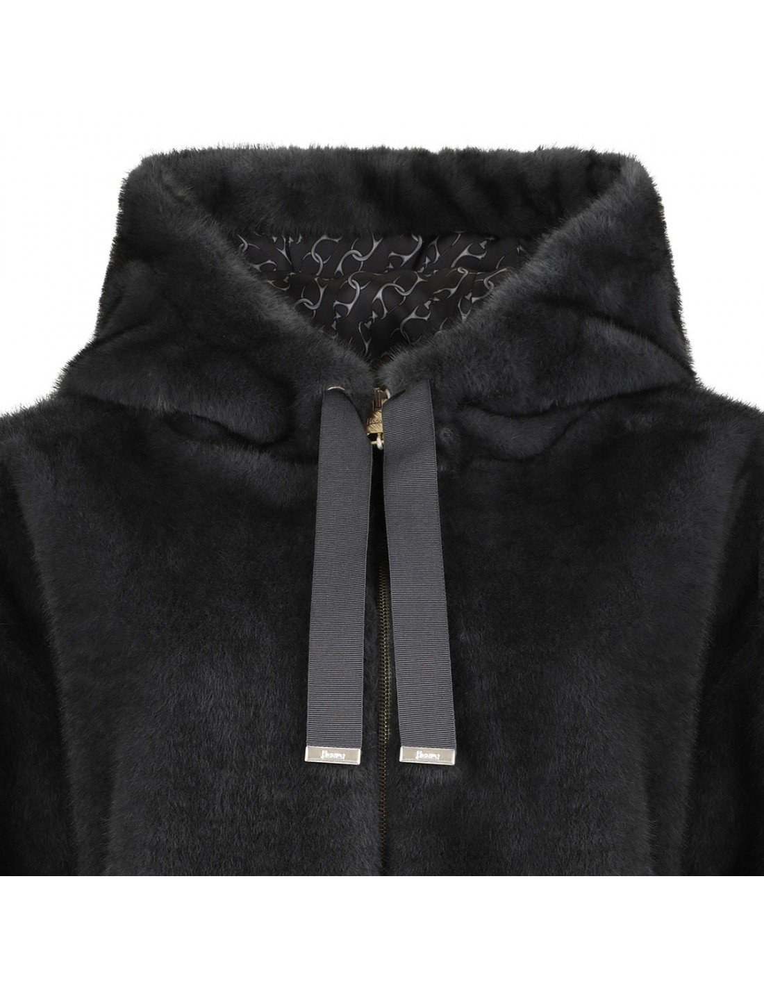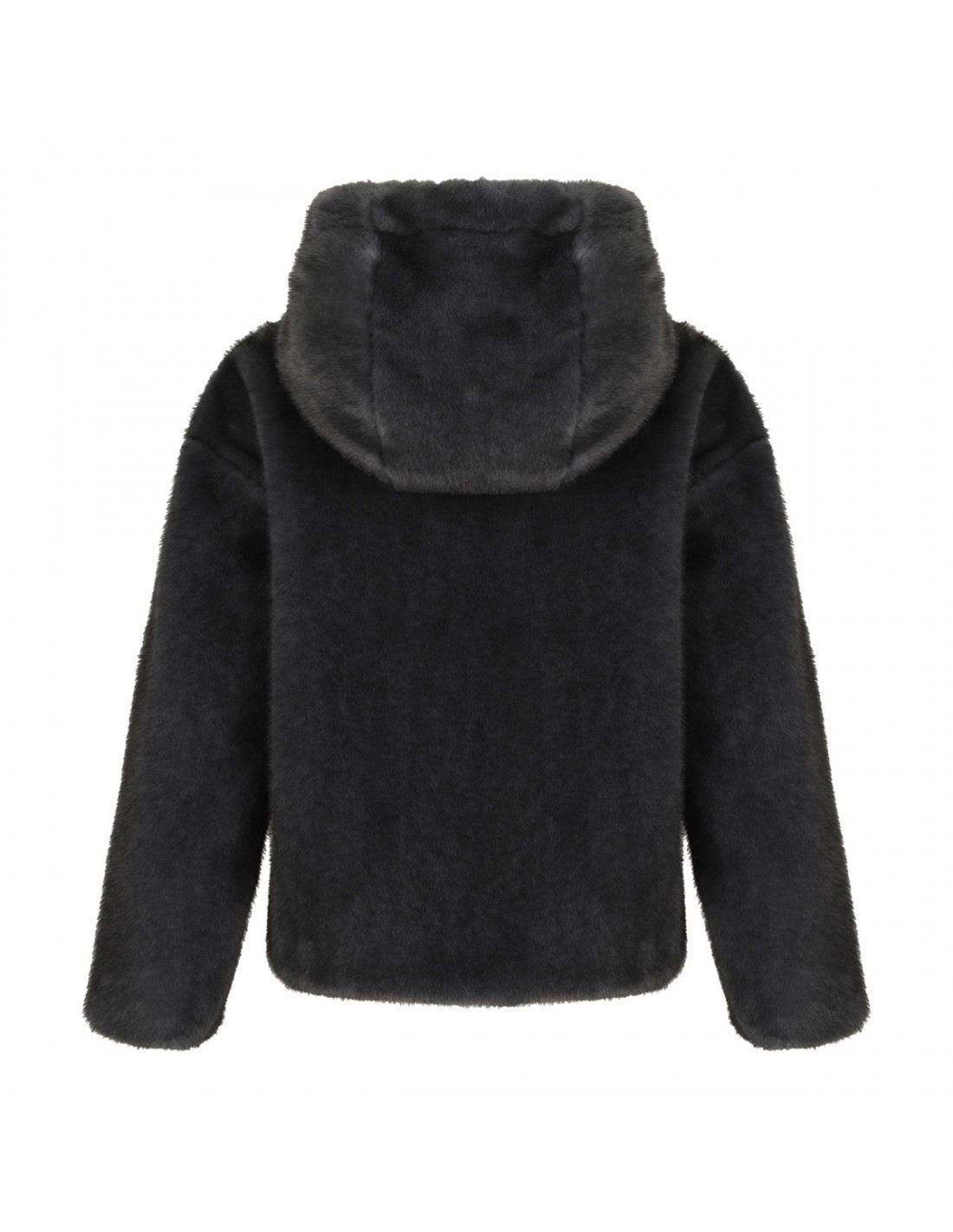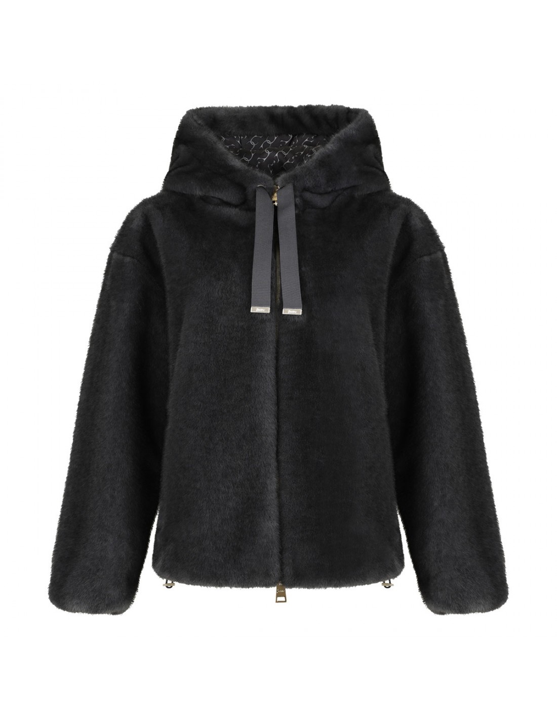 Anthracite hue soft faux fur jacket from Herno featuring fixed hood with drawstring, two-way zip fastening along front, side pockets and logo jacquard lining.