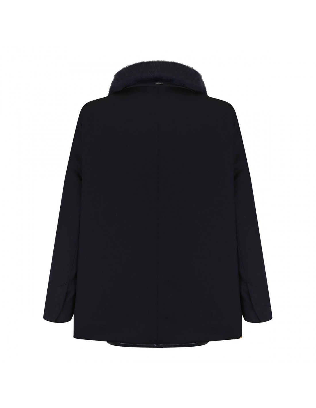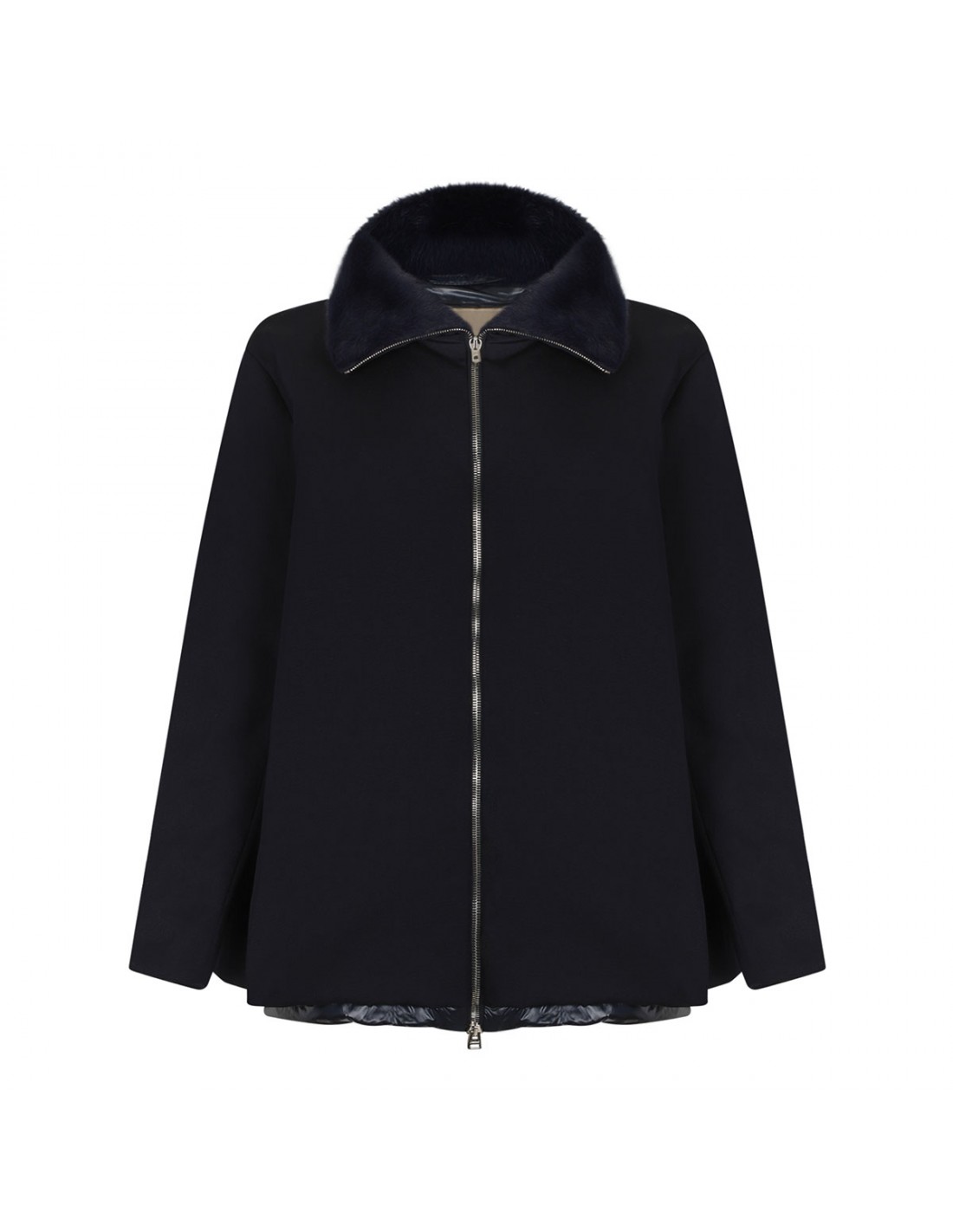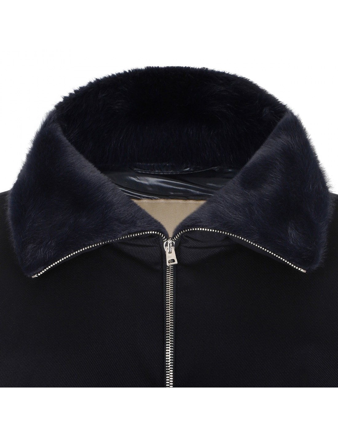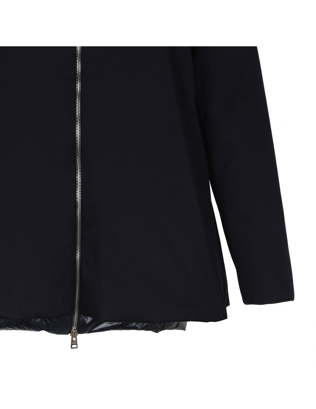 Herno blue down jacket in Loro Piana Green Store System fabric, featuring two way zip fastening along front, protective collar, side pockets, long sleeves.