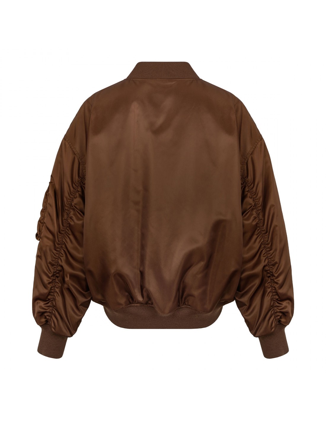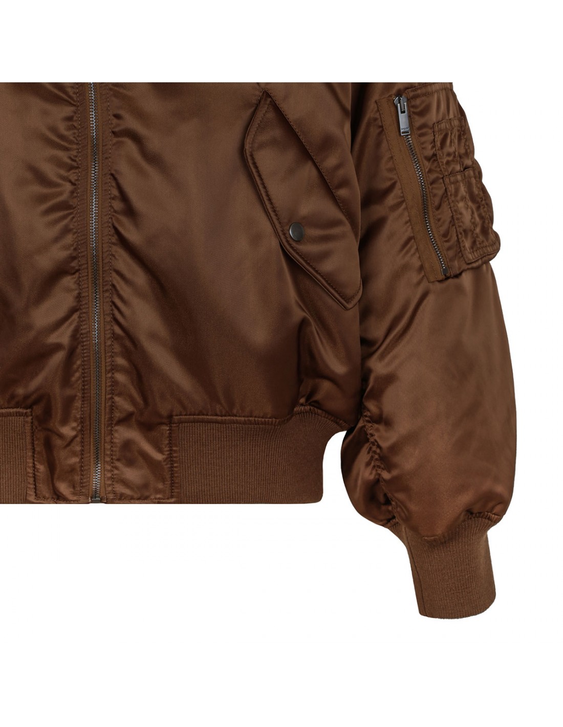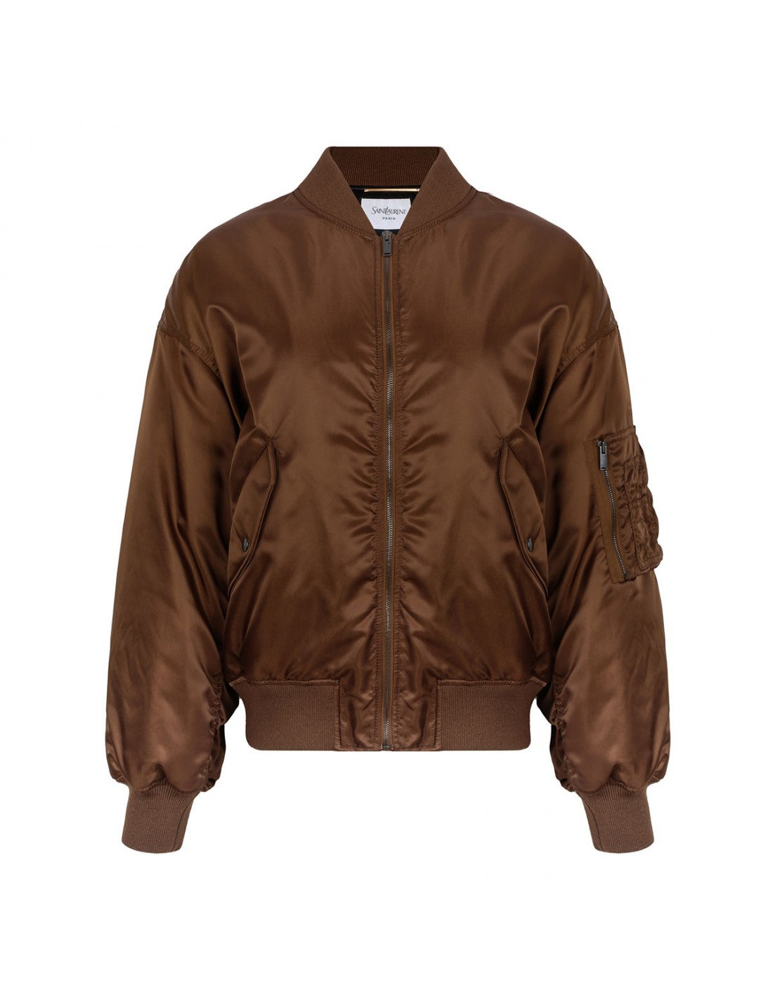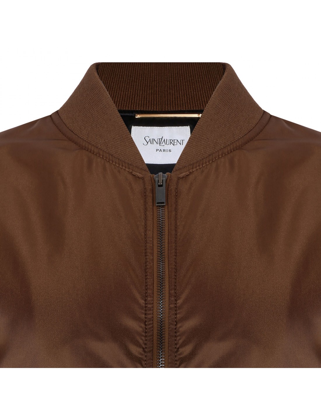 Light brown shiny nylon padded bomber jacket from Saint Laurent featuring dropped shoulders, zip fastening along front, snap-button flap pockets, zip utility pocket at sleeve, baseball collar, ribbed-knit trims, viscose and cotton lining.