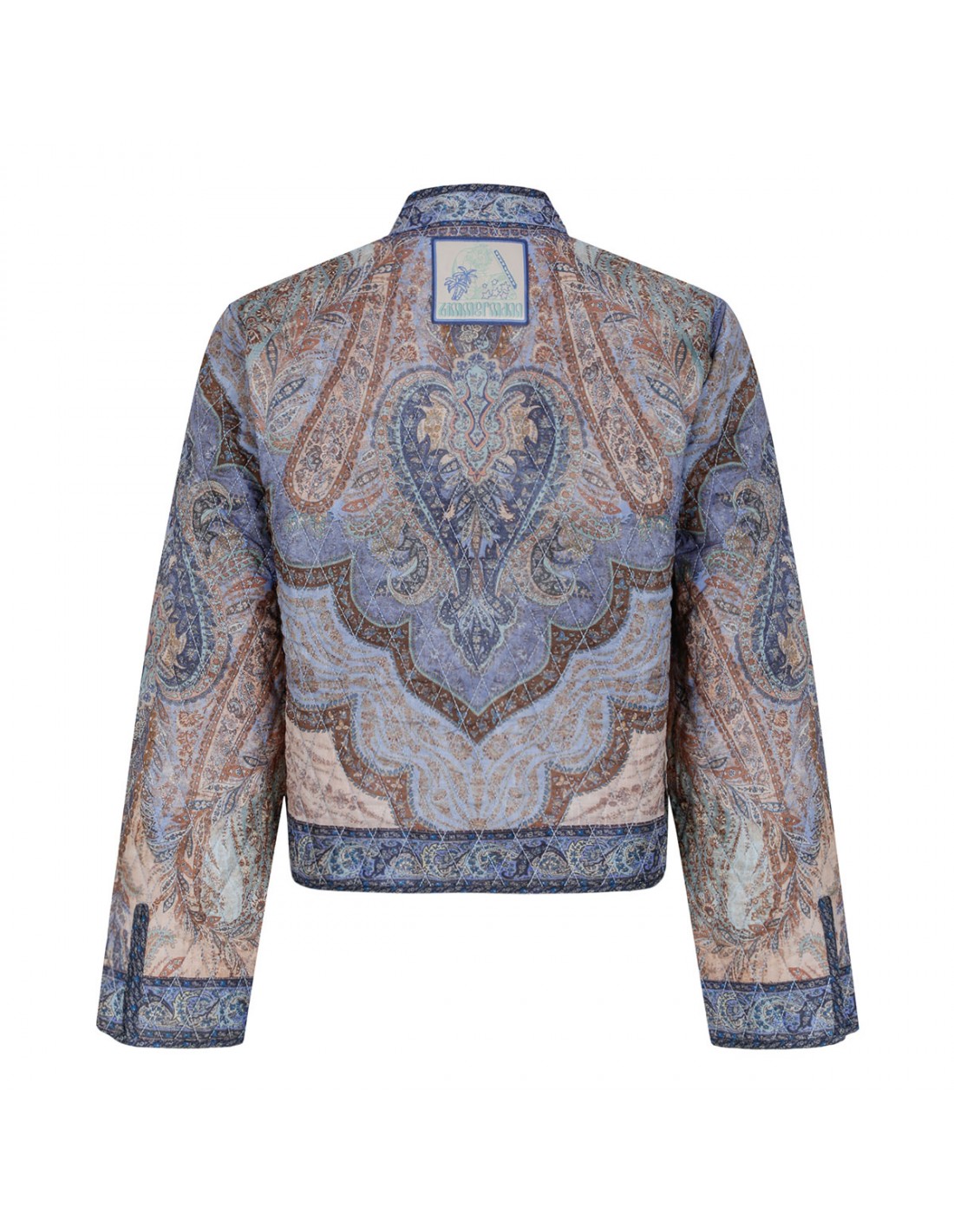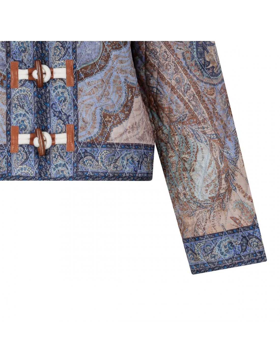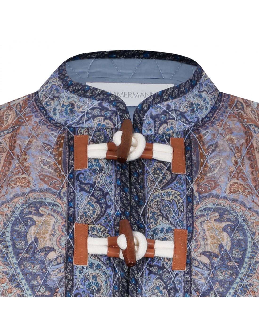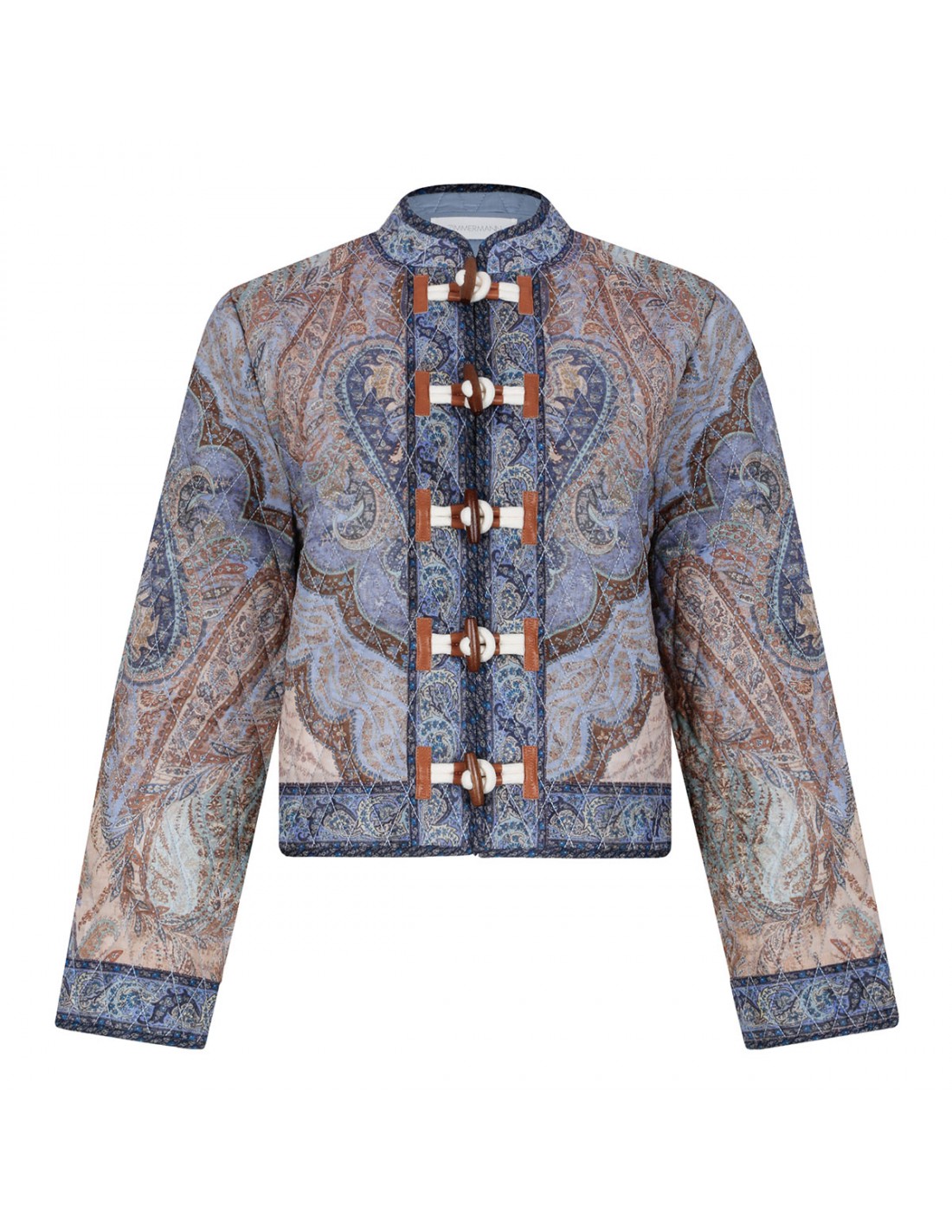 Blue quilted Wanderlust jacket from Zimmermann featuring tapestry motif, mandarin collar, toggle button fastening with leather tabs on centre front, cropped silhouette, wide cuffs with splits.