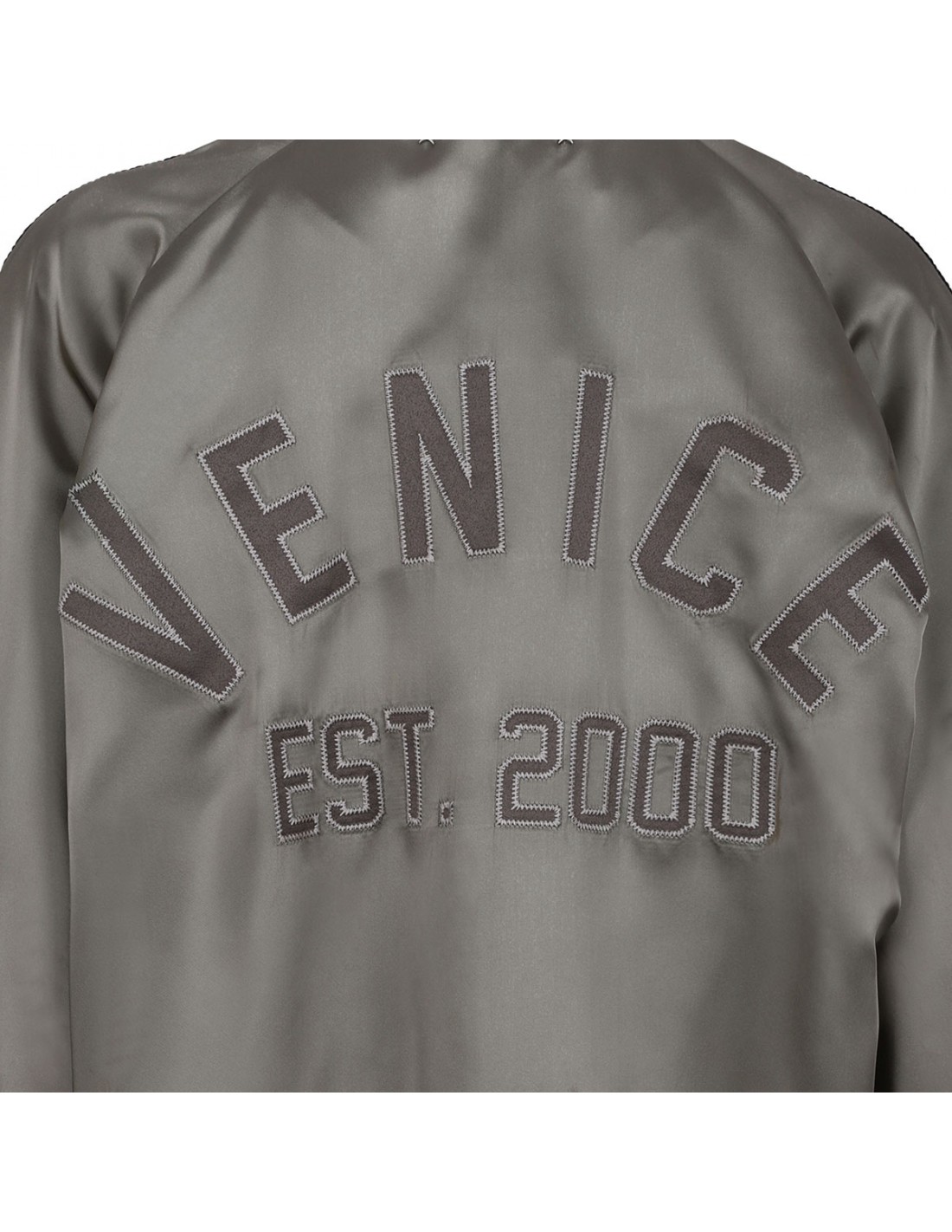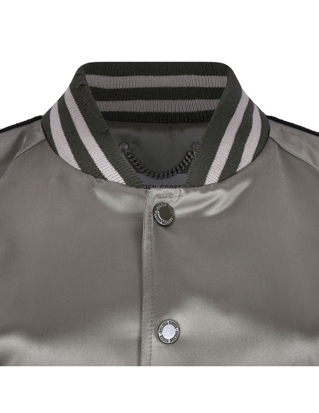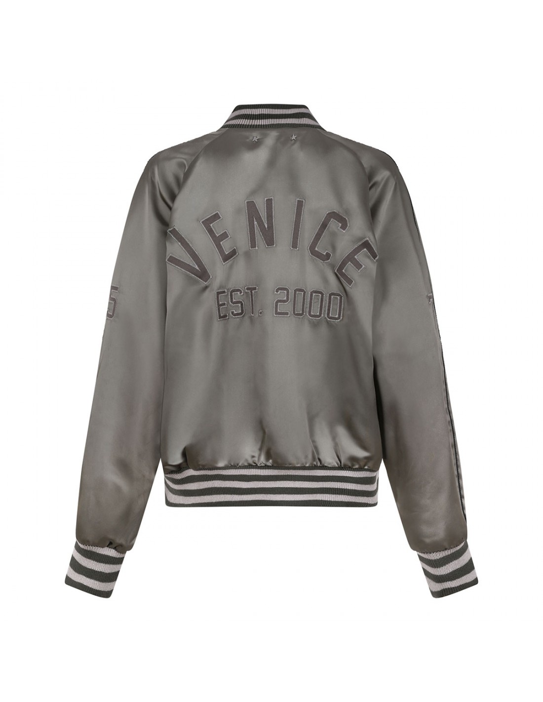 Green satin bomber jacket from Golden Goose featuring lived-in look, Venice lettering on the back, green felt patches, lacquered metal snap button fastening, tone-on-tone satin piping, double star on the back, regular fit, side pockets, ribbed-knit wool hem with striped pattern.