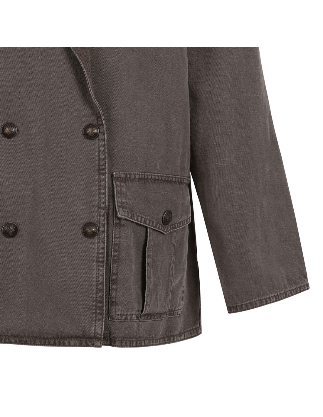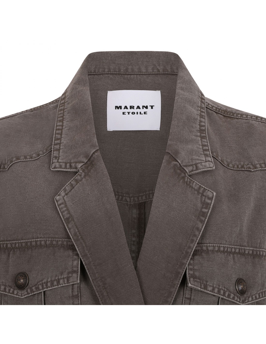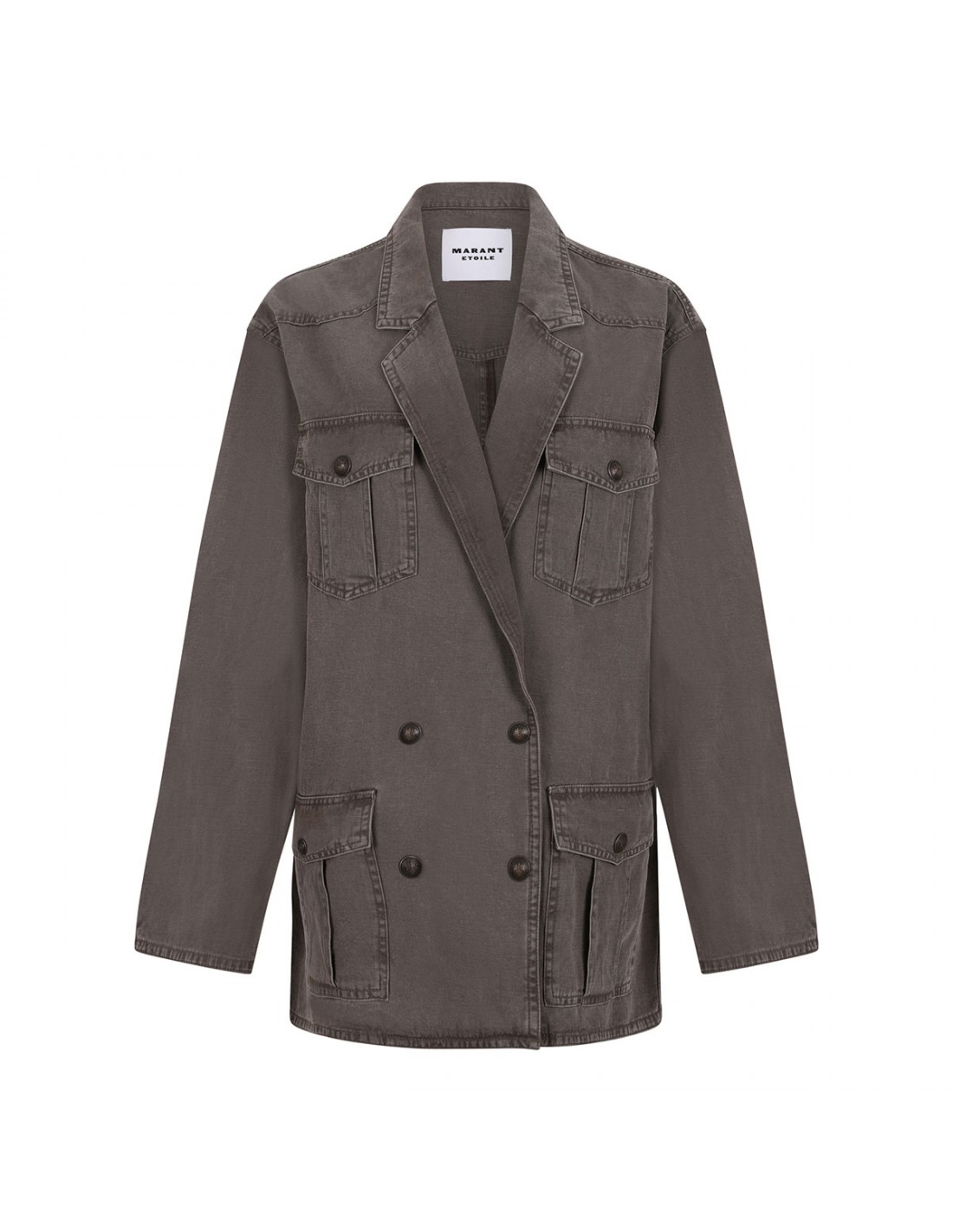 Dark bronze cotton and linen Nevala workwear jacket from Isabel Marant Etoile featuring shirt collar, snap fastening at front, long sleeves, four patch pockets with buttoned flap, straight silhouette.
