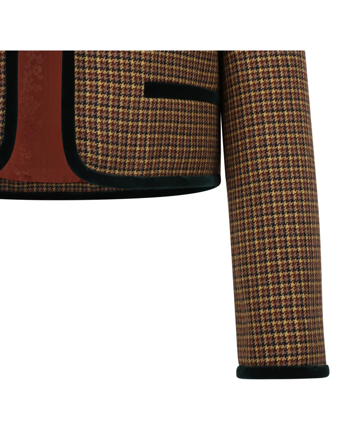 Brown, beige, yellow and black houndstooth wool jacket from Valentino featuring boxy silhouette, cropped cut, velvet trims, gold-tone jewelry buttons, open front.