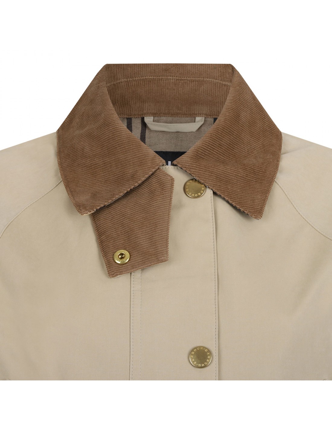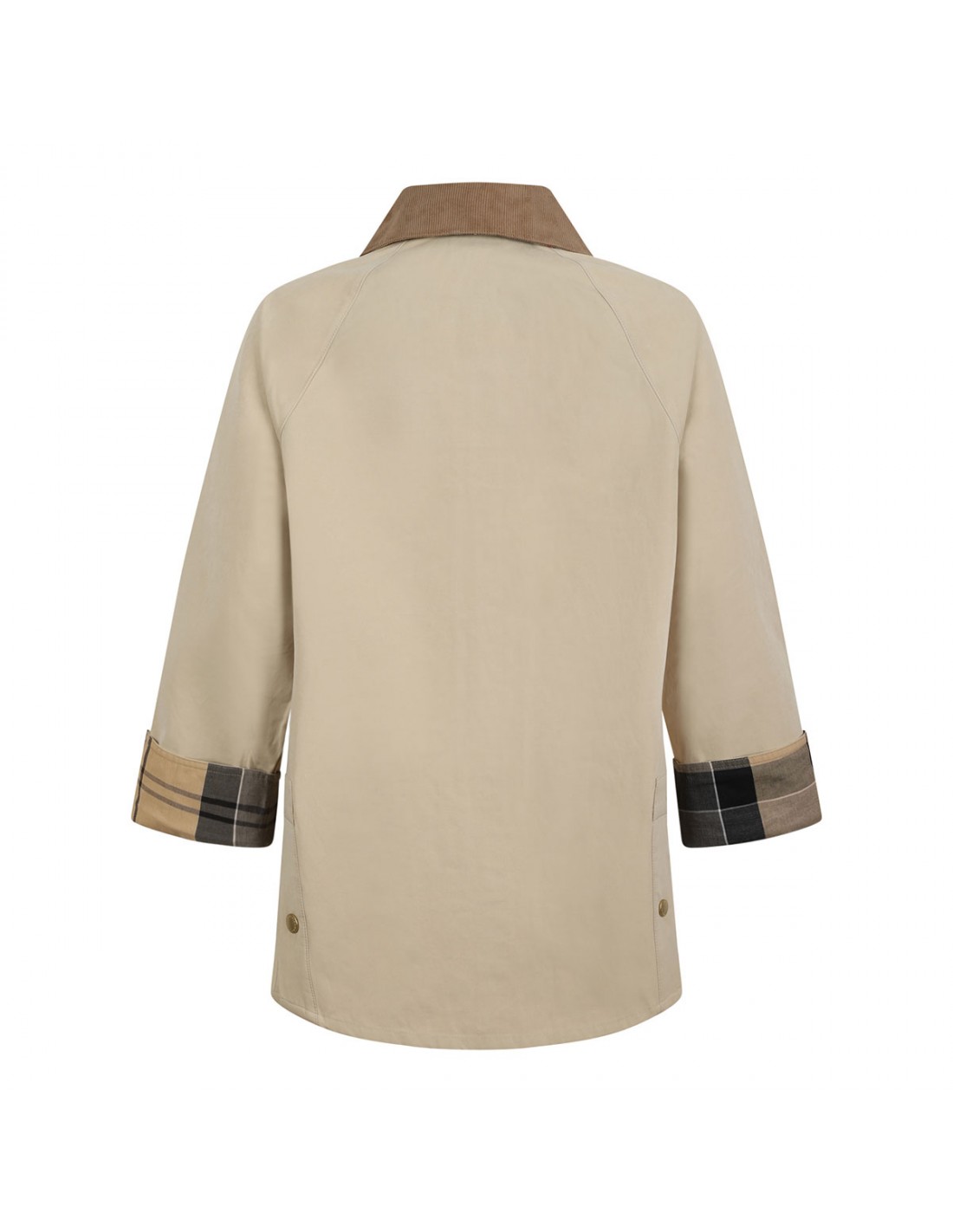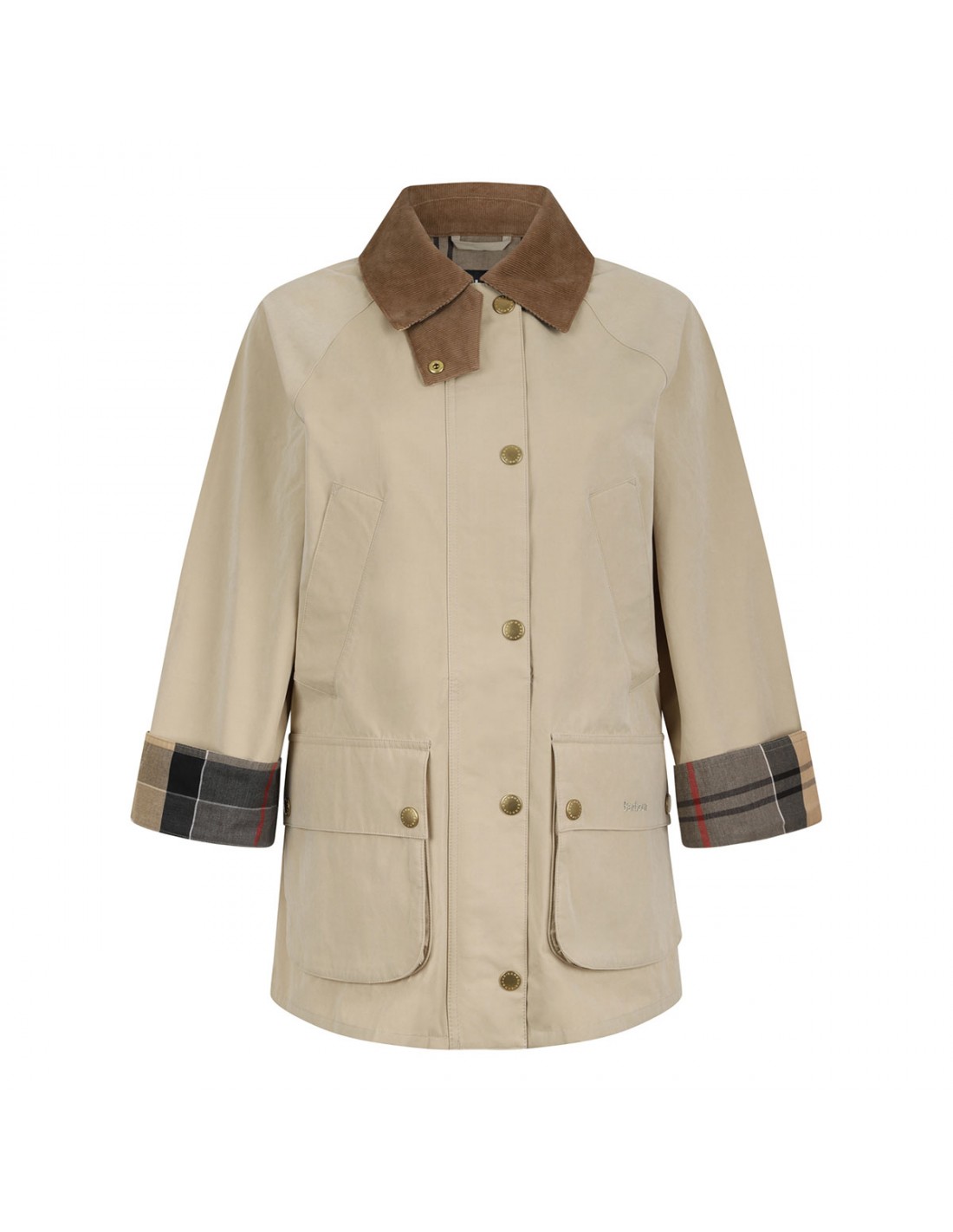 Pale khaki hue Glynis casual jacket from Barbour featuring contrasting corduroy pointed collar, studded placket with concealed zip closure, handwarmer and buttoned flap pockets, tartan buggy and under cuff, logo on the left pocket.
