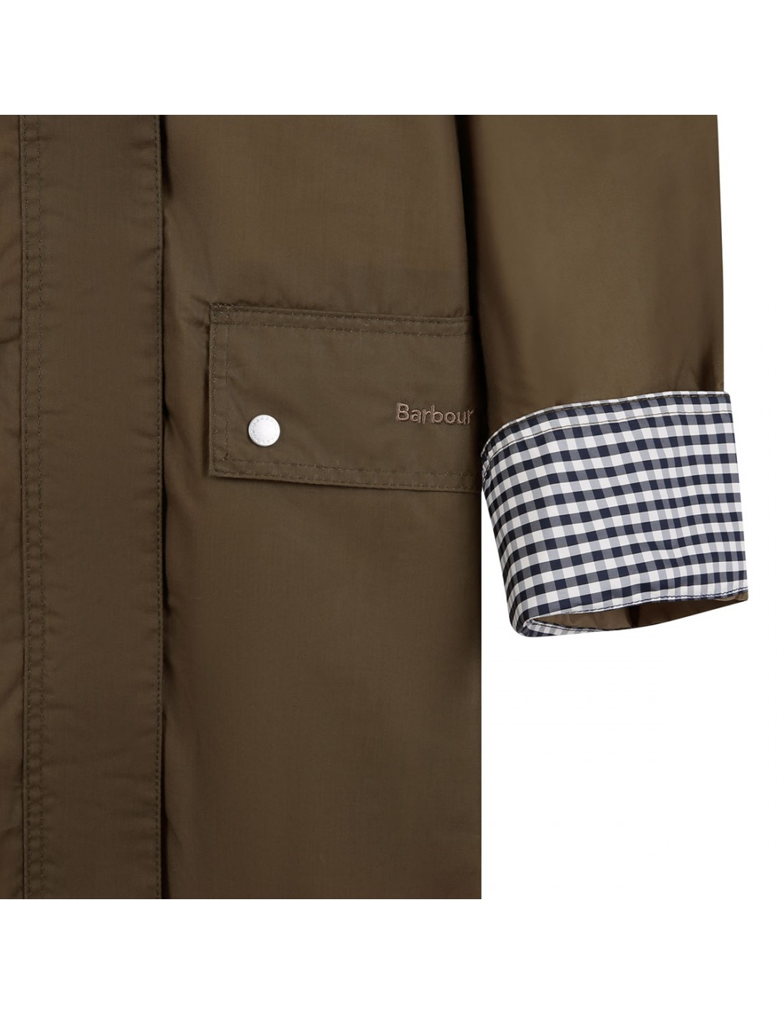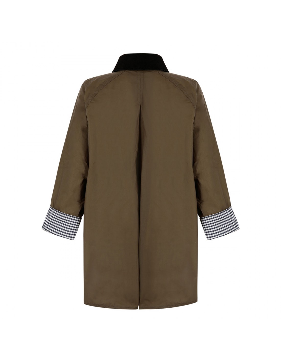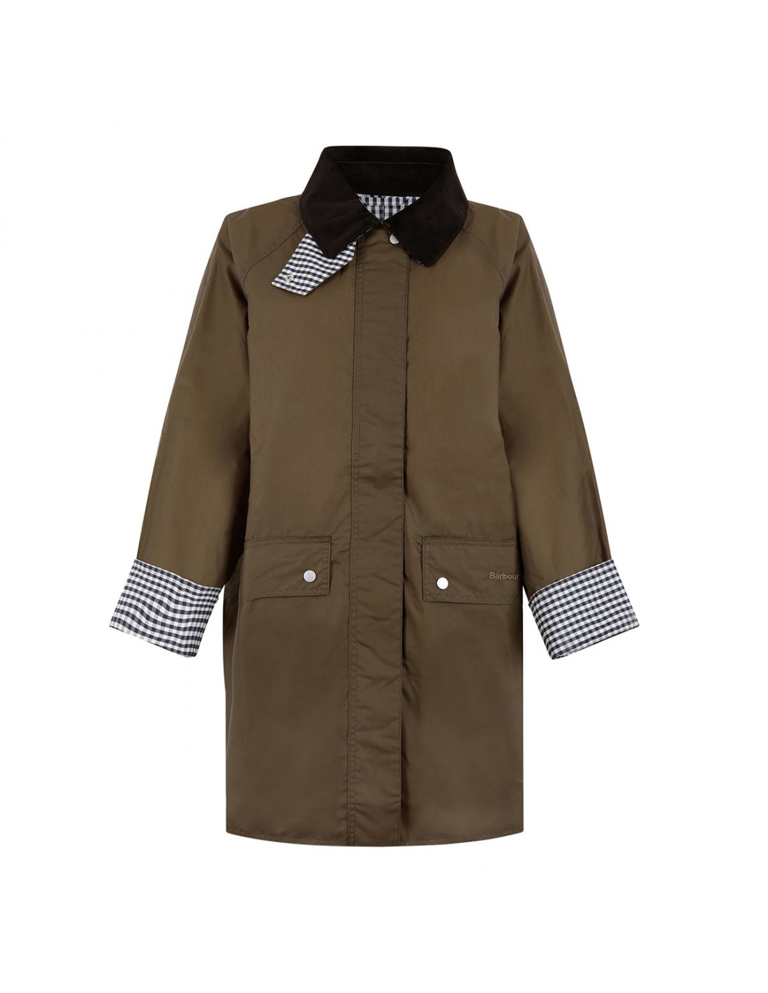 Sand hue waxed cotton Wren jacket from Barbour featuring concealed stud fastening, front buttoned flap pockets, large centre-back pleat, contrasting corduroy collar, raglan sleeves, gingham detailing on throat tab, cuffs, gingham lining.