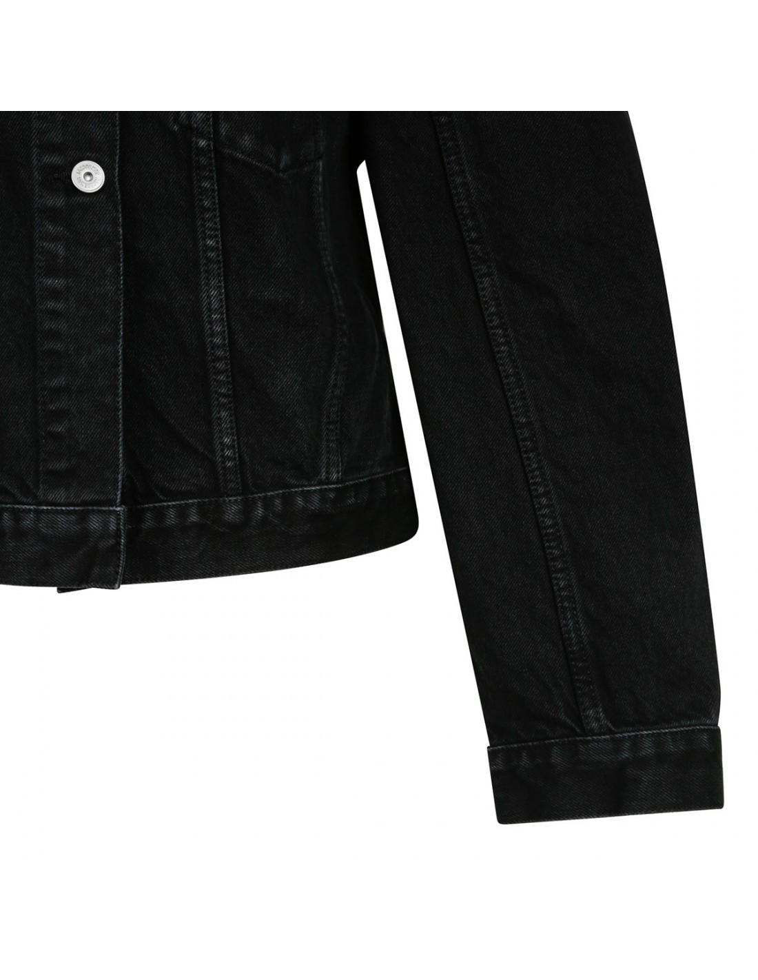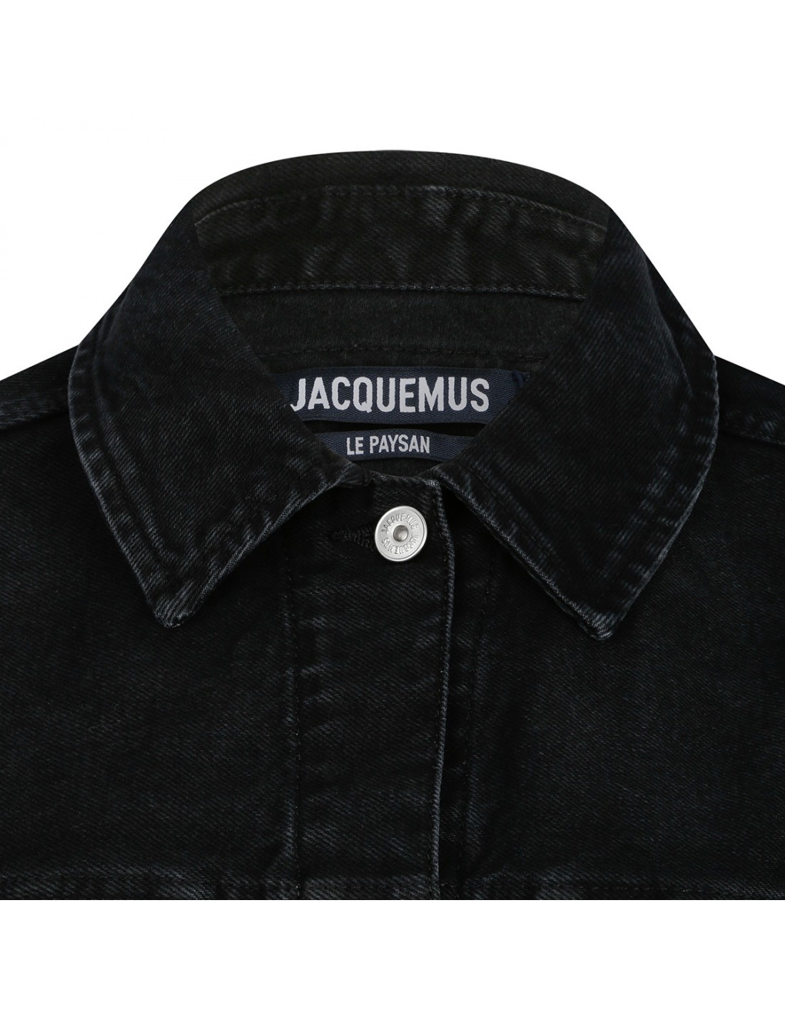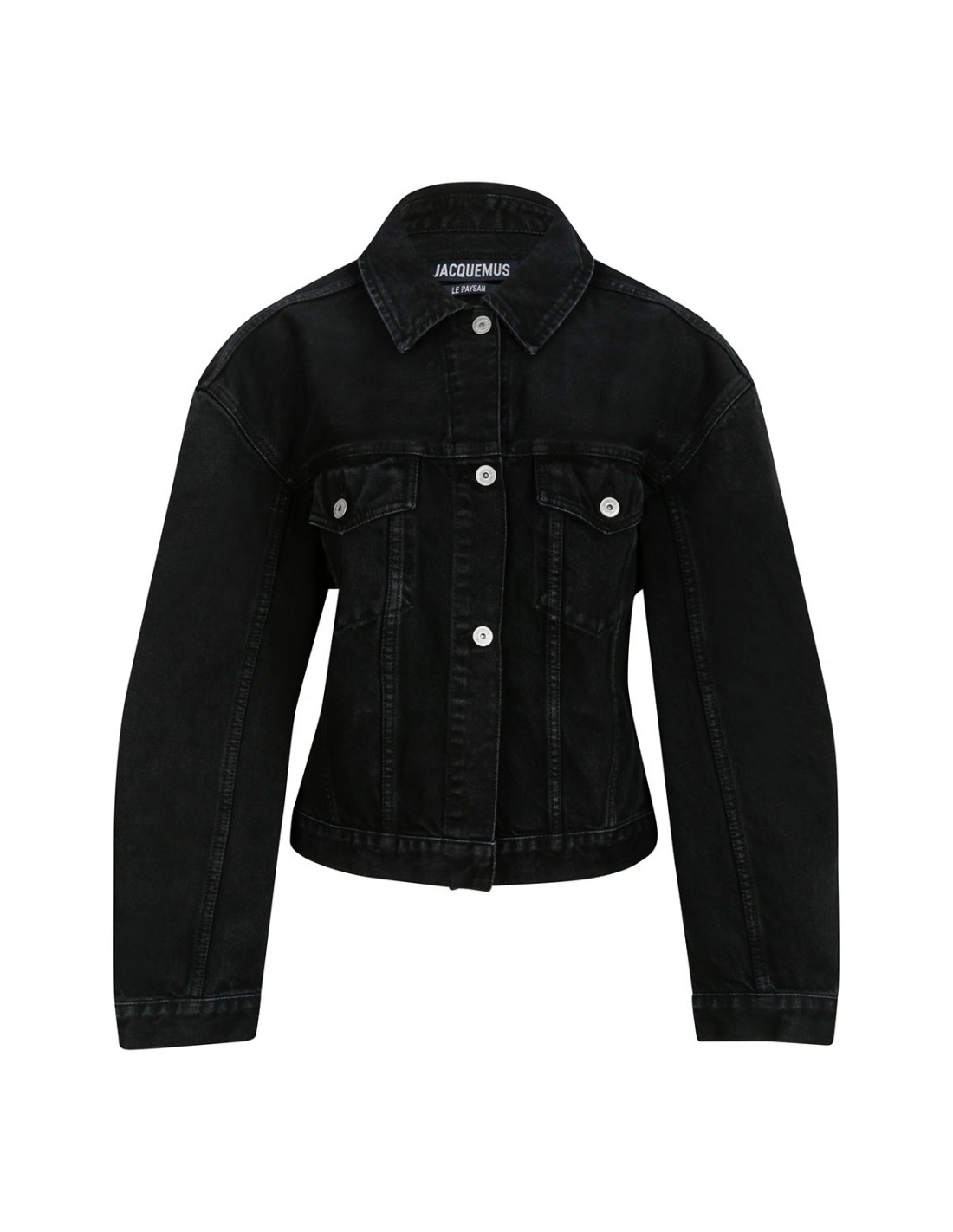 Black washed denim The de-Nîmes jacket from Jacquemus featuring pointed collar, rounded shoulders, silver metal engraved button fastening, buttoned flap pockets at chest, denim calisson patch on the back, integrated buttoned belt at the back, buttoned cuffs with slit.