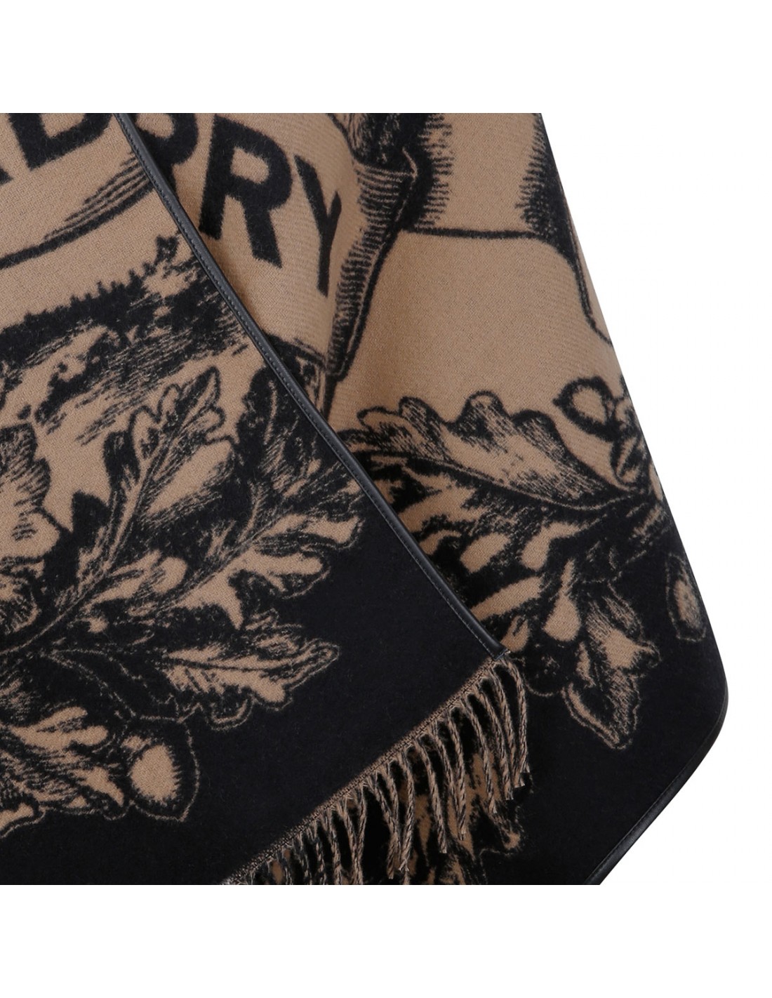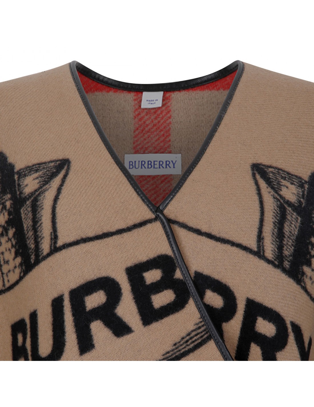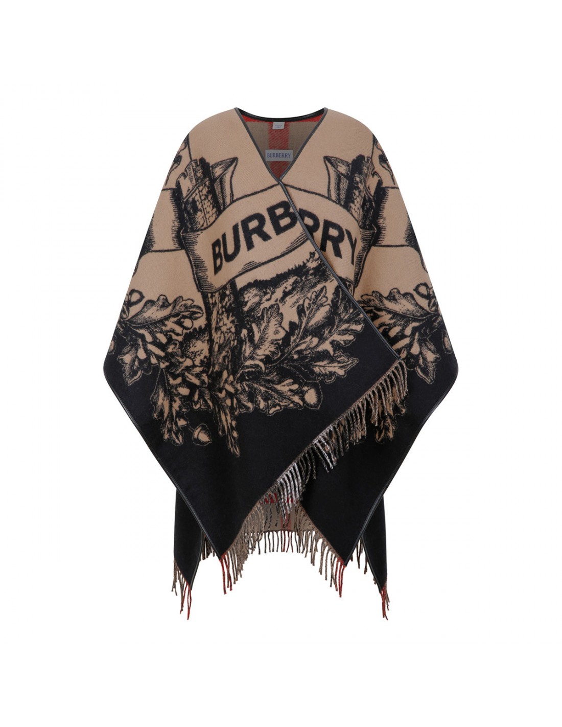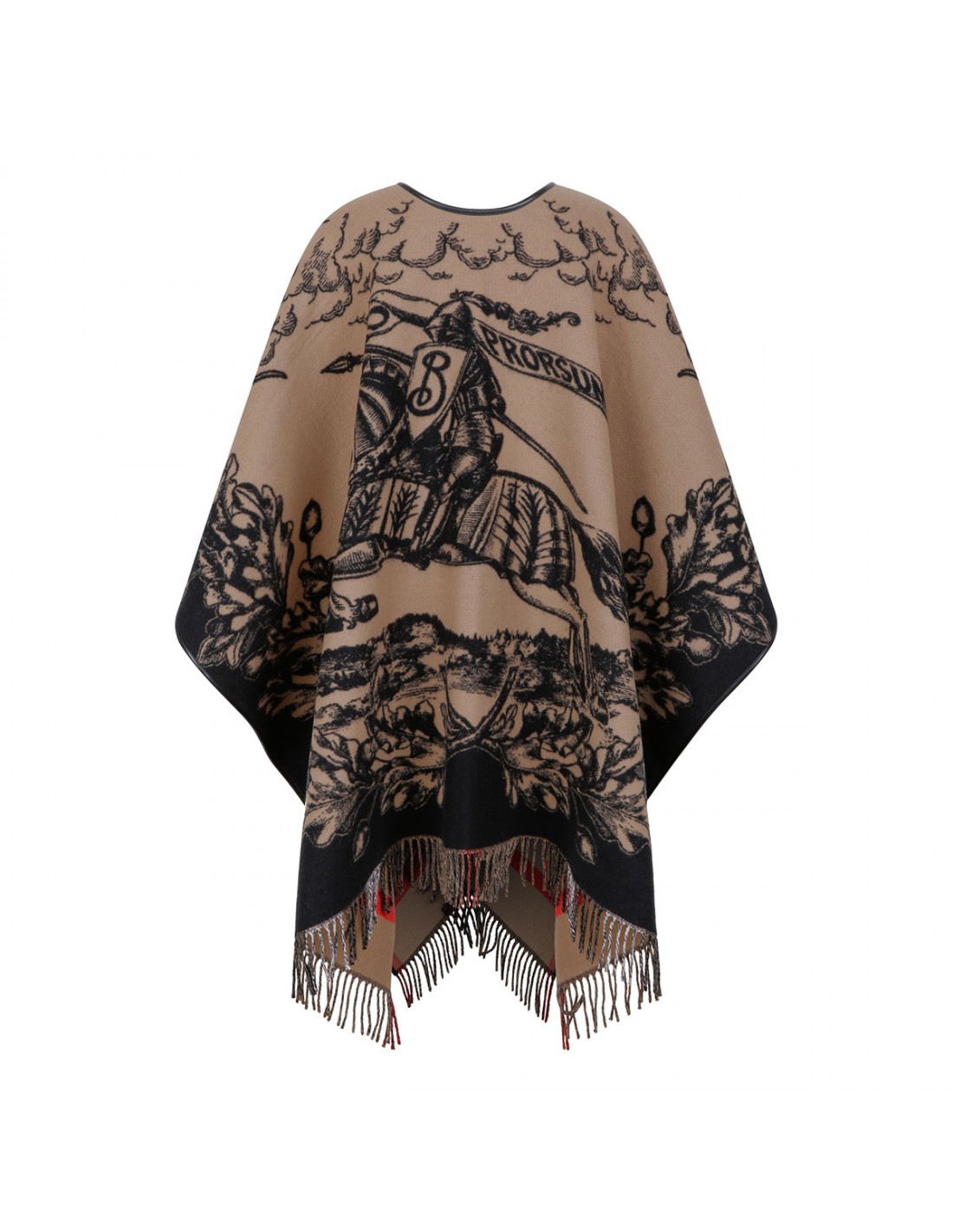 Jacquard-woven wool reversible cape from Burberry featuring on side in Equestrian Knight design and other side in iconic Burberry check, supple leather trims and fringes at both ends.