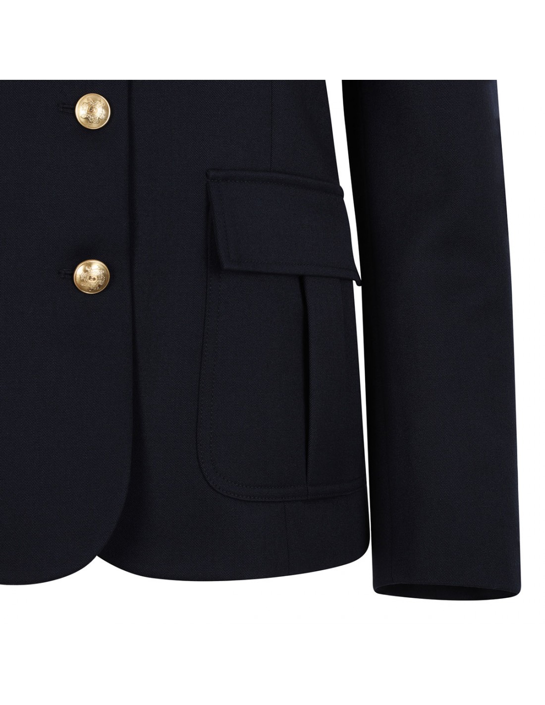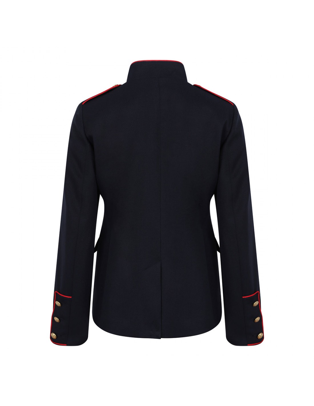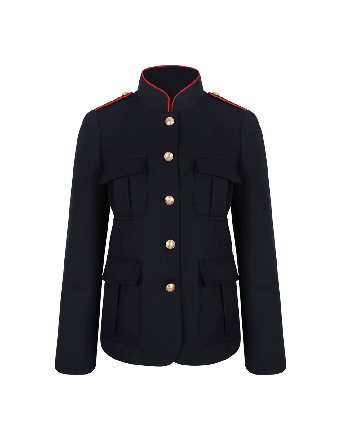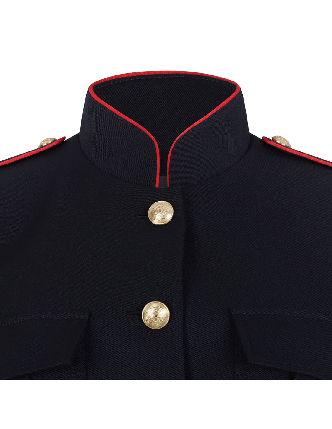 Midnight blue wool gabardine Silas jacket from Nili Lotan featuring structured style, slightly boxy silhouette, front flap pockets, button closure, red accents, mandarin collar, buttoned cuffs, back vent.