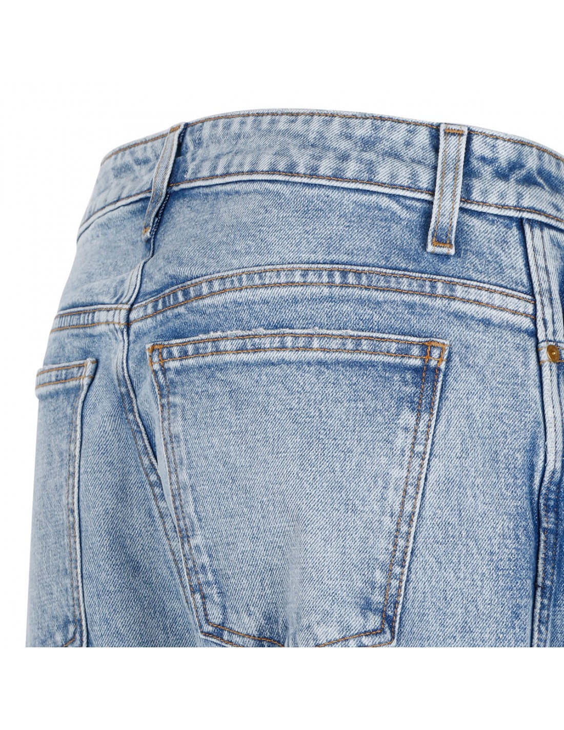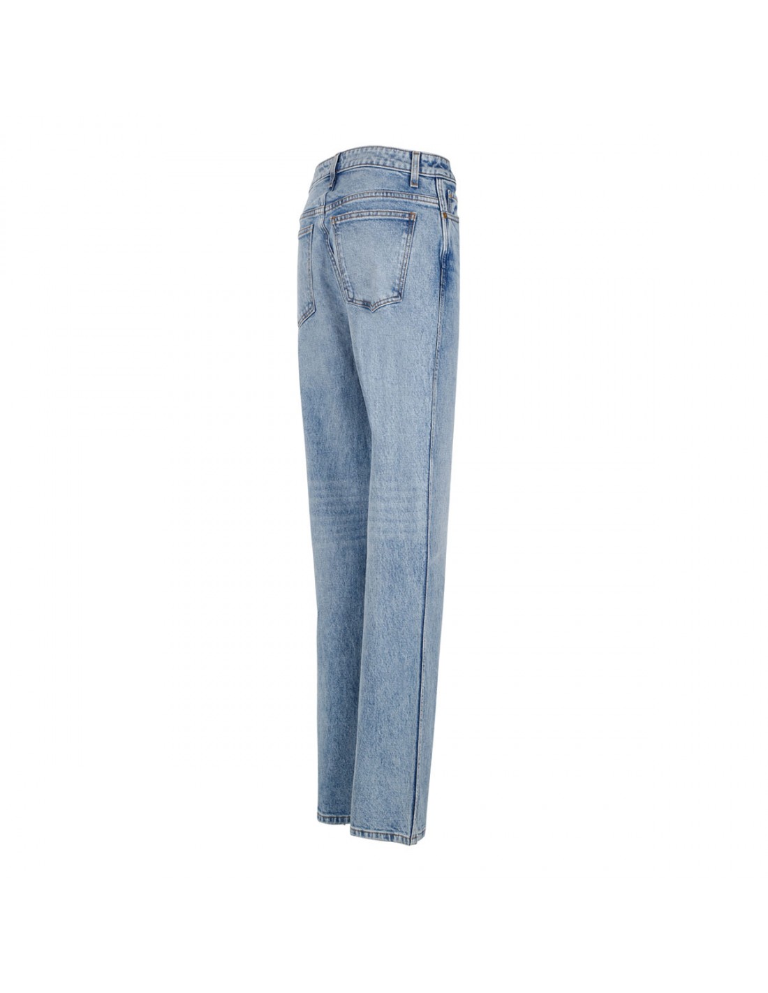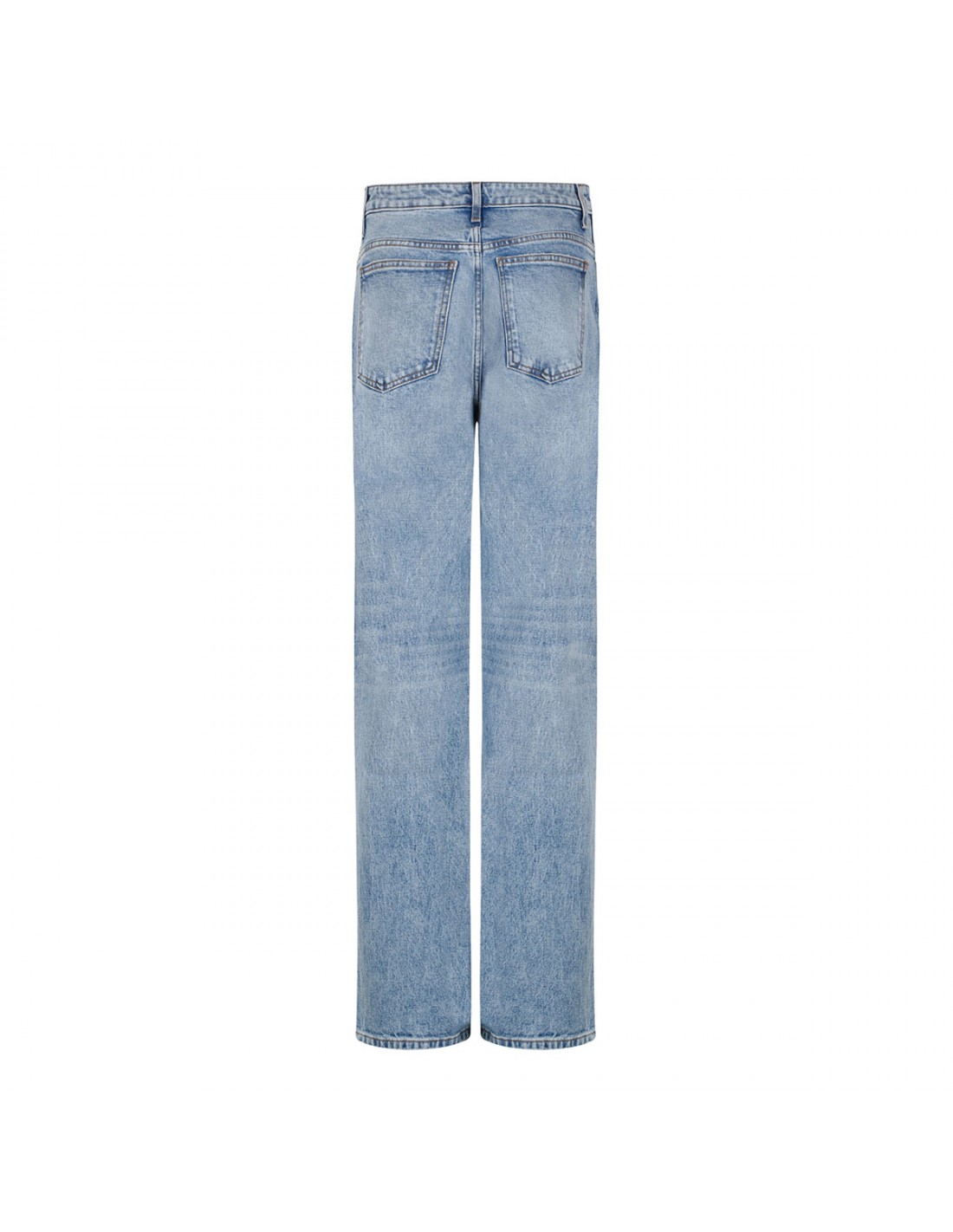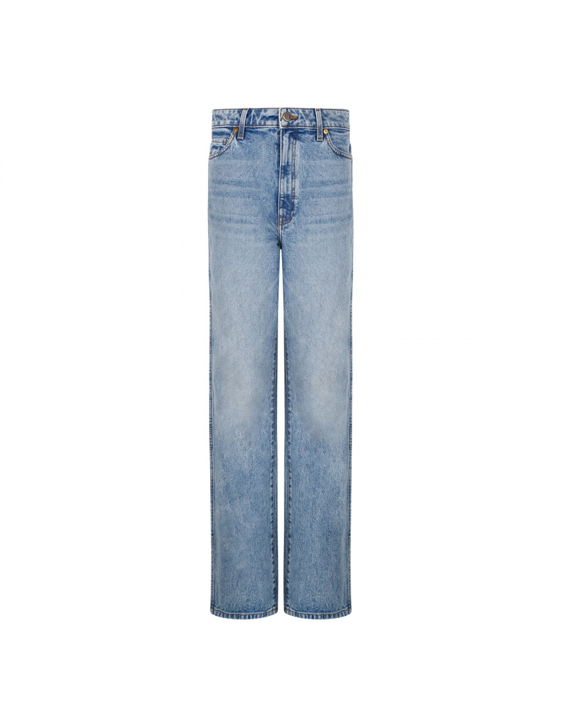 Light blue slightly stretch denim Danielle jeans from Khaite featuring high-rise, stovepipe silhouette, subtle fading and whiskering, belt loops on the waistband, button closure, zip fly, classic five-pocket style.