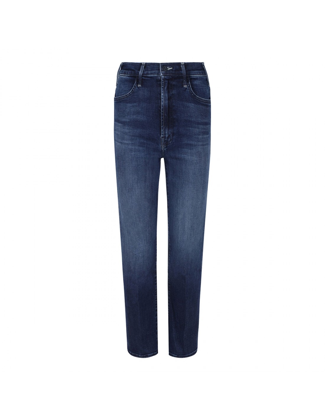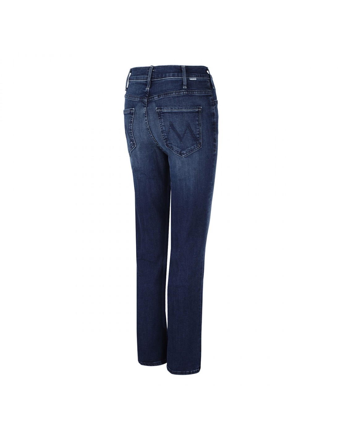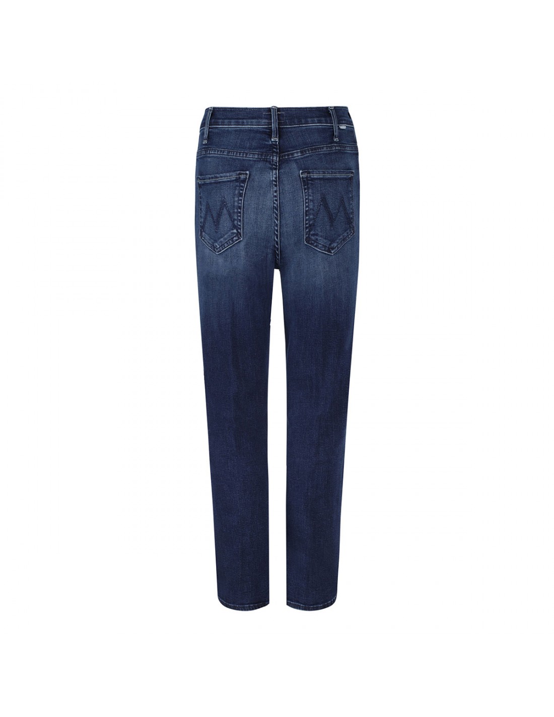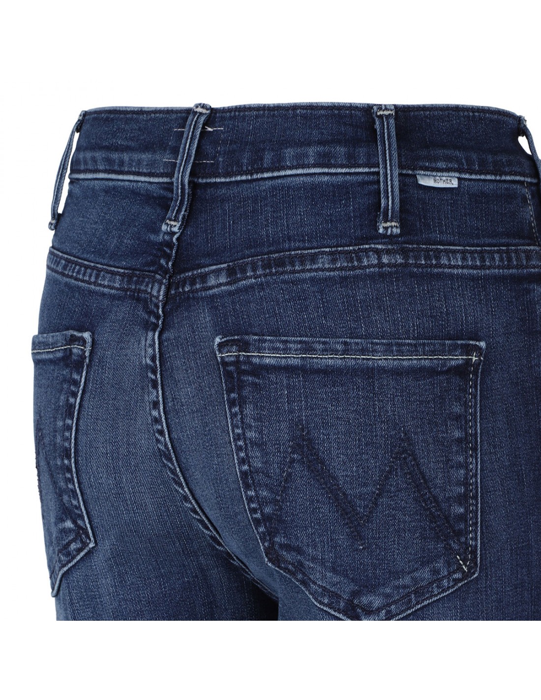 Dark-blue wash stretch denim The Hustler Ankle jeans from Mother featuring subtle whiskering and fading, high-rise, flared clean hem, ankle-length, button closure and zip fly, side and back pockets, belt loops on the waistband, M logo embroidery on back pockets.