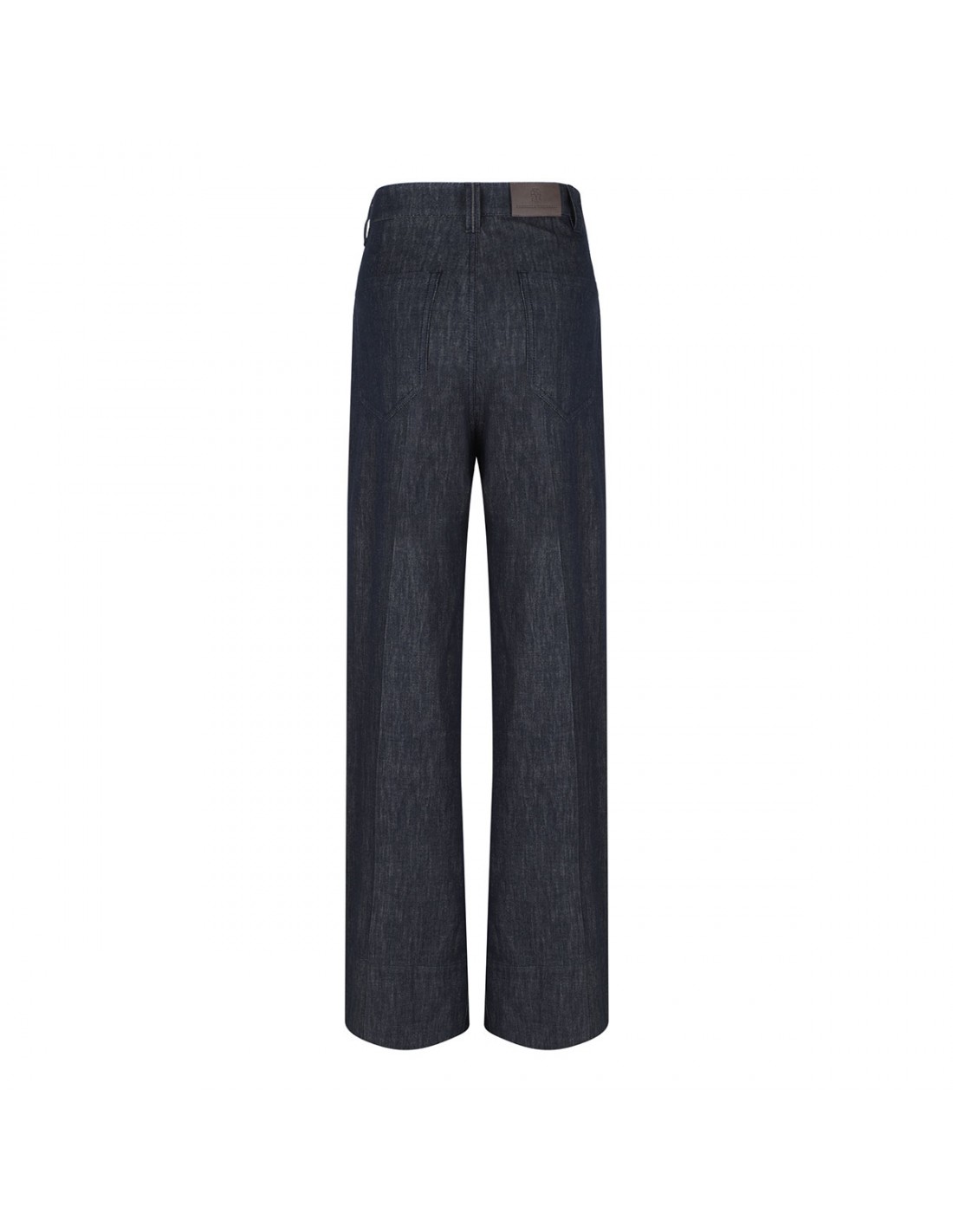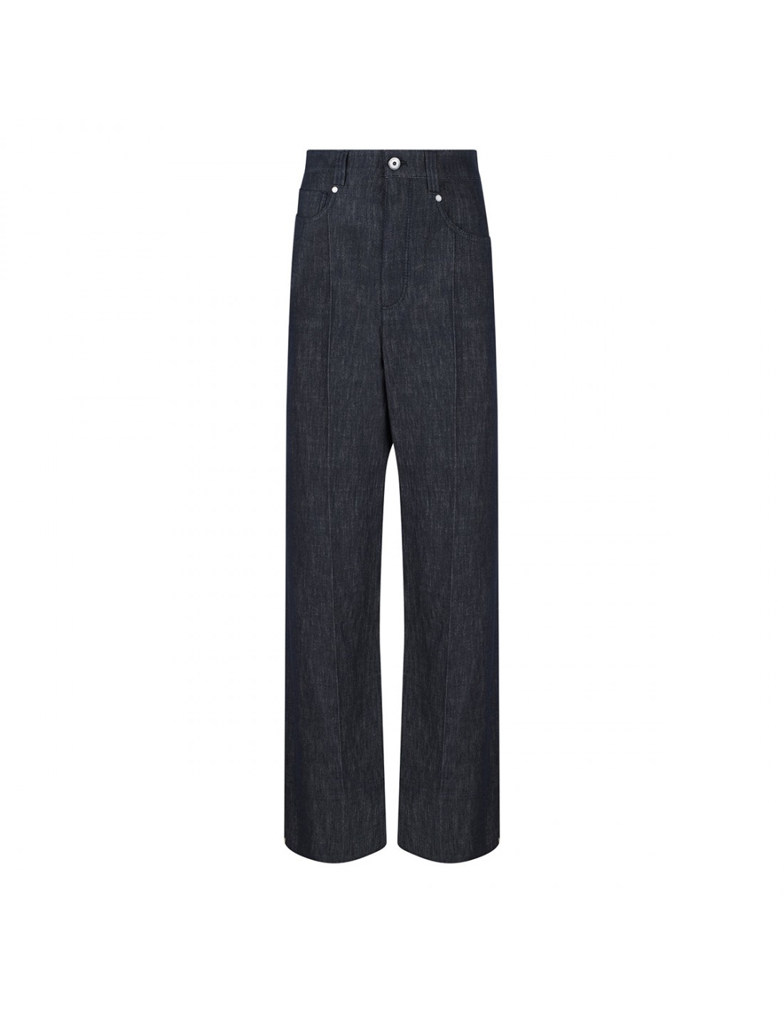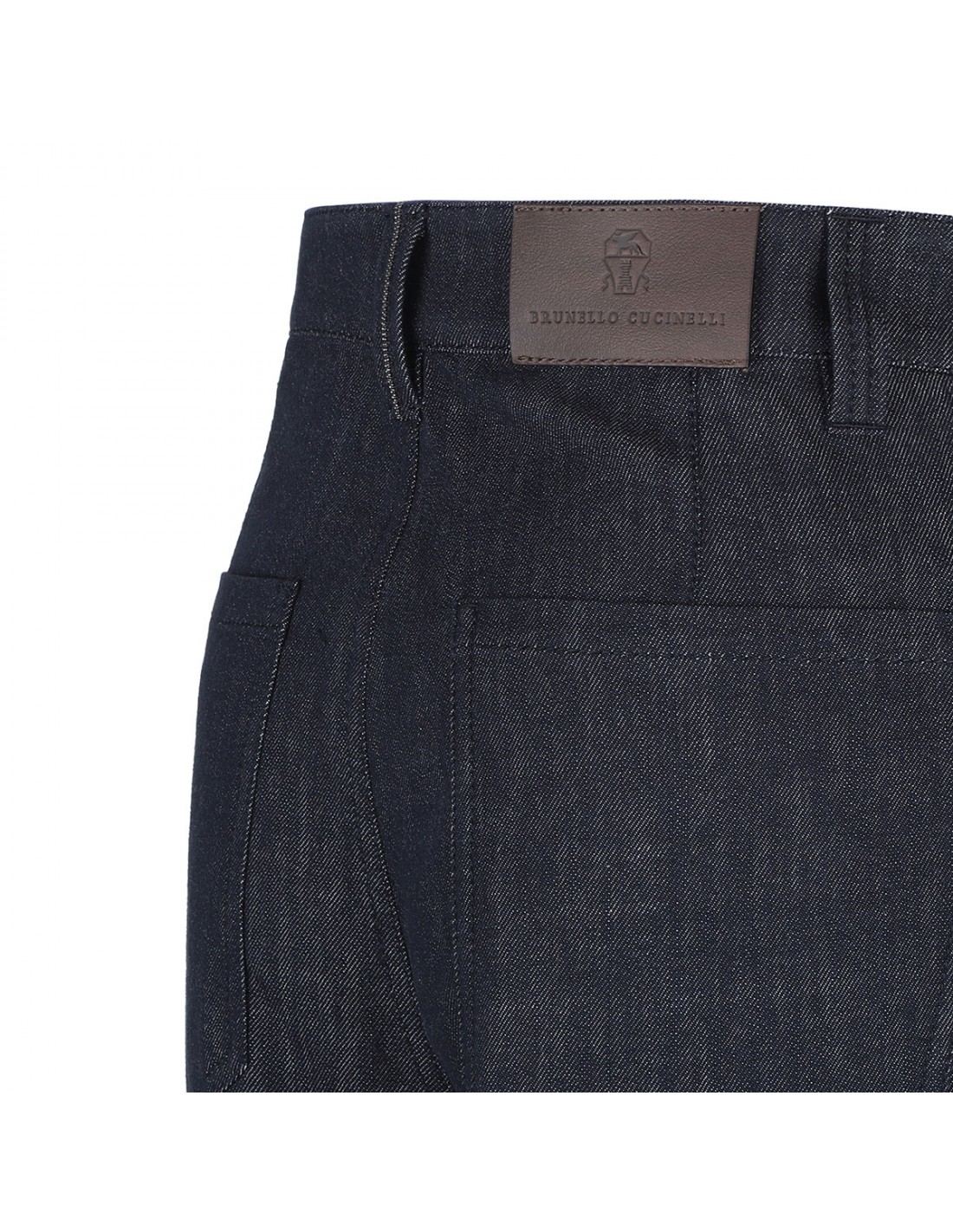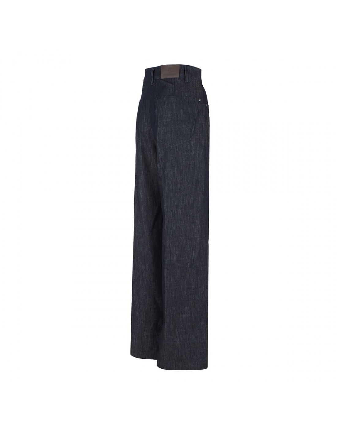 Blue cotton jeans from Brunello Cucinelli featuring denim effect, wide leg, contrasting stitching, classic five pocket style, belt loops on the waistband, front pleats, button closure and zip fly, leather logo tag on back waist.