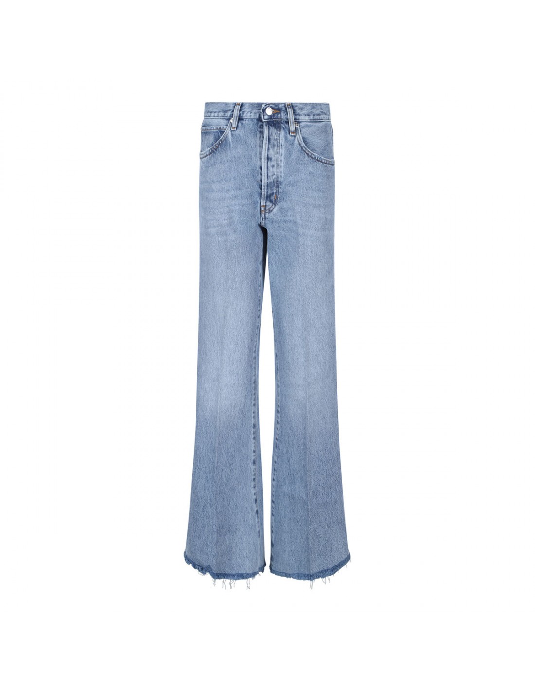 Light blue rigid denim The Lax jeans from Frame featuring fitted hips and wide flared legs, raw frayed hem, button closure, zip fly, classic five-pocket style, belt loops on the waistband.