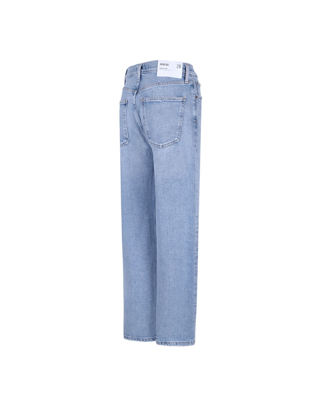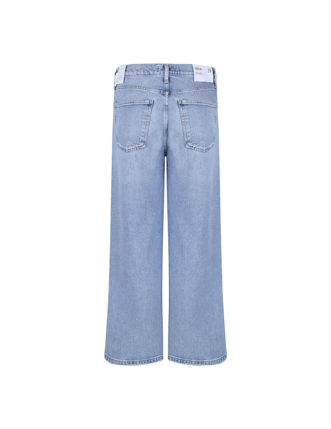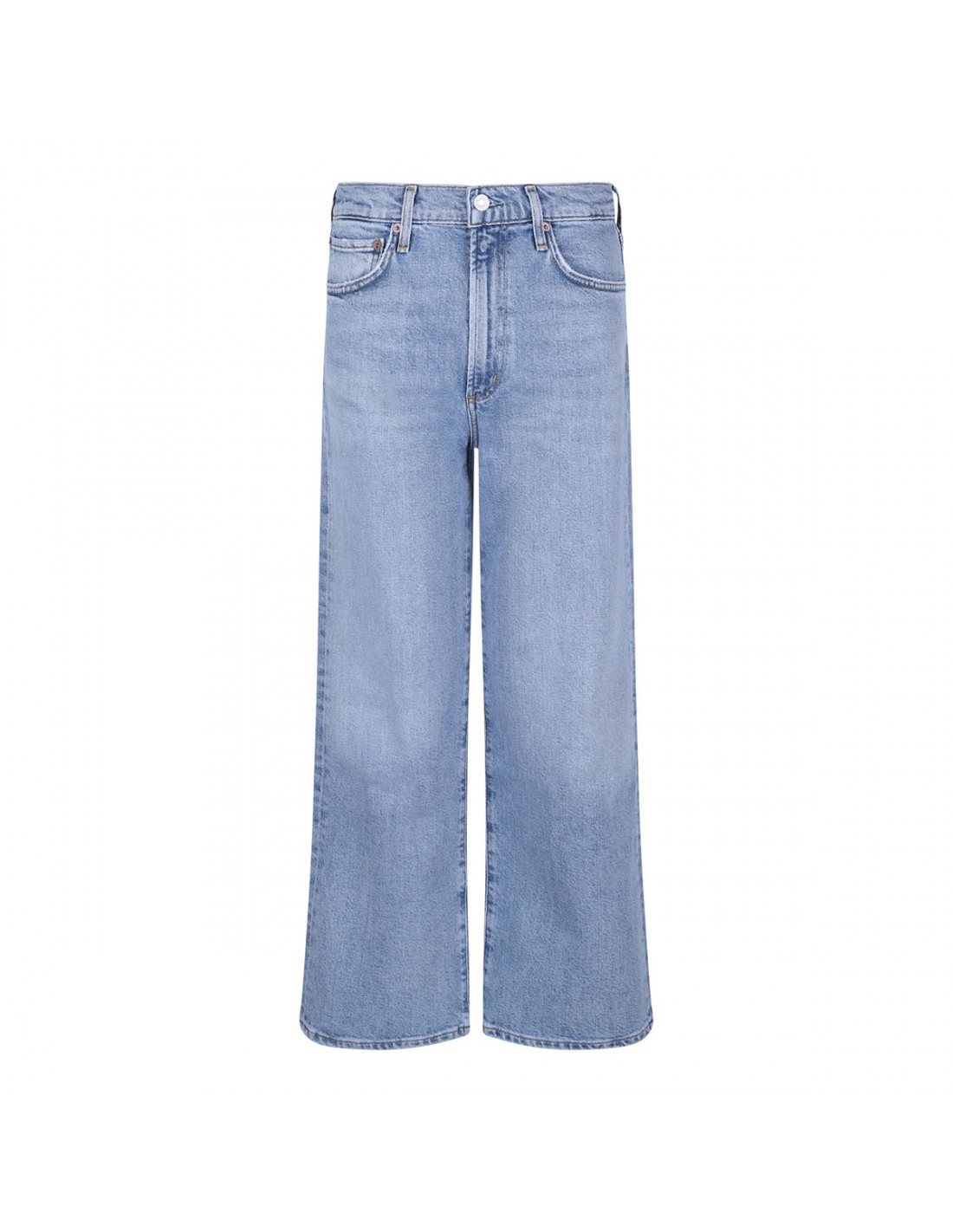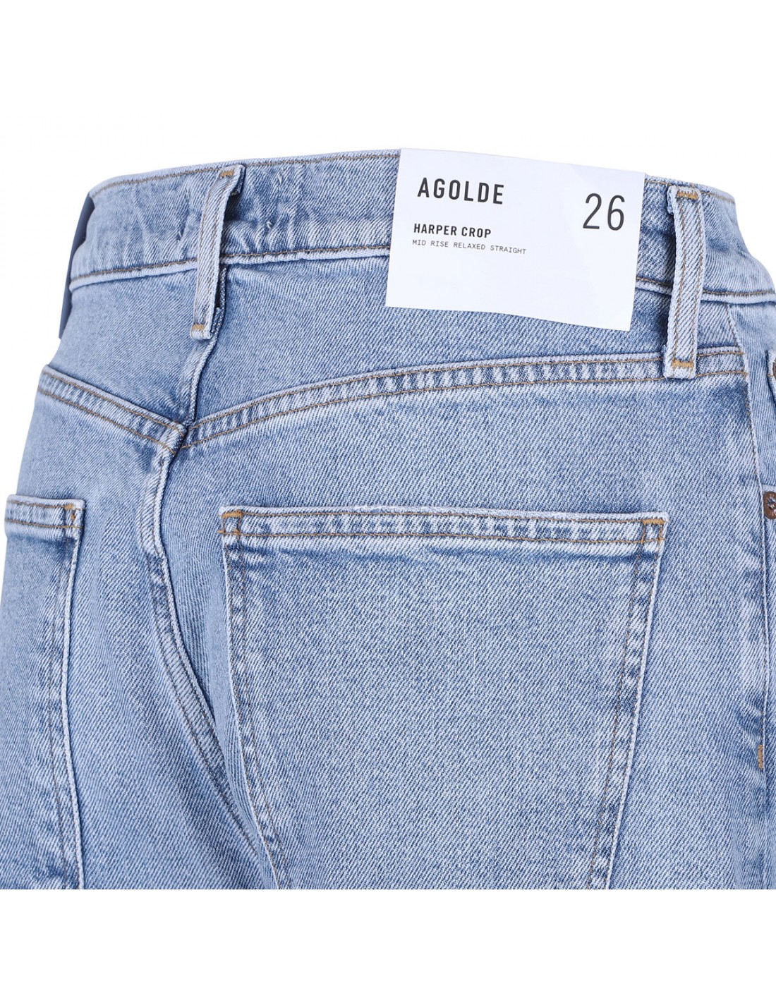 Vintage indigo hue stretch denim Harper crop jeans from Agolde featuring whiskering and fading, subtle wide leg, ankle length, relaxed silhouette, mid-rise, button closure and zip fly, belt loops on the waistband, classic five-pocket style, clean hem.