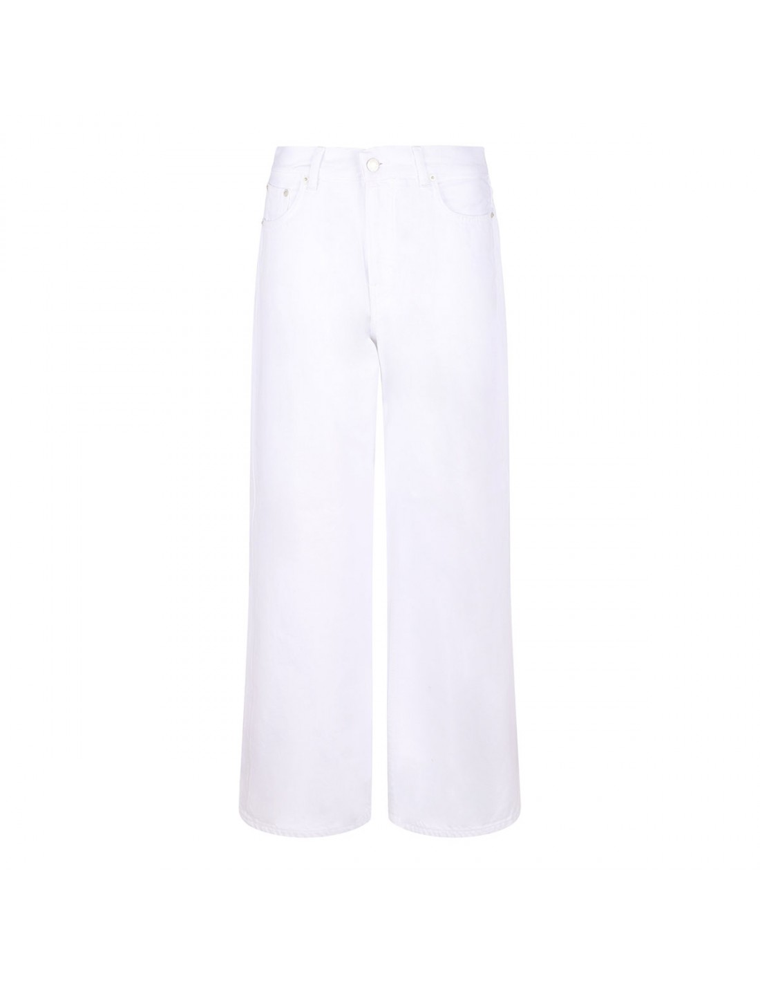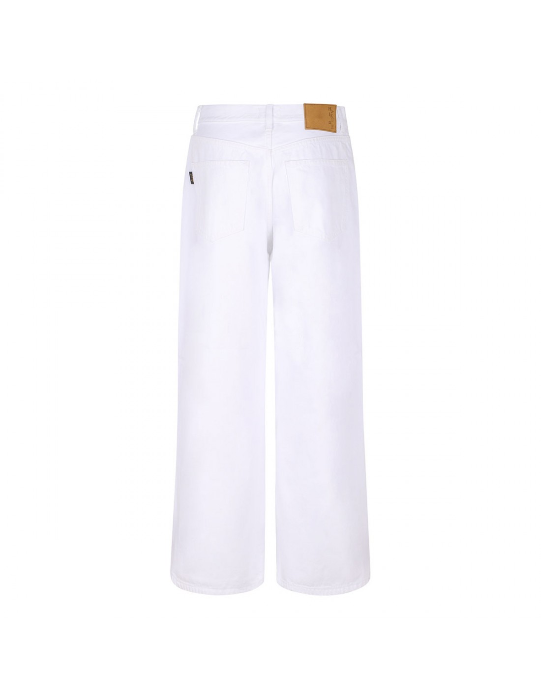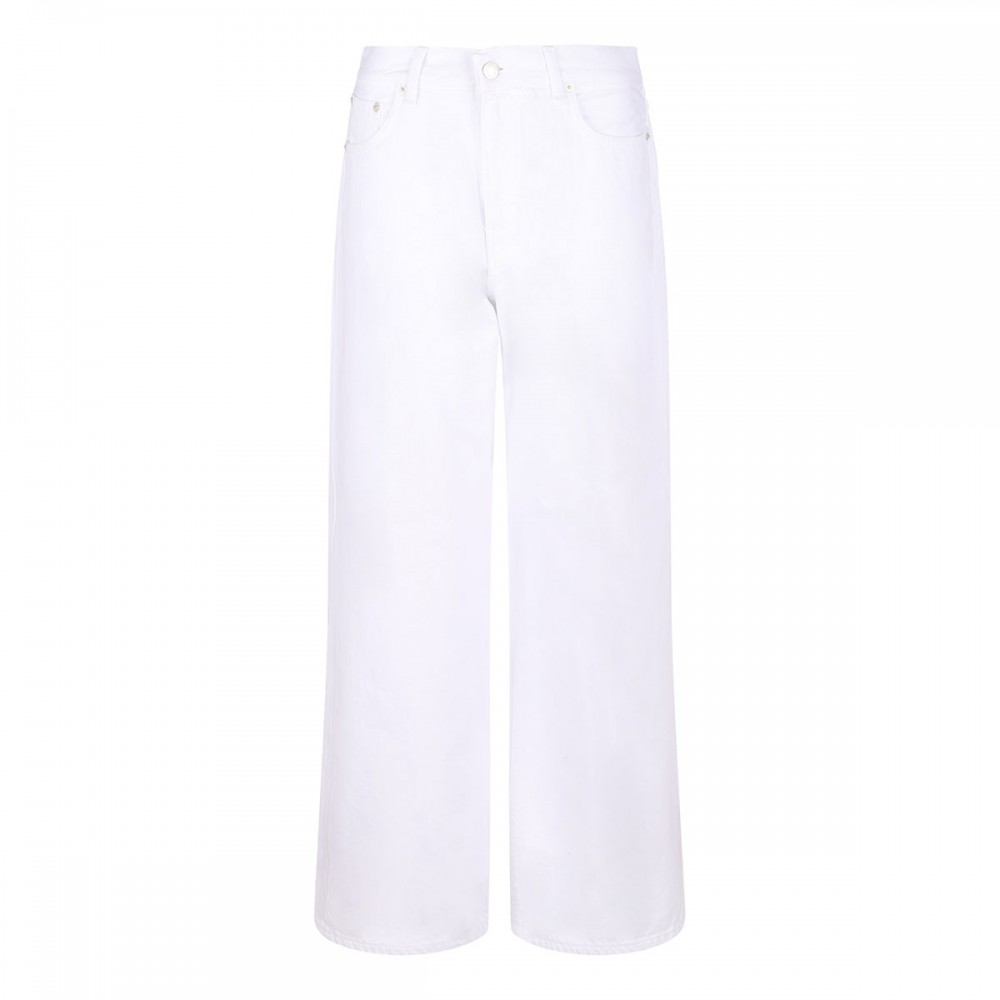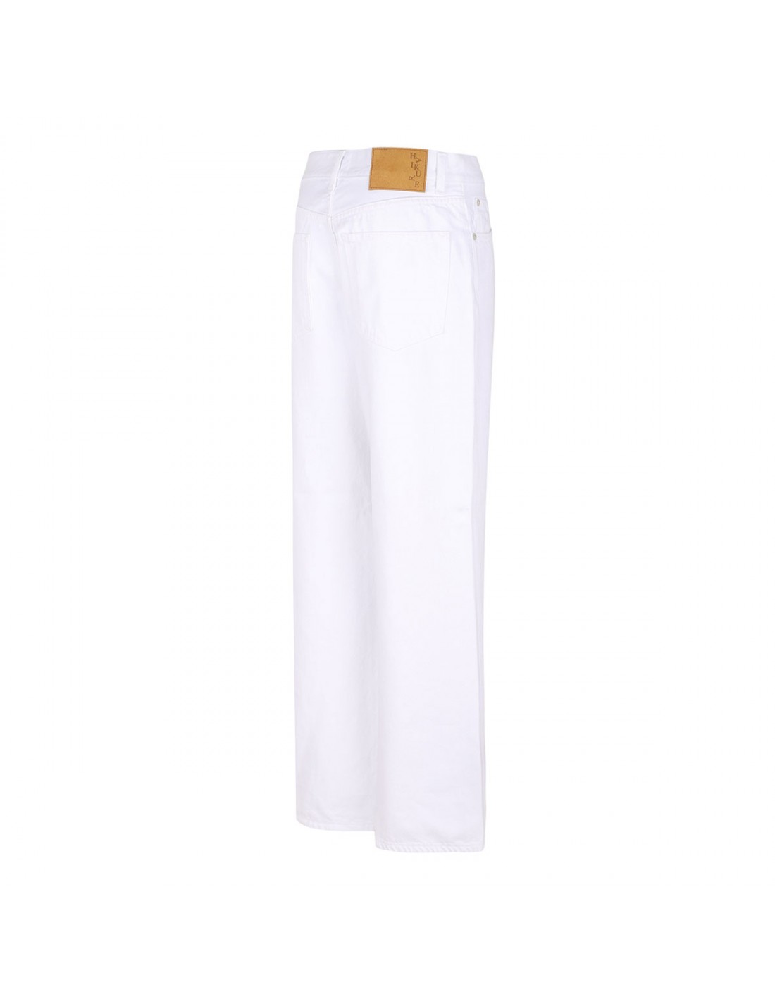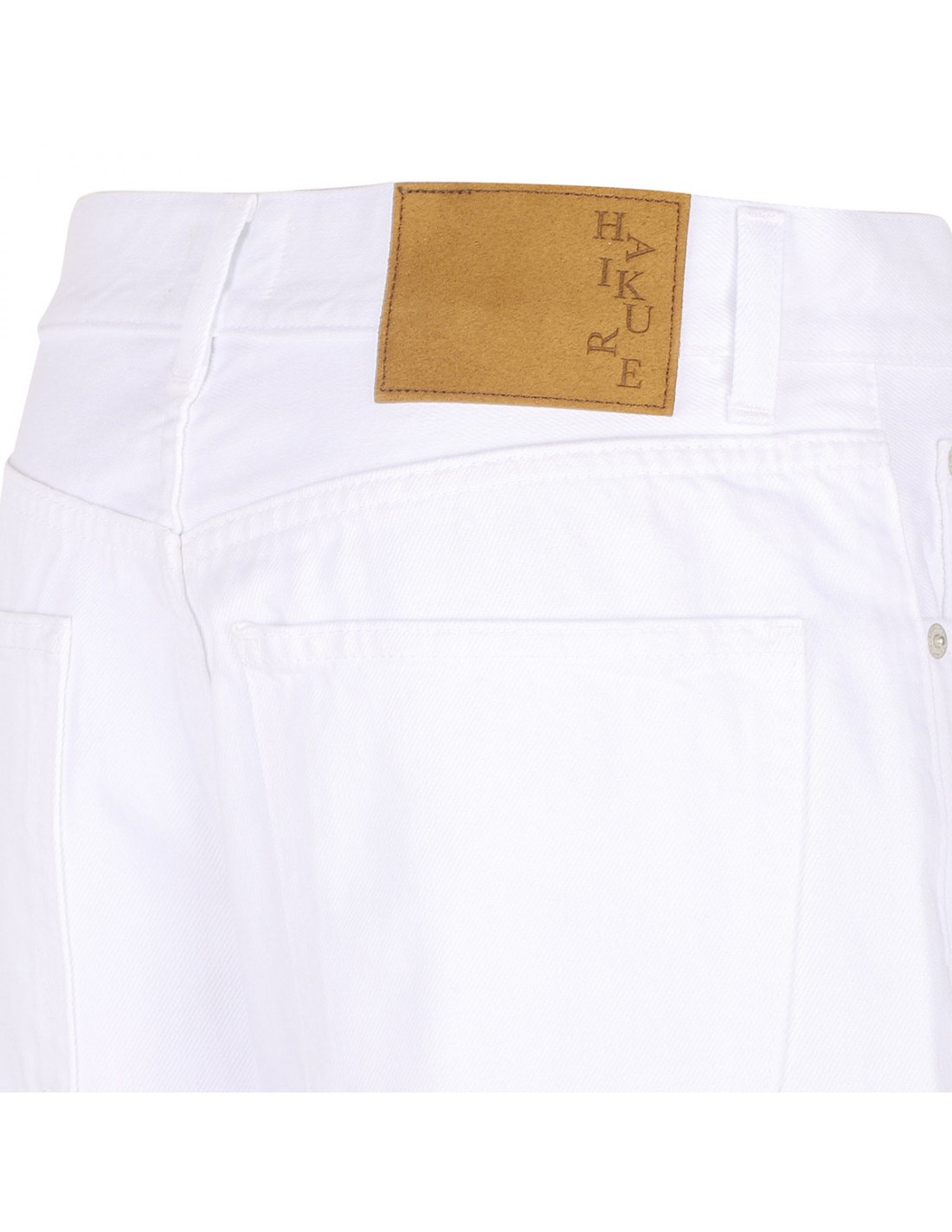 Optical white denim Korea jeans from Haikure featuring asian fit, wide palazzo leg, belt loops on the waistband, button closure and zip fly, classic five-pocket style, leather logo label at back.