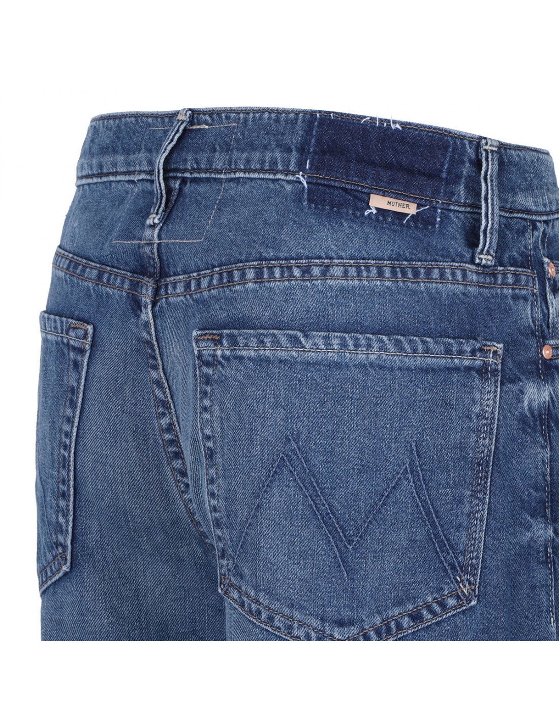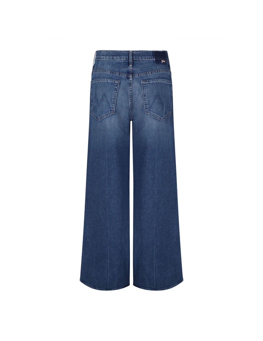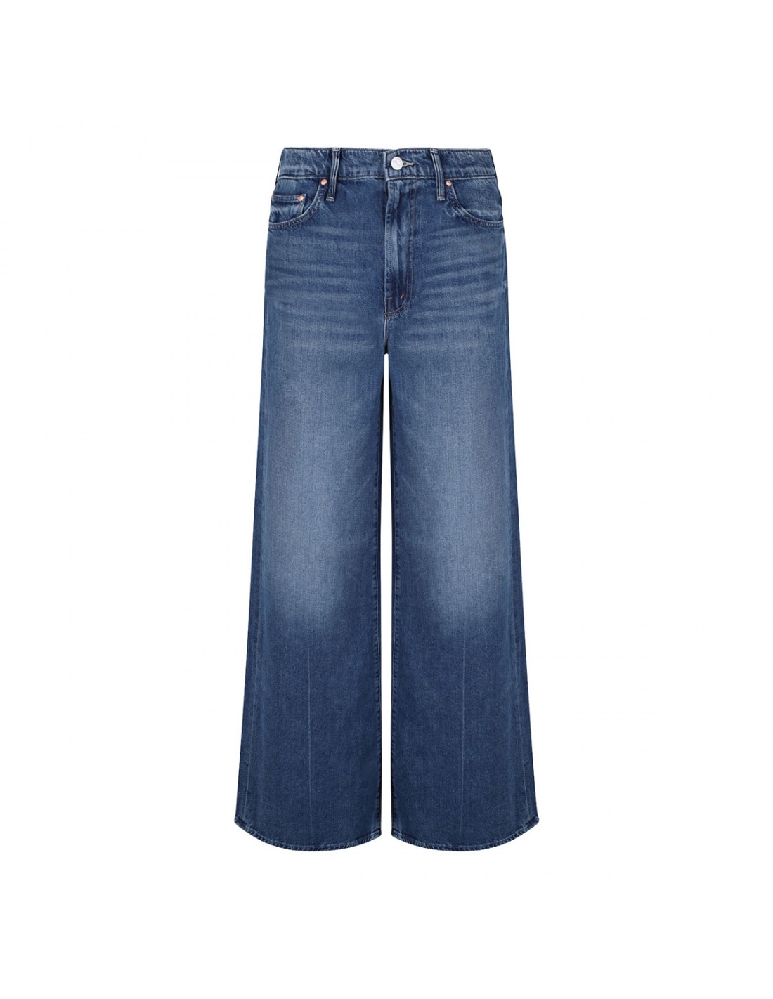 Mid-blue wash rigid superior denim The Undercover Sneak jeans from Mother featuring whiskering and fading at the knee, high rise, wide leg, clean hem, button closure and zip fly, belt loops on the waistband, classic five-pocket style, M logo embroidery on back.
