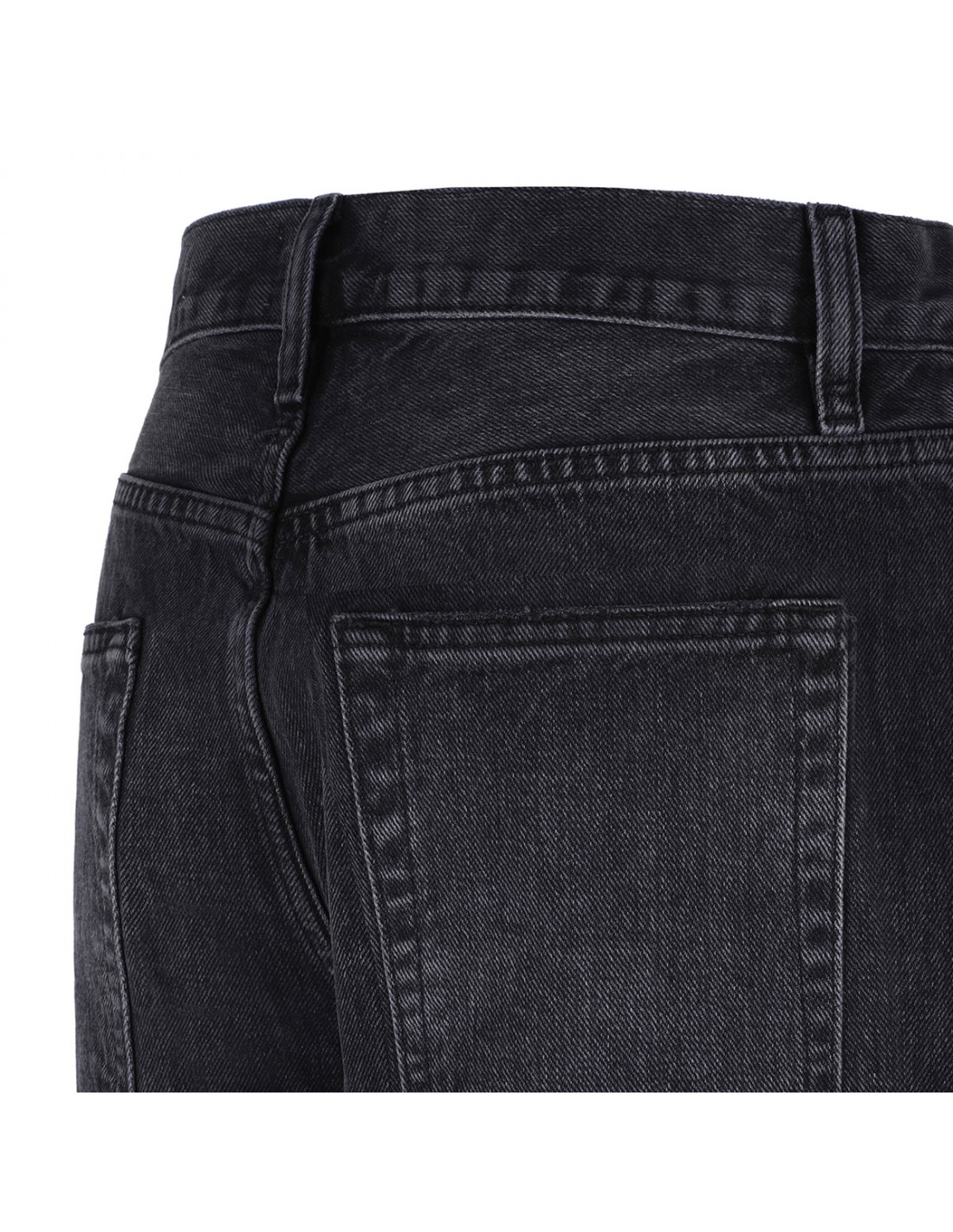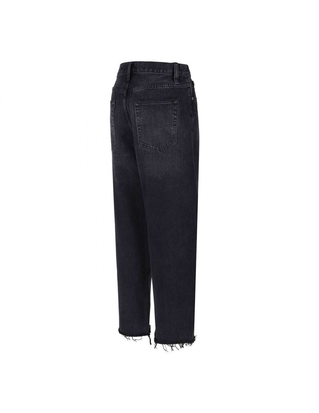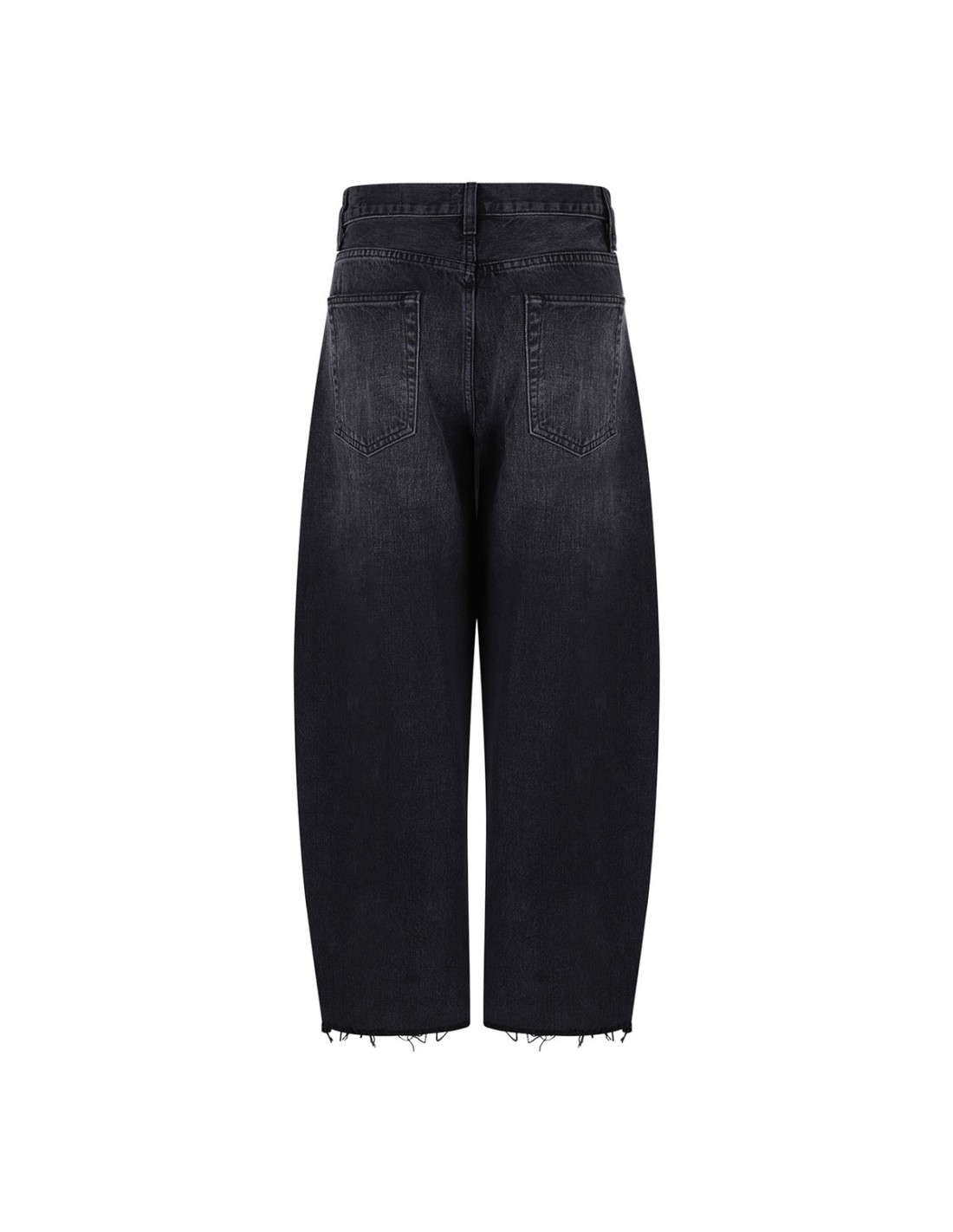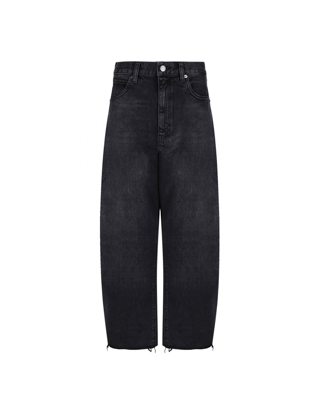Dark wash rigid denim The Bubble crop jeans from Frame featuring barrel silhouette, high rise, curved outseam for a bubble effect, cuffed bottom, ankle length, button closure and zip fly, belt loops on the waist band, classic five-pocket style, raw hem.