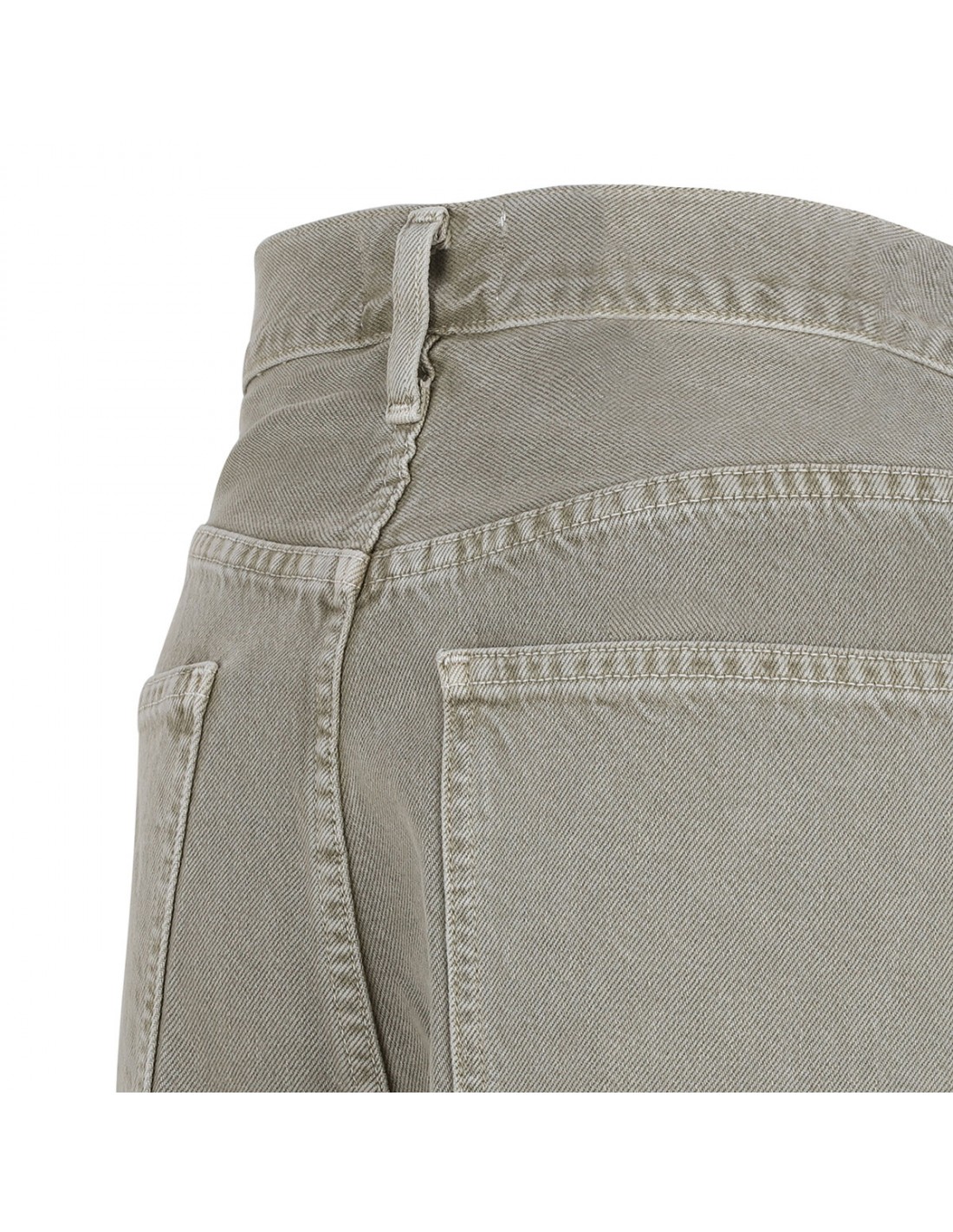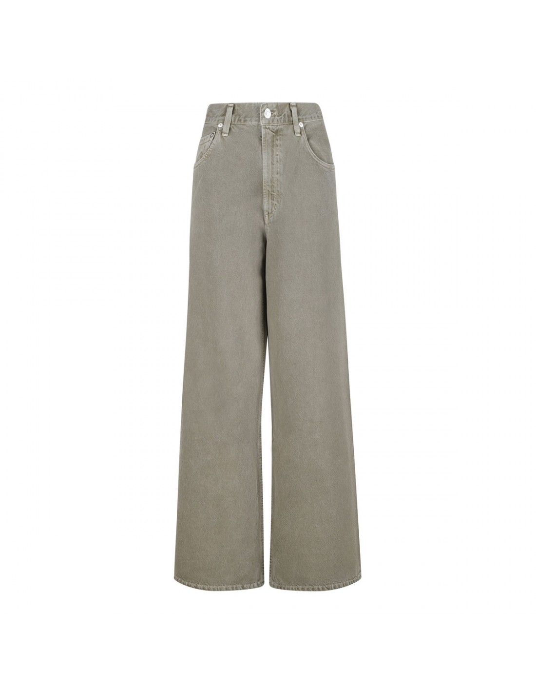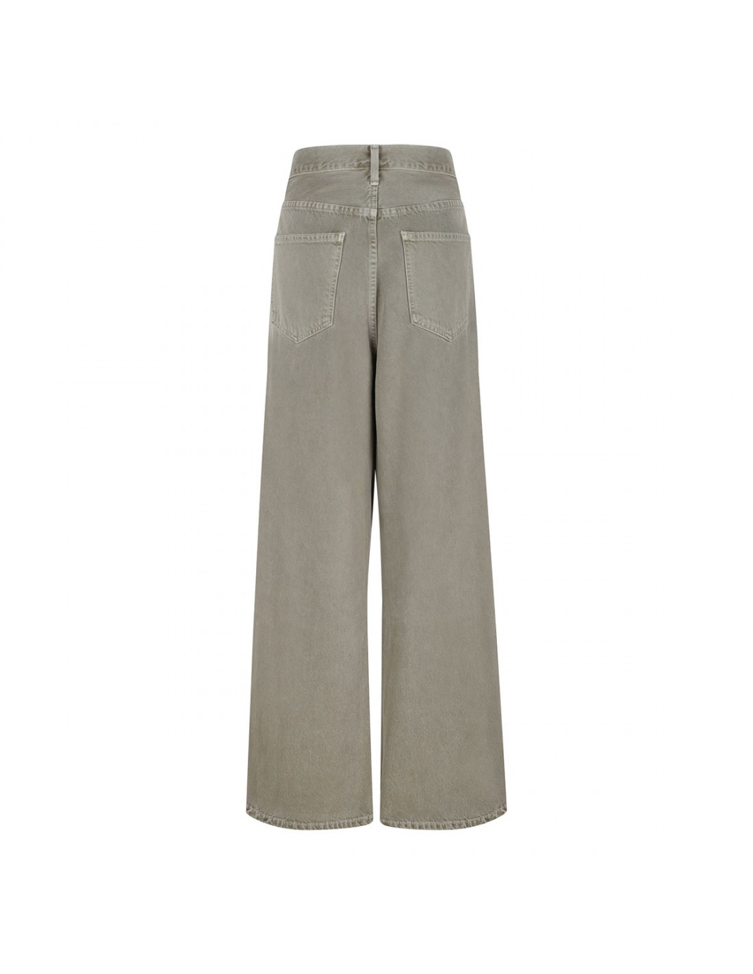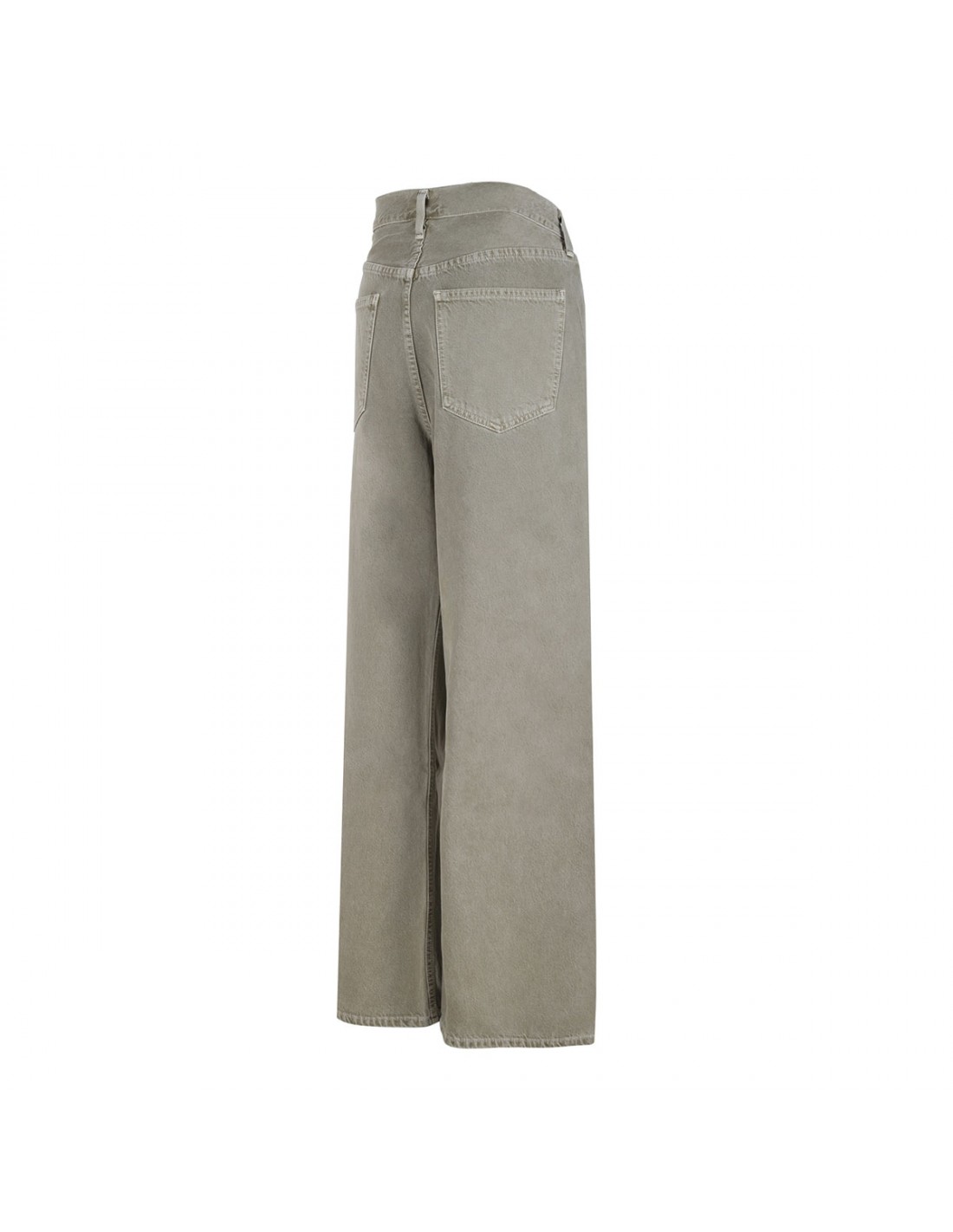 Light dusty sage denim rigid denim Low Curve jeans from Agolde featuring marbling effect, mid-rise, subtle curved outseam, wide leg, belt loops on the waistband, button closure, zip fly, classic five-pocket style.