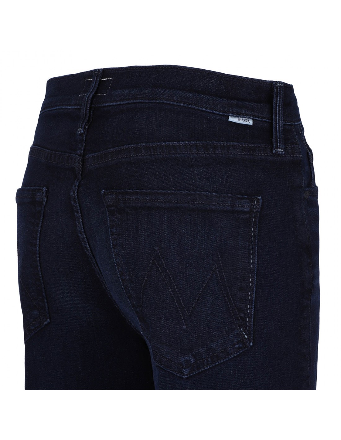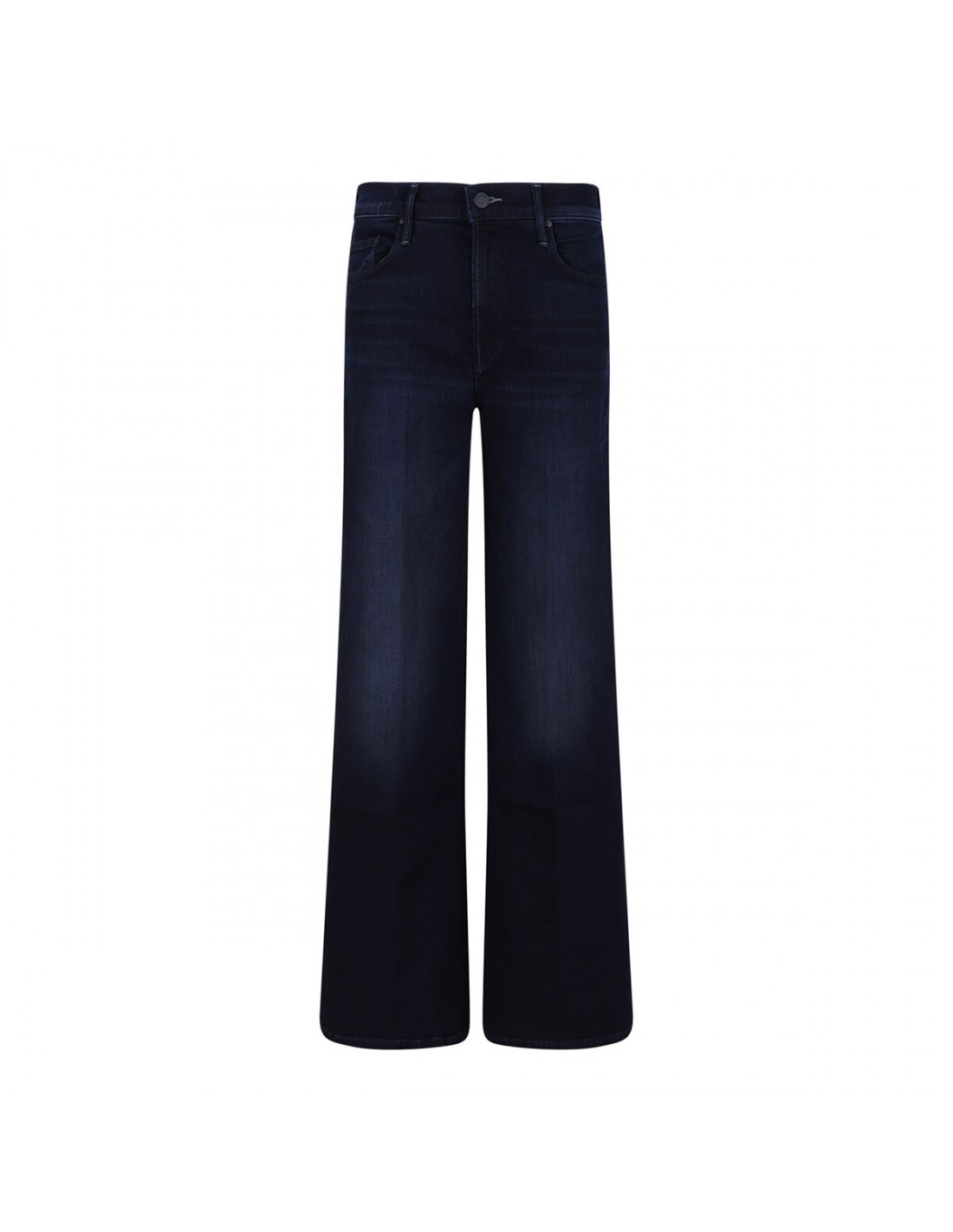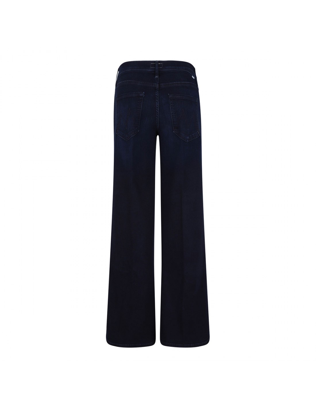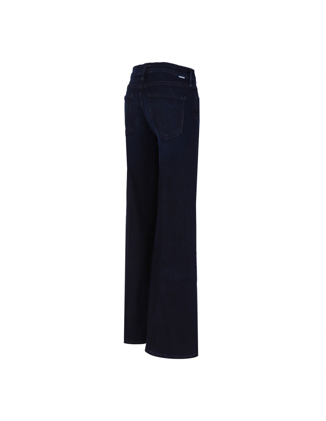Midnight blue slightly stretch denim The Twister Sneak jeans from Mother featuring subtle fading and whiskering, wide leg, high rise, clean hem, belt loops on the waistband, button closure, zip fly, classic five-pocket style, M logo embroidery on back.